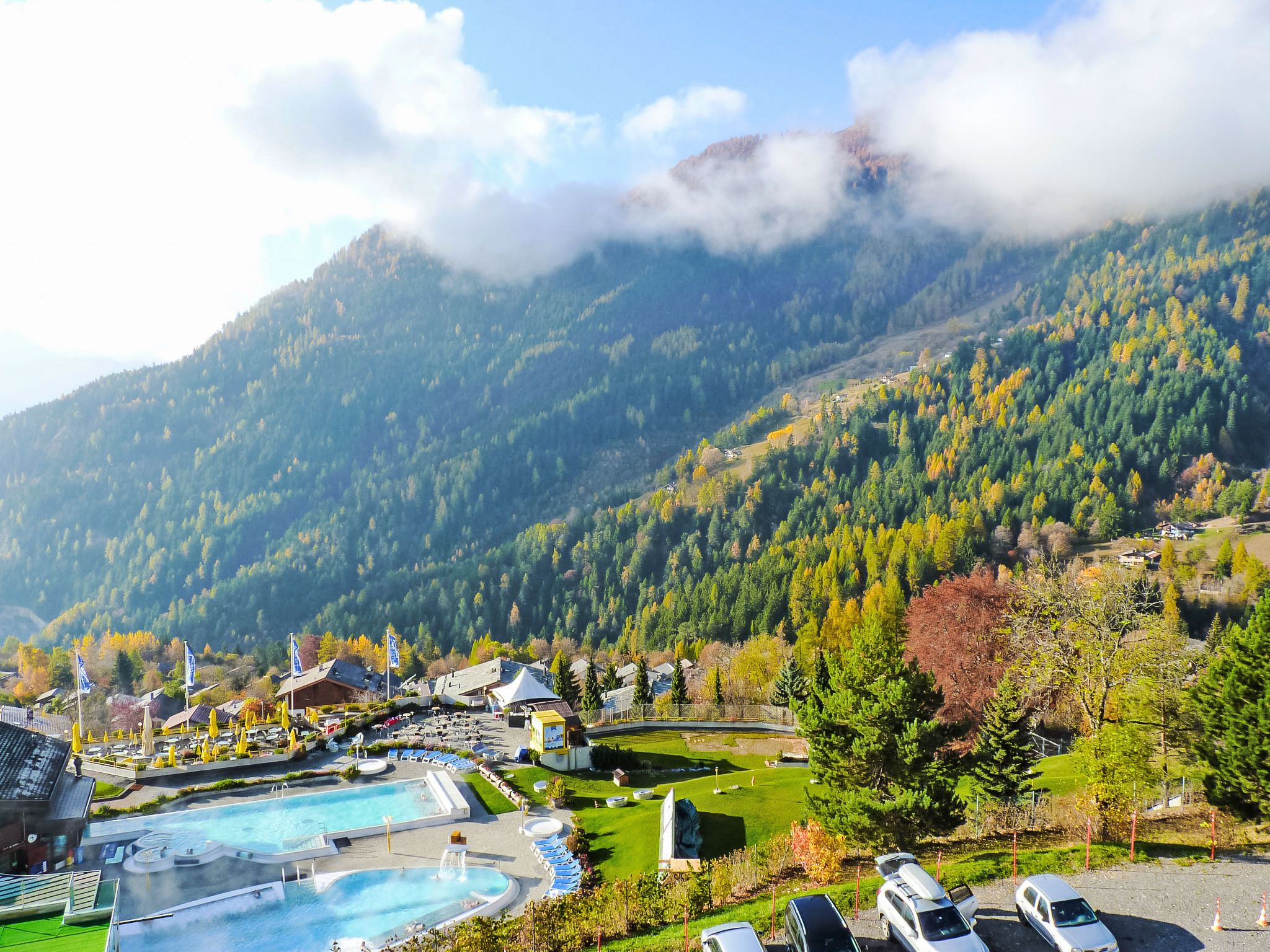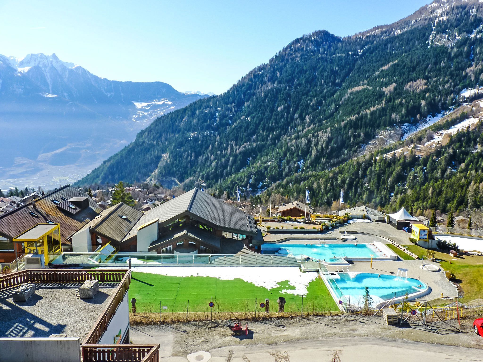 Centre thermal: Residenz Sources, Thermalies, Eaux-Vives, auf 3 Stockwerken. Im Ortsteil Mayen Blanc, ruhige, sonnige Lage, 1.5 km vom Skigebiet. Zur Mitbenutzung: Hallenbad (extra). In der Anlage: Restaurant, Bar, Frühstücksraum, Sauna, Fitnessraum, Massage, Dampfbad, Solarium, Sprudelbad (alles extra), Kiosk, Fahrstuhl, Skiraum, Zentralheizung, Waschmaschine (extra), Wäschetrockner (extra). Zufahrt bis zum Haus. Gemeinschaftsgarage. Einkaufsgeschäft, Bäckerei 900 m, Bushaltestelle 50 m, Thermalbad directement accessible 50 m. Golfplatz (18 Loch) 25 km, Tennis 1.8 km, Skibushaltestelle 50 m, Langlaufloipe 1.8 km. Bitte beachten: Babyausstattung auf Anfrage. Gratis Skibus. Der gratis Skibus fährt zum Skigebiet d'Ovronnaz. Bitte beachten: Weitere Unterkünfte sind buchbar. Ski-Einstellschrank in der Garage. Schließung des Thermalzentrums: 28. Oktober 2018 bis 21. Dezember 2018.