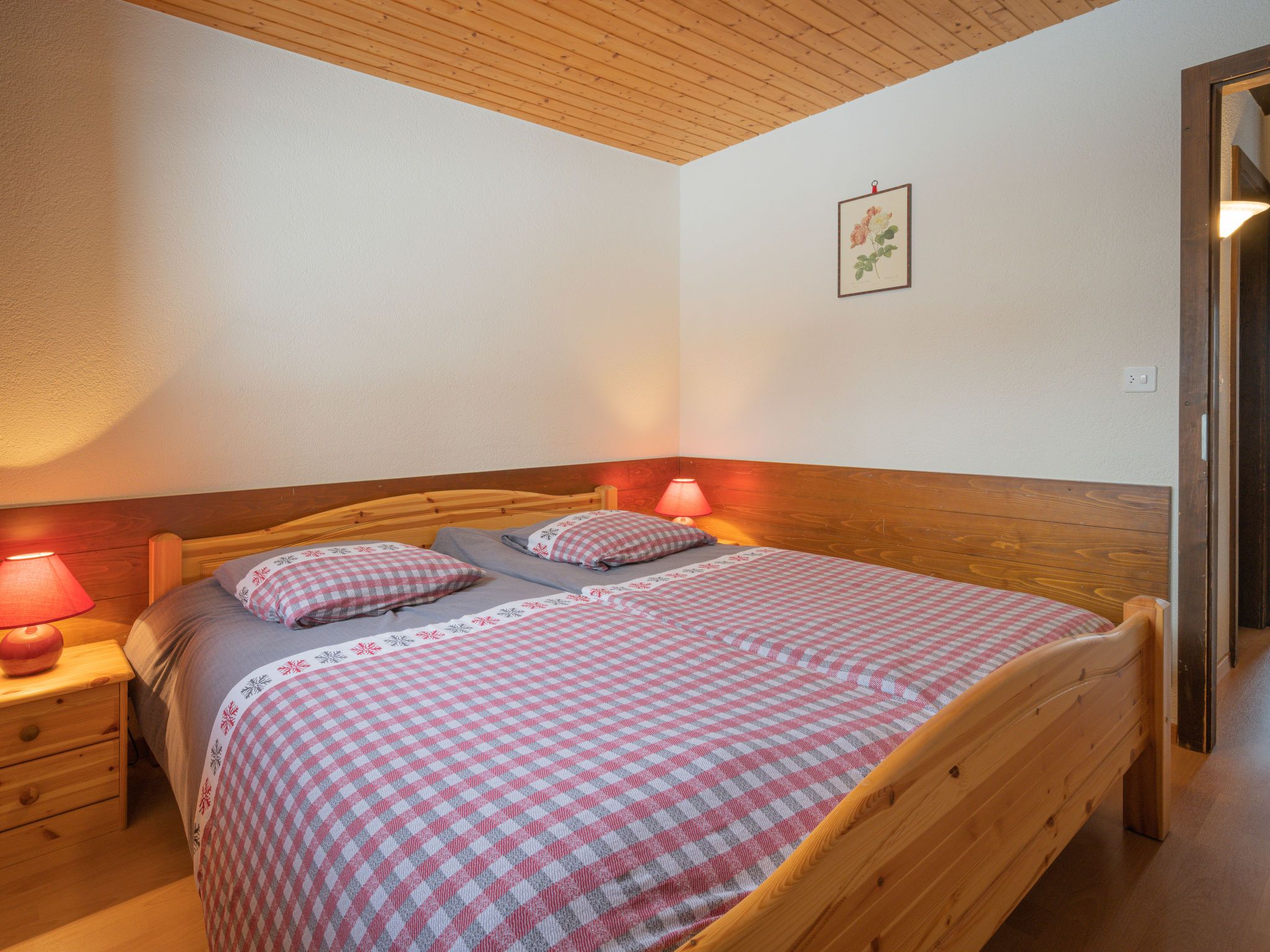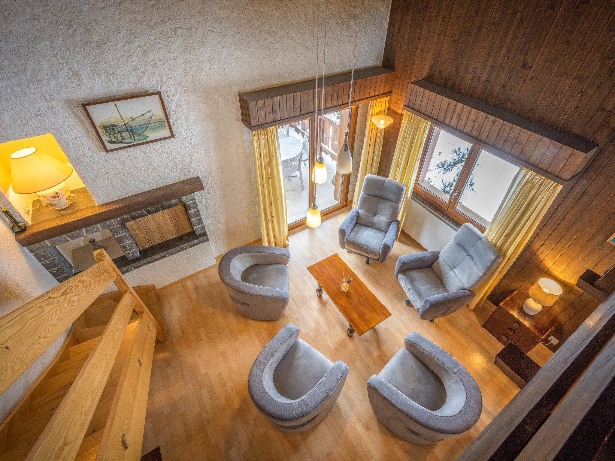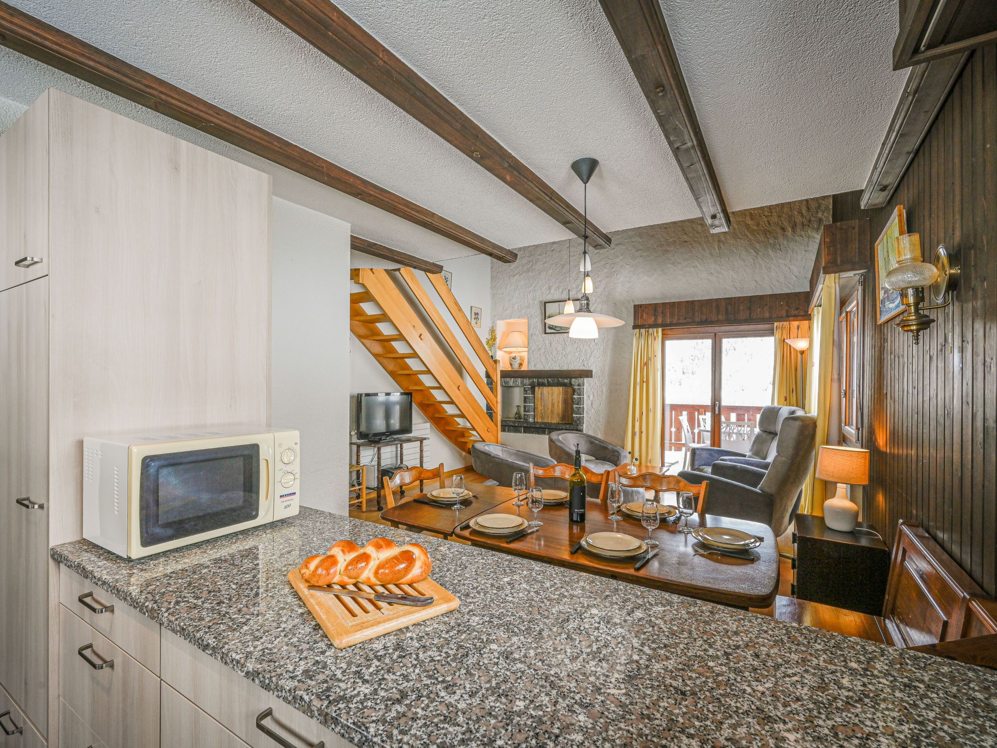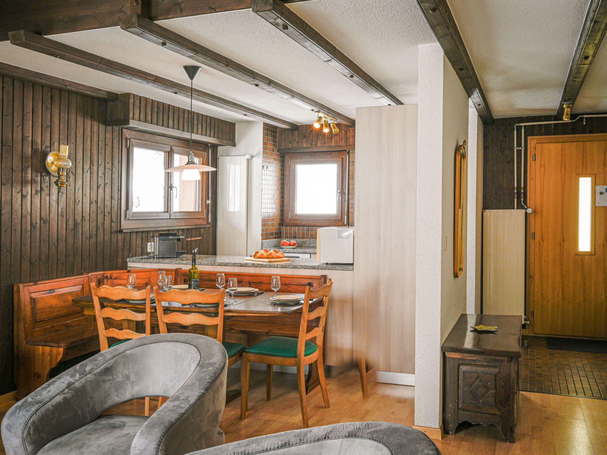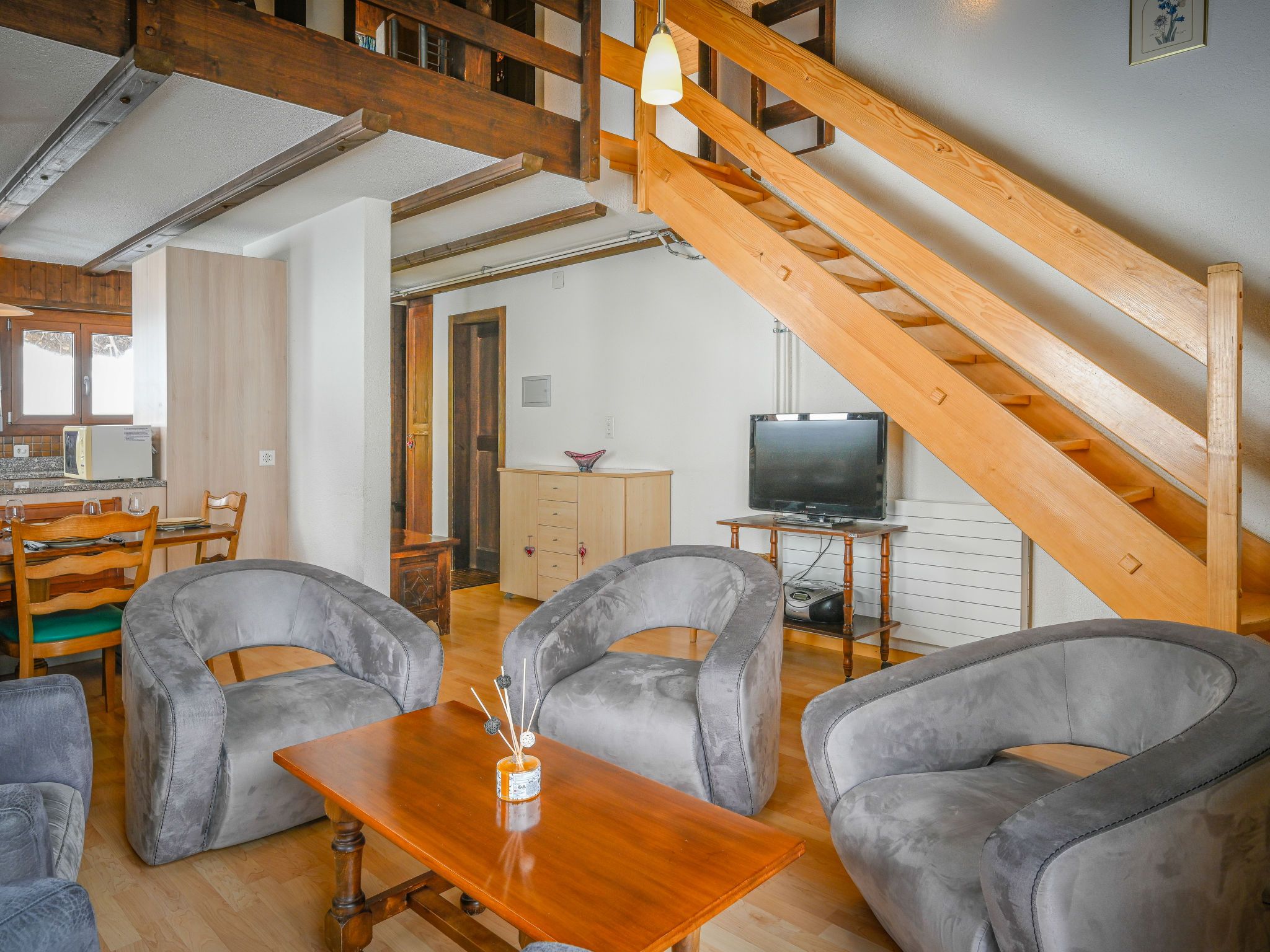 Jorasse C 20, 4-Zimmer-Wohnung 98 m2 auf 2 Stockwerken im 2. Stock, Südwestlage. Komfortabel und geschmackvoll eingerichtet: Eingang. Wohn-/Esszimmer mit Kabel-TV, Flachbildschirm, Radio und CD. Ausgang zum Balkon, Richtung Südwesten. Offene Küche (Backofen, Geschirrspüler, 4 Glaskeramikplatten, Toaster, Wasserkocher, Mikrowelle, elektrische Kaffeemaschine, Kapseln für die Kaffeemaschine (Nespresso) extra, Racletteofen, Fondue Set (Chinoise, Käse)). Dusche/WC. Obergeschoss: 1 Zimmer mit 1 Doppelbett (2 x 90 cm, Länge 200 cm). Ausgang zum Balkon, Richtung Südwesten. 1 Zimmer mit 1 Doppelbett (2 x 90 cm, Länge 200 cm). 1 Zimmer mit 2 Betten (90 cm, Länge 190 cm). Galerie. Dusche/WC. Balkon 10 m2, Südwestlage, kleiner Balkon 3 m2, Südwestlage. Terrassenmöbel, Liegestühle (2). Zur Verfügung: Babybett bis 2 Jahre, Haartrockner. Internet (Wireless LAN, gratis). Parkplatz. Bitte beachten: Nichtraucher-Unterkunft. Maximal 1 Haustier/Hund erlaubt. Anstelle eines abgeschlossenen Schlafzimmers befinden sich manche Schlafplätze in einem offenen Bereich (Galerie, Nische etc.).