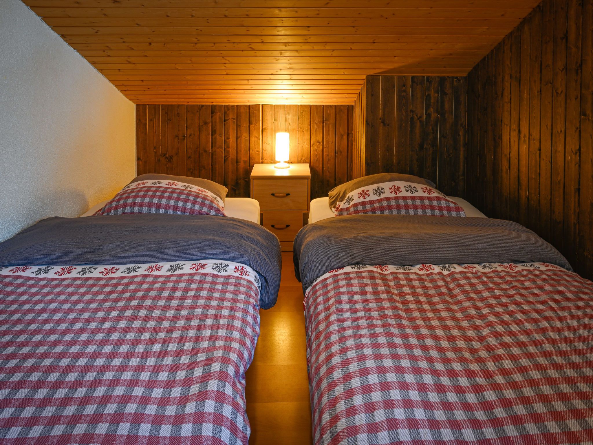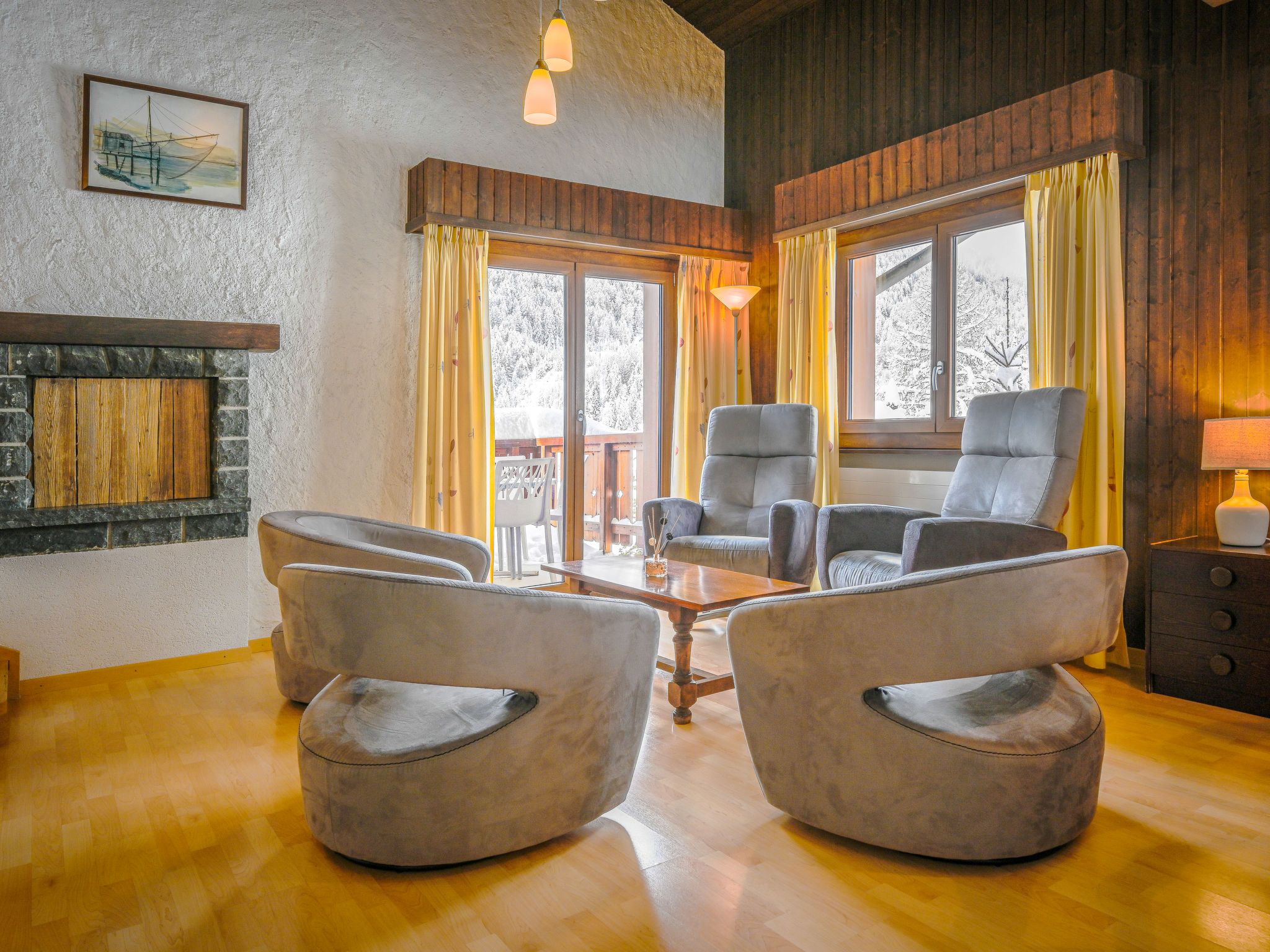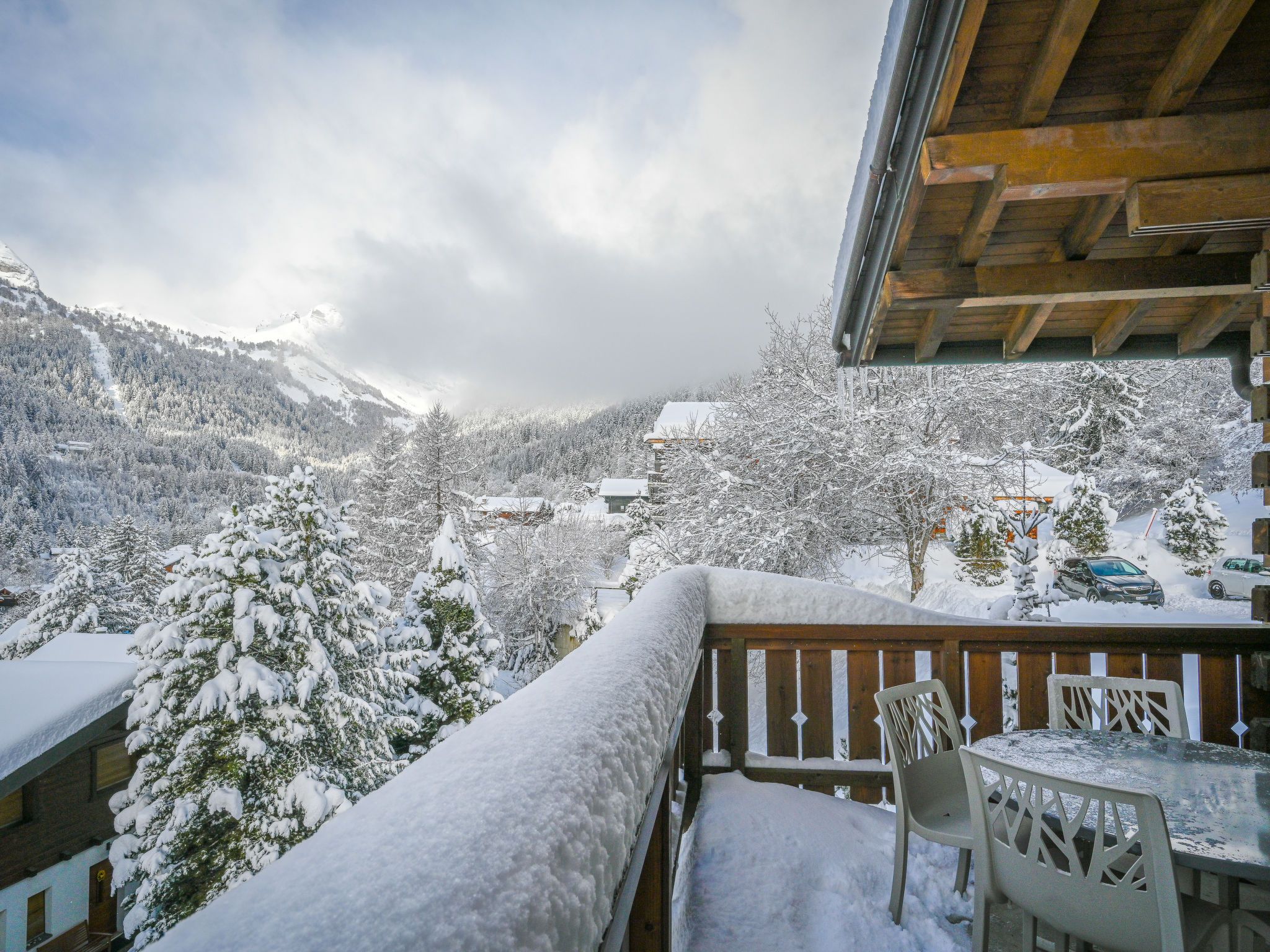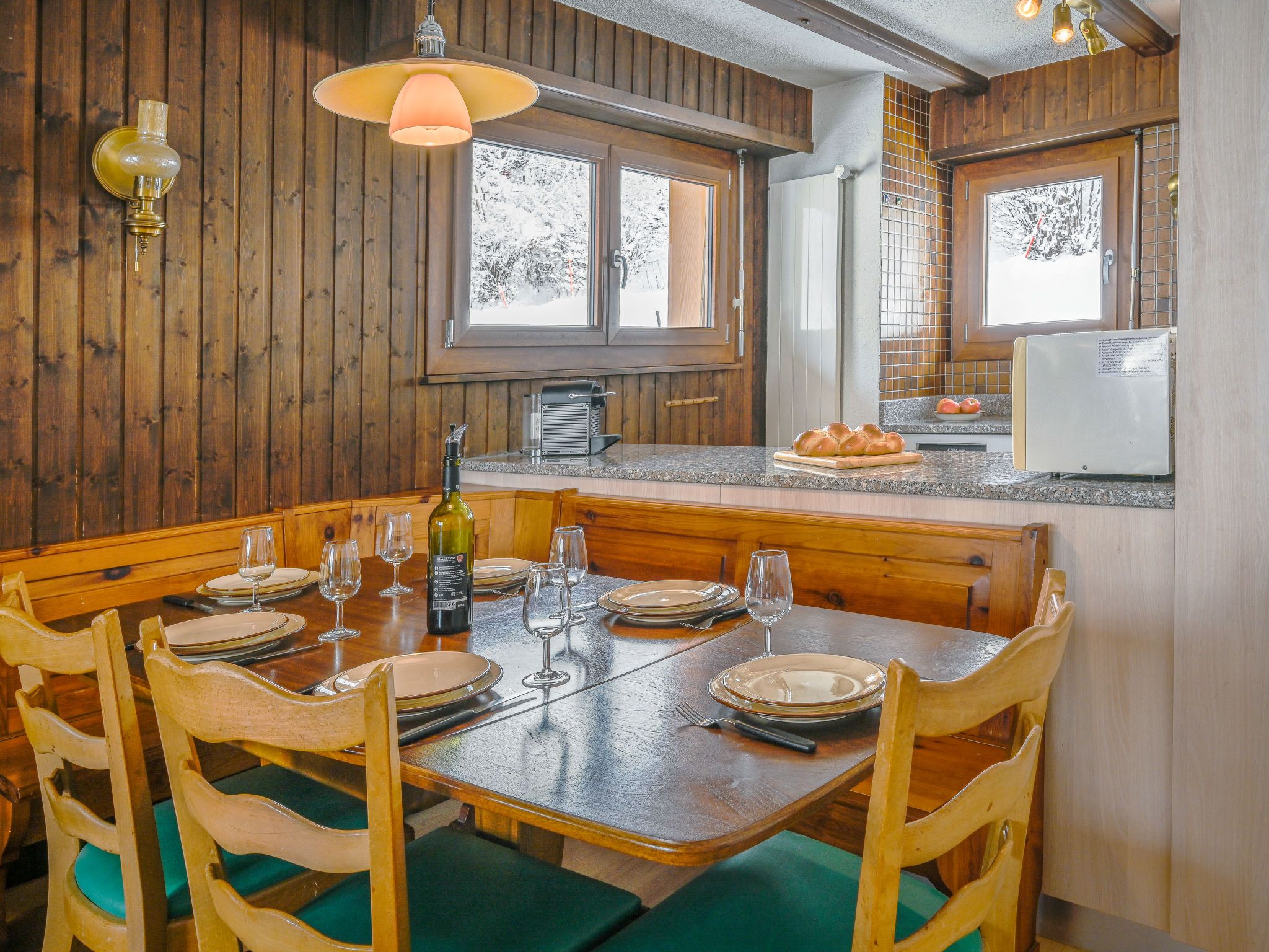 Jorasse C 20, 4-Zimmer-Wohnung 98 m2 auf 2 Stockwerken im 2. Stock, Südwestlage. Komfortabel und geschmackvoll eingerichtet: Eingang. Wohn-/Esszimmer mit Kabel-TV, Flachbildschirm, Radio und CD. Ausgang zum Balkon, Richtung Südwesten. Offene Küche (Backofen, Geschirrspüler, 4 Glaskeramikplatten, Toaster, Wasserkocher, Mikrowelle, elektrische Kaffeemaschine, Kapseln für die Kaffeemaschine (Nespresso) extra, Racletteofen, Fondue Set (Chinoise, Käse)). Dusche/WC. Obergeschoss: 1 Zimmer mit 1 Doppelbett (2 x 90 cm, Länge 200 cm). Ausgang zum Balkon, Richtung Südwesten. 1 Zimmer mit 1 Doppelbett (2 x 90 cm, Länge 200 cm). 1 Zimmer mit 2 Betten (90 cm, Länge 190 cm). Galerie. Dusche/WC. Balkon 10 m2, Südwestlage, kleiner Balkon 3 m2, Südwestlage. Terrassenmöbel, Liegestühle (2). Zur Verfügung: Babybett bis 2 Jahre, Haartrockner. Internet (Wireless LAN, gratis). Parkplatz. Bitte beachten: Nichtraucher-Unterkunft. Maximal 1 Haustier/Hund erlaubt. Anstelle eines abgeschlossenen Schlafzimmers befinden sich manche Schlafplätze in einem offenen Bereich (Galerie, Nische etc.).