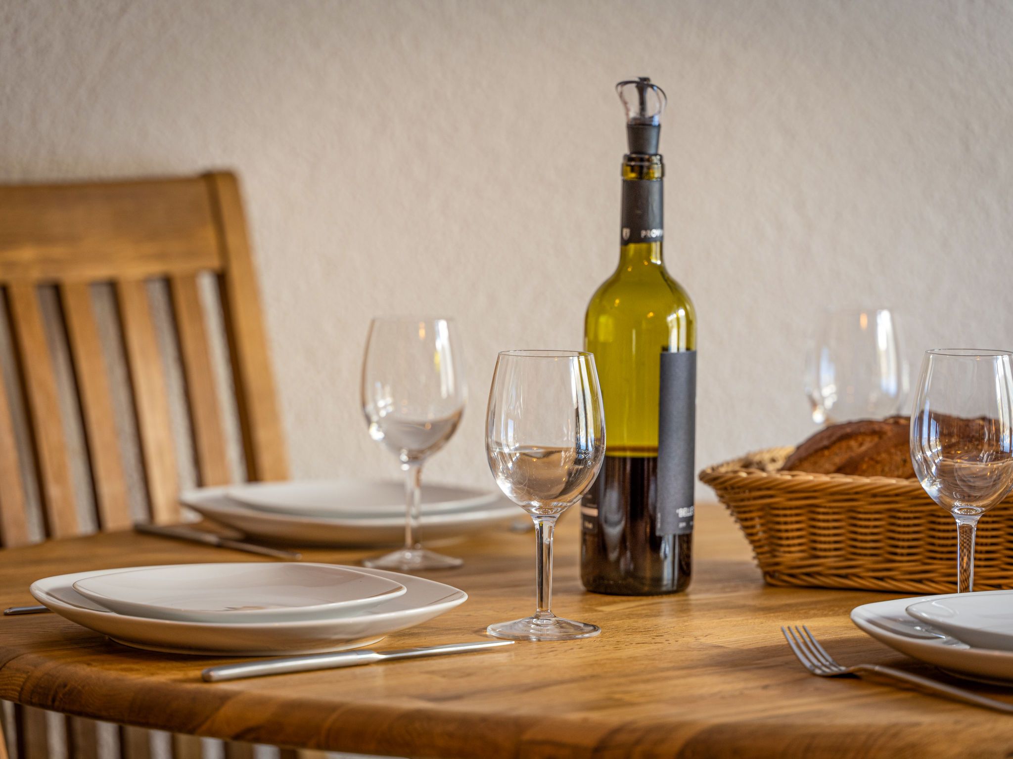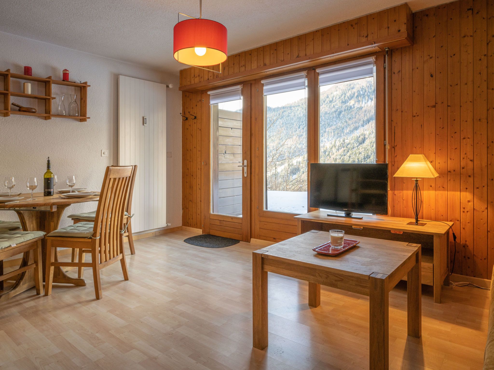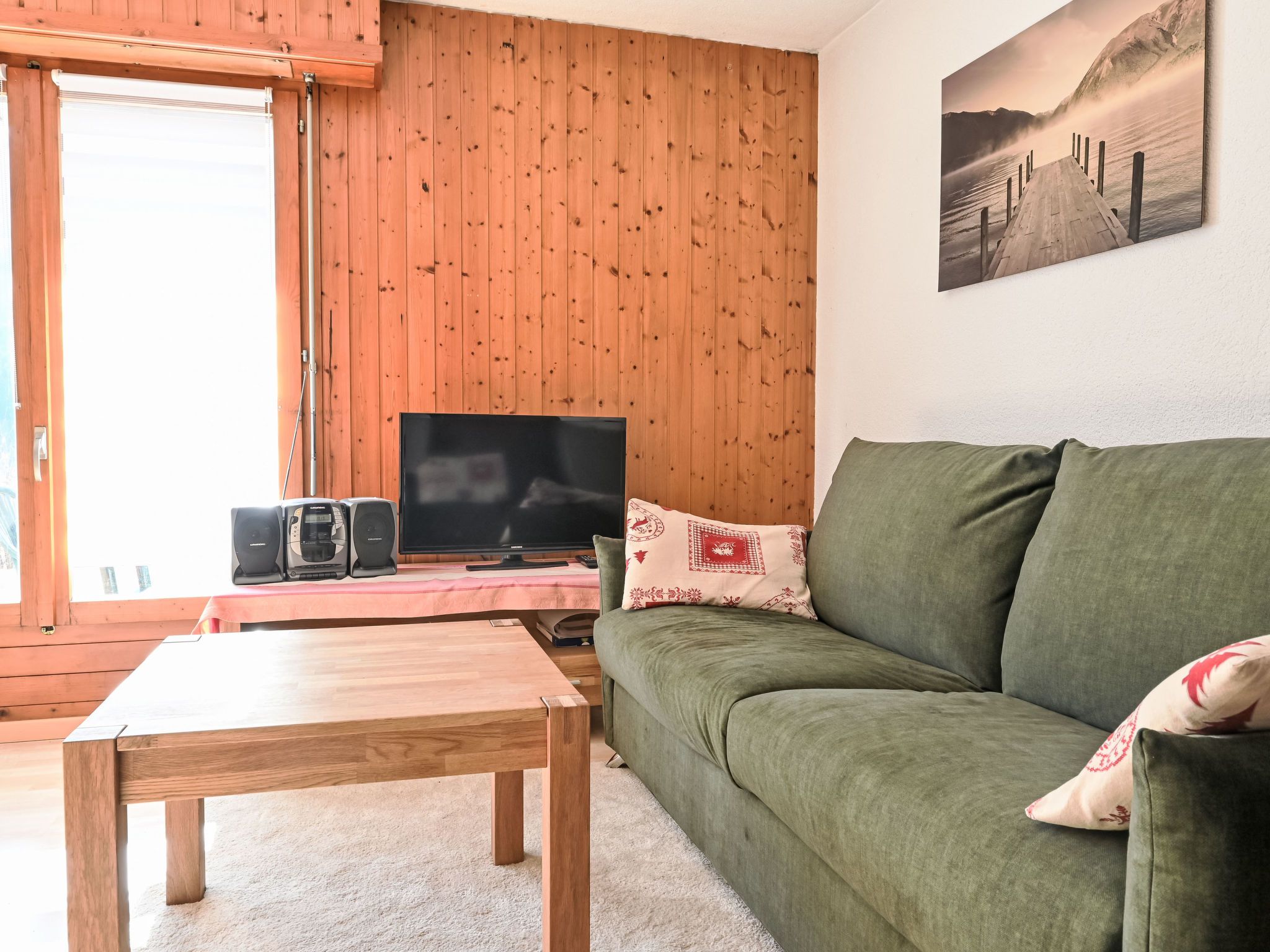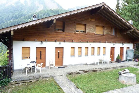 Jorasse A 1, 2-Zimmer-Wohnung im Erdgeschoss, Südwestlage. Objekt geeignet für 2 Erwachsene + 2 Kinder. Komfortabel eingerichtet: Wohn-/Esszimmer mit 1 Doppeldiwanbett (1 x 140 cm, Länge 190 cm), Esstisch und TV. Ausgang zur Terrasse. 1 Zimmer mit 2 Betten. Ausgang zur Terrasse. Küche (3 Kochplatten, Backofen, Geschirrspüler, elektrische Kaffeemaschine). Dusche/WC. Terrasse, Rasen. Terrassenmöbel. Schöne Sicht auf die Berge. Zur Verfügung: Internet (Wireless LAN, gratis). Parkplatz Nr. 1. Bitte beachten: Nichtraucher-Unterkunft.