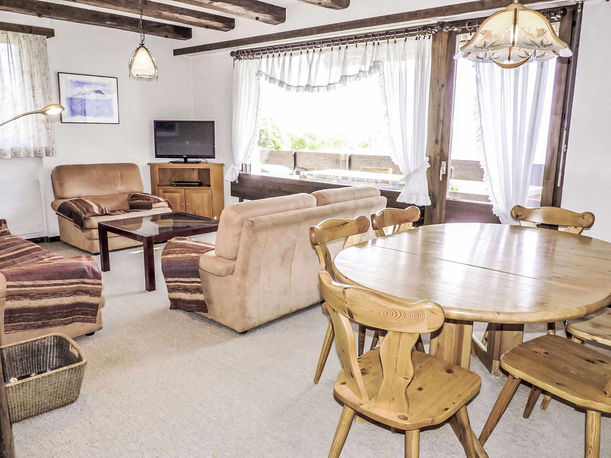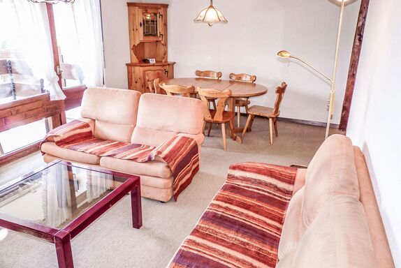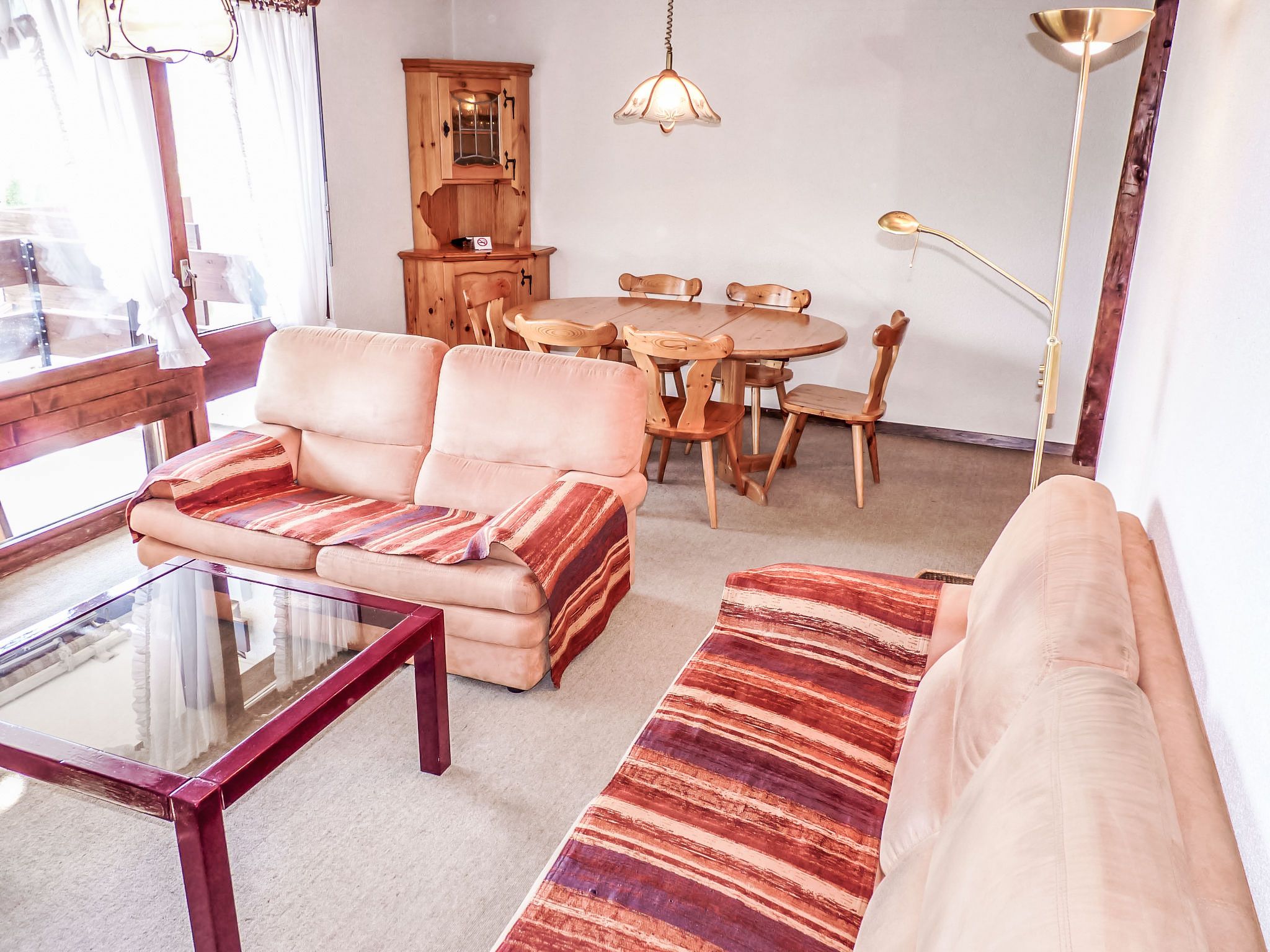 Grande-Garde 6, 3-Zimmer-Wohnung 76 m2 im 1. Stock, Südostlage. Komfortabel und geschmackvoll eingerichtet: Eingang. Wohn-/Esszimmer mit 1 Diwanbett (160 cm), Kabel-TV, Radio und DVD. Ausgang zum Balkon. 1 Zimmer mit 1 franz. Bett (1 x 160 cm). 1 Zimmer mit 2 Betten (90 cm, Länge 180 cm). Küche (Backofen, Geschirrspüler, 4 Glaskeramikplatten, Mikrowelle, elektrische Kaffeemaschine, Kapseln für die Kaffeemaschine (Delizio) extra). Bad/WC. Balkon. Terrassenmöbel, Liegestühle. Sehr schöne Sicht auf die Berge und das Tal. Zur Verfügung: Bügeleisen, Haartrockner. Garage Nr. 6. Bitte beachten: Nichtraucher-Unterkunft.