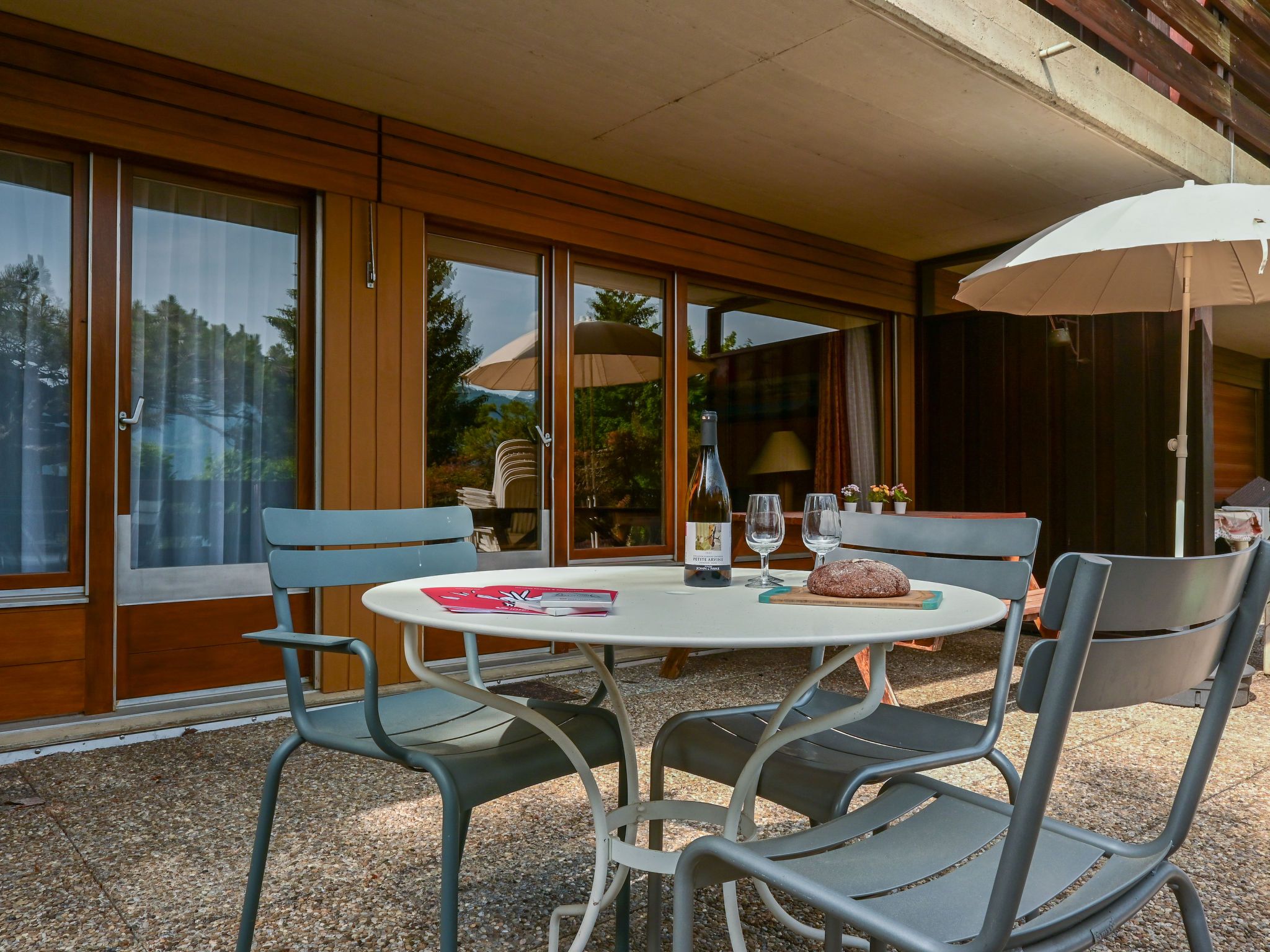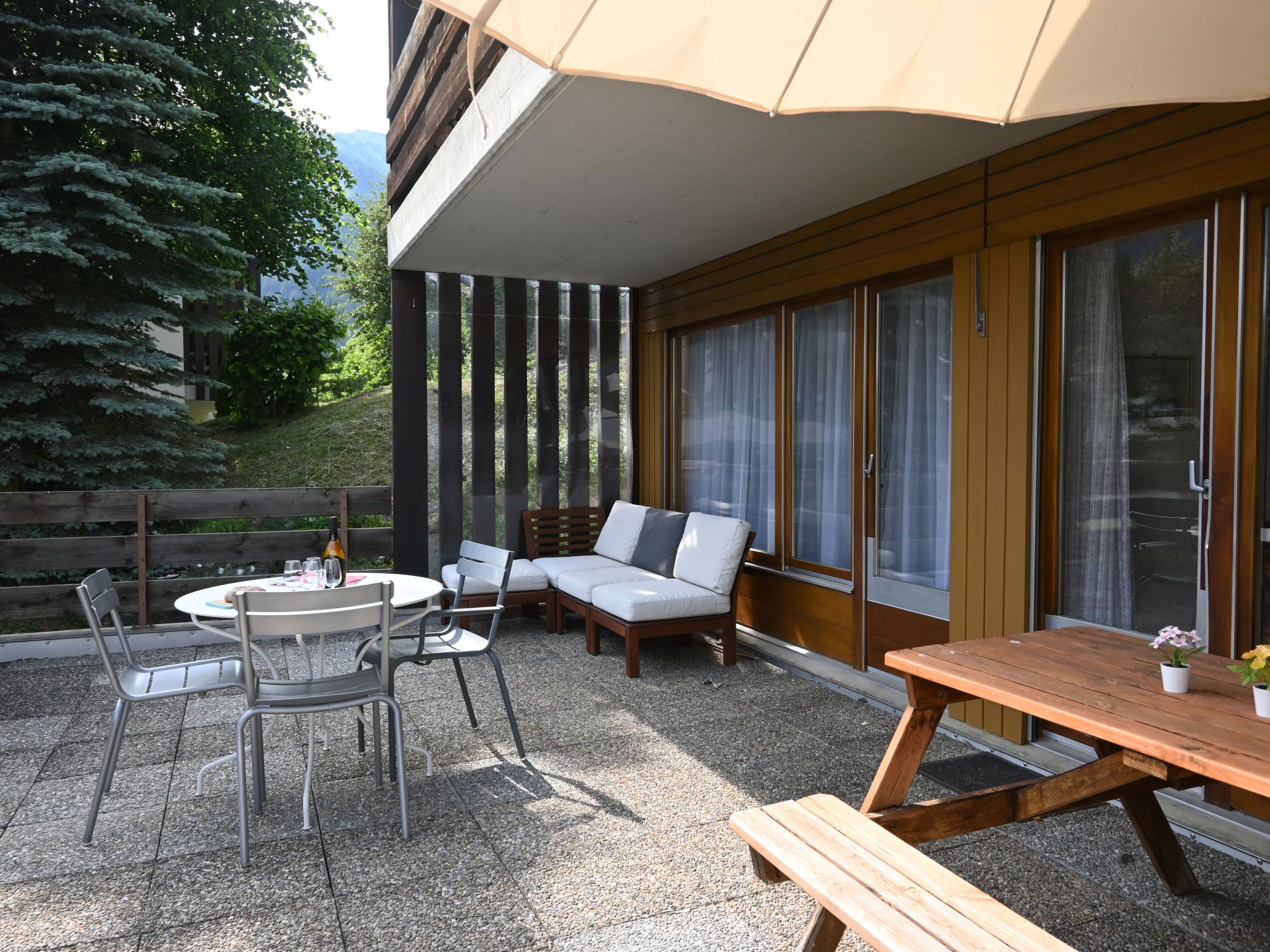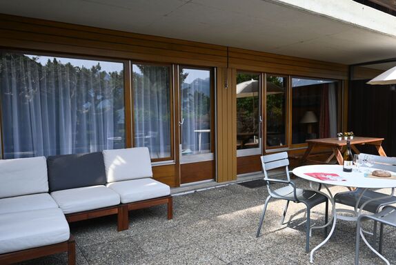 Centaure B RI 1, 3-Zimmer-Wohnung 80 m2, im Erdgeschoss, Südlage. Geräumig, zweckmässig und komfortabel eingerichtet: Eingang. Grosses Wohn-/Esszimmer mit 1 Doppeldiwanbett (2 x 80 cm, Länge 160 cm), Flachbildschirm. Ausgang zur Terrasse, Richtung Süden. 1 Zimmer mit 1 Doppelbett (2 x 80 cm, Länge 200 cm). Ausgang zur Terrasse, Richtung Süden. 1 Zimmer mit 1 Doppelbett (2 x 80 cm, Länge 200 cm). Kleine, offene Küche (4 Kochplatten, Toaster, Wasserkocher, elektrische Kaffeemaschine, Kapseln für die Kaffeemaschine (Nespresso) extra, Racletteofen, Fondue Set (Käse)). Bad/WC, sep. WC. Grosse Terrasse 35 m2, Südlage. Terrassenmöbel. Sicht auf die Berge. Zur Verfügung: Waschmaschine (extra). Wäschetrockner (extra), Bügeleisen, Babybett, Haartrockner. Garage Nr. RI 1 (1 Auto), Höhe 185 cm, Breite 360 cm. Bitte beachten: geeignet für Familien. Nichtraucher-Unterkunft.