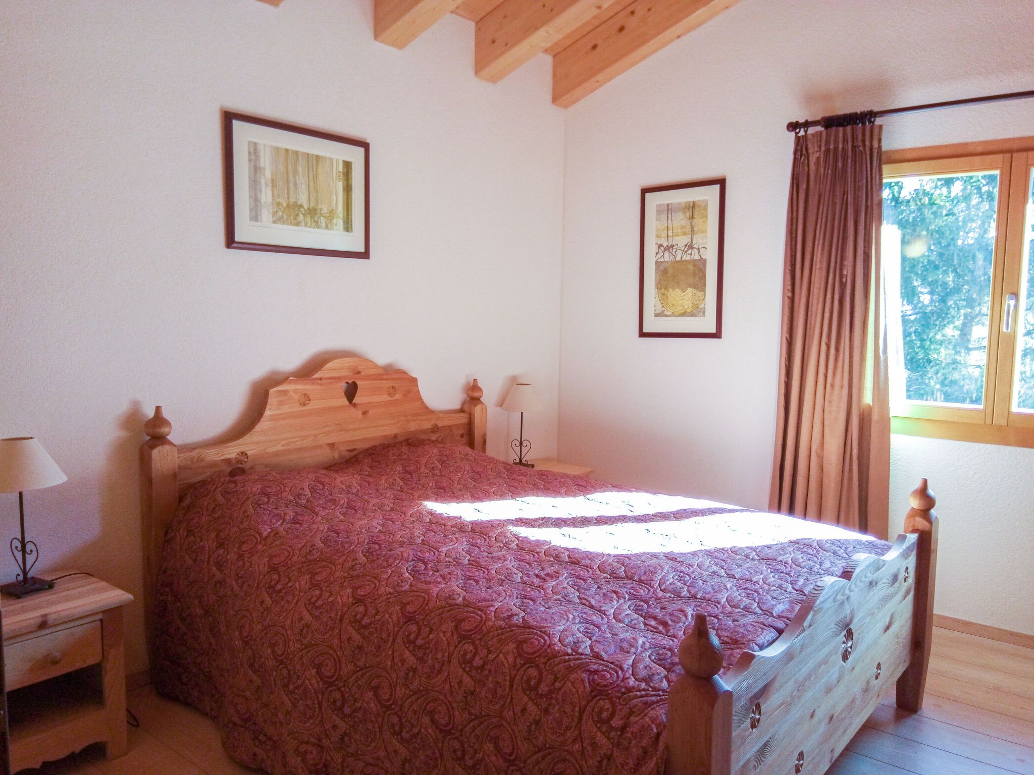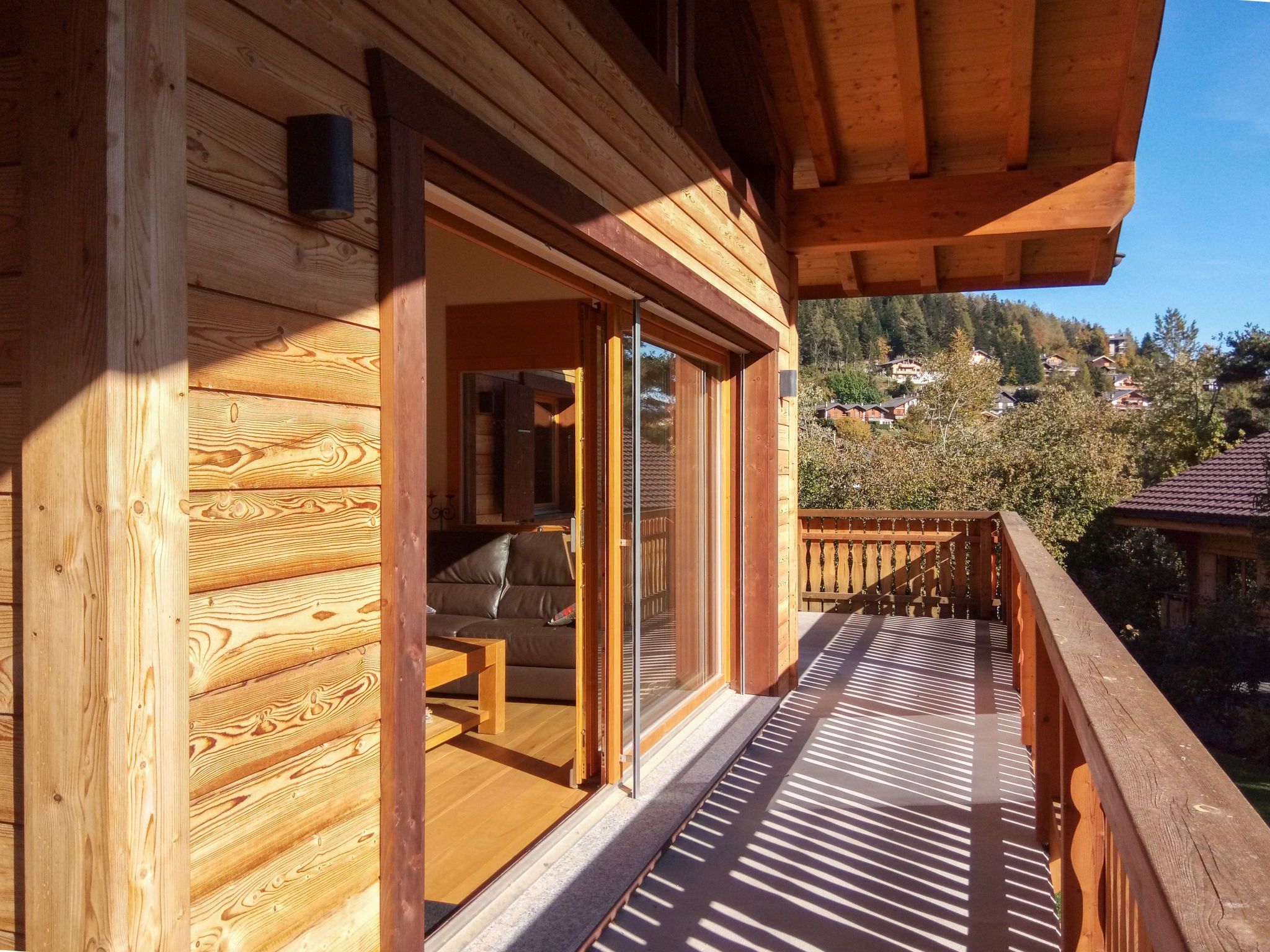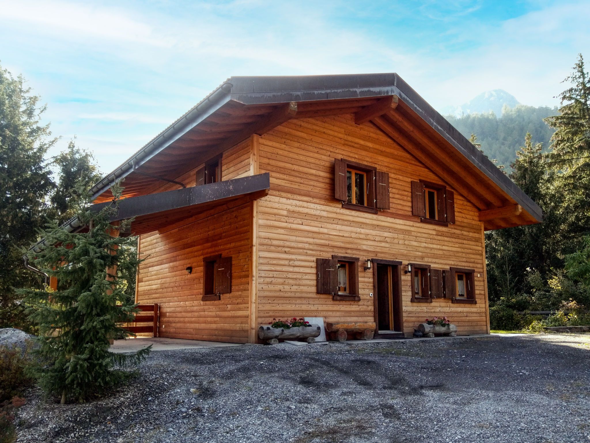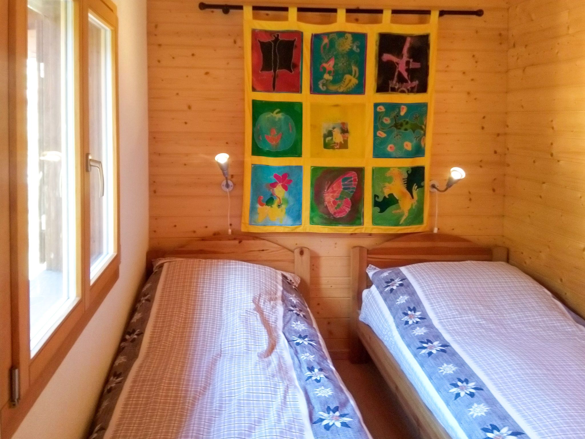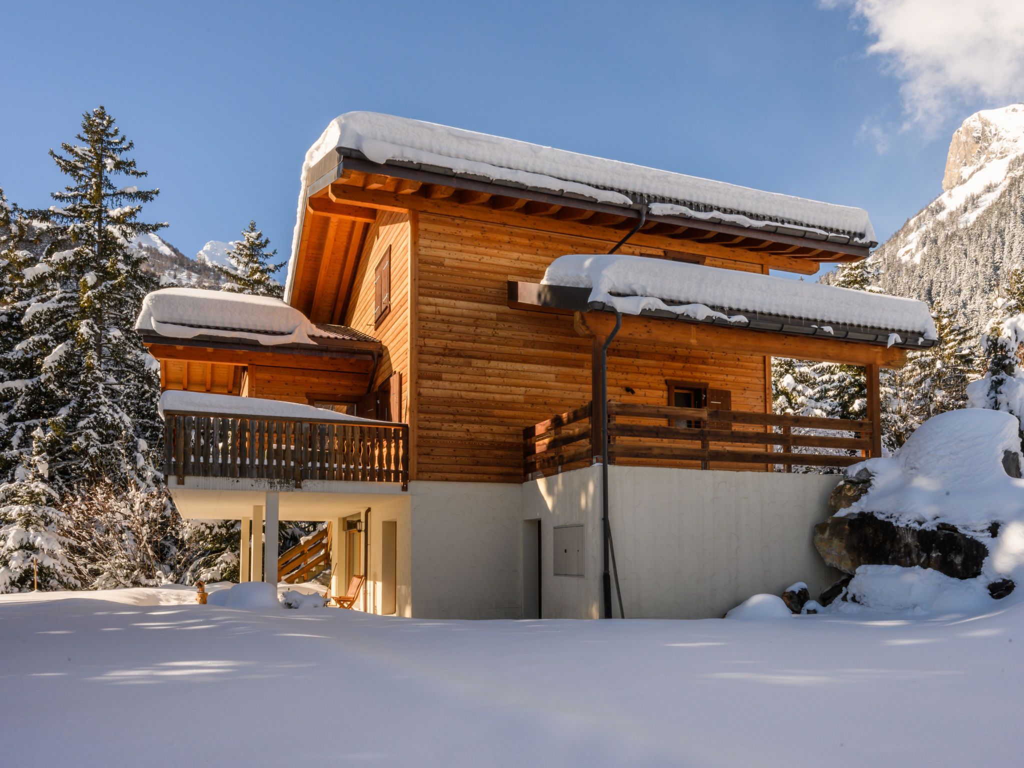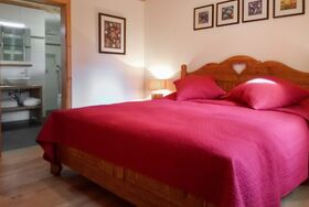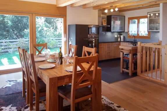 Banksia, 5-Zimmer-Chalet 180 m2 auf 2 Stockwerken im 2. Stock, Südostlage. Geräumig, komfortabel und geschmackvoll eingerichtet: Eingang. Grosses Wohn-/Esszimmer mit Panoramafenster mit Kabel-TV, Flachbildschirm, DVD und Holzofen. Ausgang zum Balkon, zur Terrasse, Richtung Südosten. 1 Zimmer mit 1 franz. Bett (180 cm, Länge 200 cm), sep. WC, Dusche, Doppelwaschbecken und mit Eckbadewanne. Offene Küche (Geschirrspüler, 4 Induktionskochplatten, Mikrowelle, elektrische Kaffeemaschine, Kapseln für die Kaffeemaschine (NESPRESSO) extra, Racletteofen, Fondue Set (Chinoise, Käse)). Obergeschoss: 1 Zimmer mit 1 franz. Bett (180 cm, Länge 200 cm). 1 Zimmer mit 2 Betten (90 cm, Länge 200 cm). 1 Zimmer mit 2 Betten (90 cm, Länge 200 cm). Dusche/WC, Doppelwaschbecken. Balkon 23 m2, Südostlage, Terrasse 15 m2, Westlage. Terrassenmöbel. Schöne Sicht auf die Berge und die Ortschaft. Zur Verfügung: Waschmaschine, Wäschetrockner, Babybett bis 3 Jahre. Internet (WLAN, gratis). Parkplatz (überdacht, 1 Auto) beim Haus. Bitte beachten: geeignet für Familien. Nichtraucher-Unterkunft.