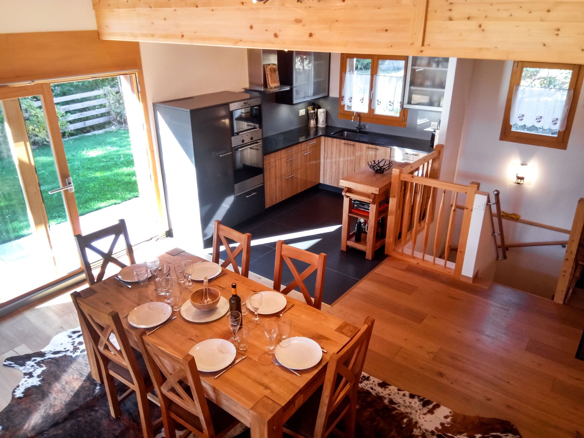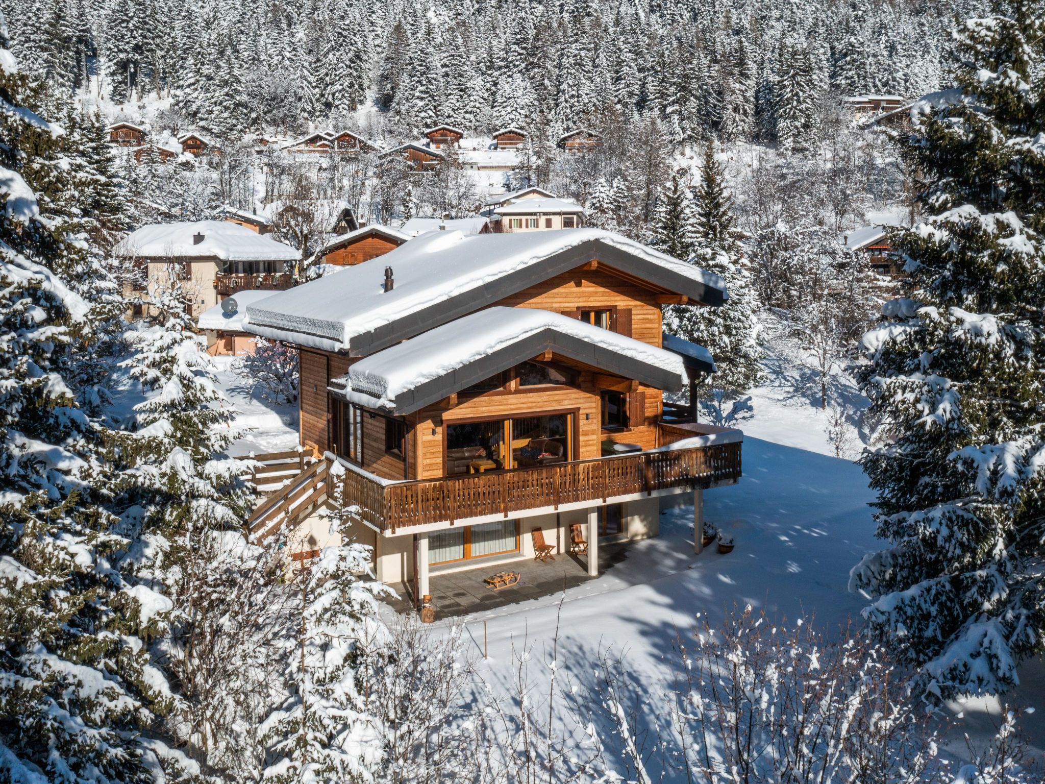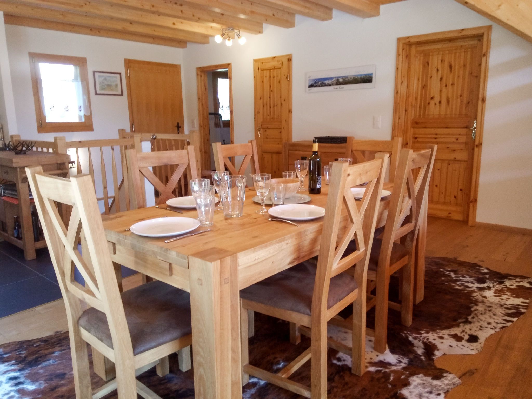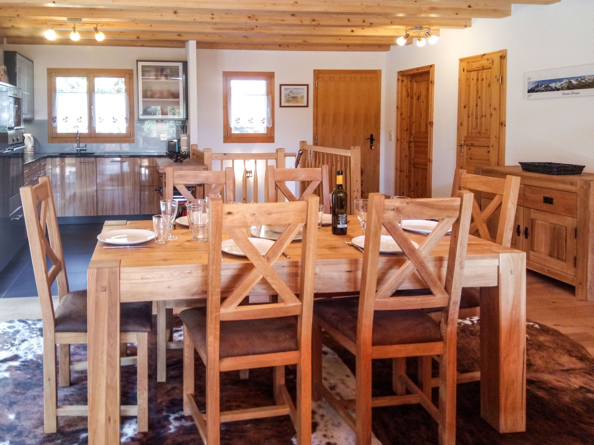 Banksia, 5-Zimmer-Chalet 180 m2 auf 2 Stockwerken im 2. Stock, Südostlage. Geräumig, komfortabel und geschmackvoll eingerichtet: Eingang. Grosses Wohn-/Esszimmer mit Panoramafenster mit Kabel-TV, Flachbildschirm, DVD und Holzofen. Ausgang zum Balkon, zur Terrasse, Richtung Südosten. 1 Zimmer mit 1 franz. Bett (180 cm, Länge 200 cm), sep. WC, Dusche, Doppelwaschbecken und mit Eckbadewanne. Offene Küche (Geschirrspüler, 4 Induktionskochplatten, Mikrowelle, elektrische Kaffeemaschine, Kapseln für die Kaffeemaschine (NESPRESSO) extra, Racletteofen, Fondue Set (Chinoise, Käse)). Obergeschoss: 1 Zimmer mit 1 franz. Bett (180 cm, Länge 200 cm). 1 Zimmer mit 2 Betten (90 cm, Länge 200 cm). 1 Zimmer mit 2 Betten (90 cm, Länge 200 cm). Dusche/WC, Doppelwaschbecken. Balkon 23 m2, Südostlage, Terrasse 15 m2, Westlage. Terrassenmöbel. Schöne Sicht auf die Berge und die Ortschaft. Zur Verfügung: Waschmaschine, Wäschetrockner, Babybett bis 3 Jahre. Internet (WLAN, gratis). Parkplatz (überdacht, 1 Auto) beim Haus. Bitte beachten: geeignet für Familien. Nichtraucher-Unterkunft.