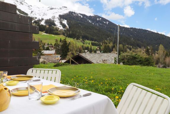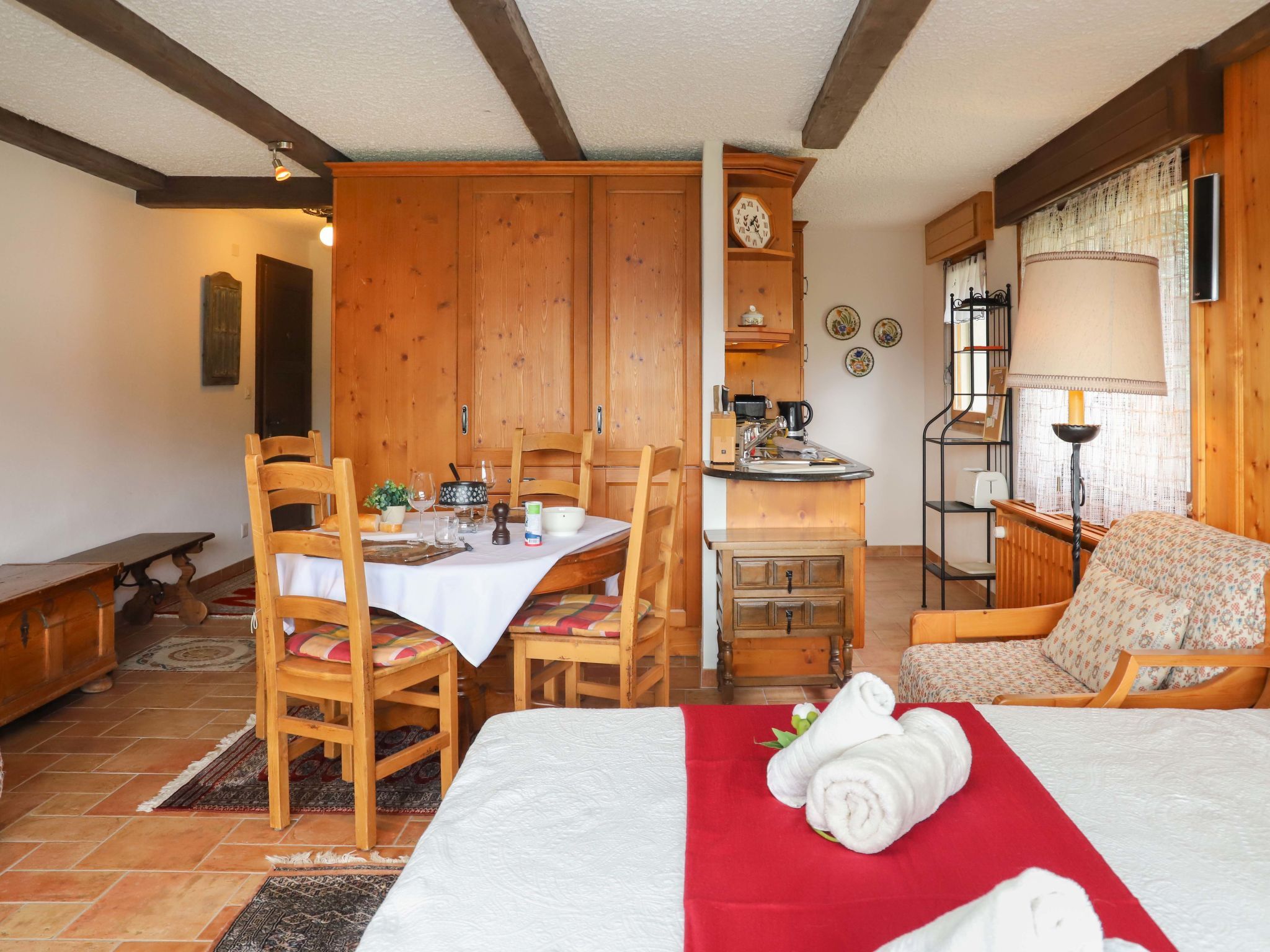 Courtillière 4, 1-Zimmer-Wohnung 40 m2, im Erdgeschoss, Südlage. Zweckmässig und schön eingerichtet: grosses Wohn-/Esszimmer mit 1 Doppeldiwanbett (1 x 160 cm, Länge 200 cm). Ausgang zum Garten, Richtung Süden und Richtung Osten. Kochnische (Backofen, Geschirrspüler, Mikrowelle, elektrische Kaffeemaschine, Kapseln für die Kaffeemaschine (Nespesso) extra, Racletteofen, Fondue Set (Käse)). Dusche/WC. Grosser Garten 60 m2, Südlage und Ostlage. Balkonmöbel, Liegestühle. Schöne Sicht auf die Berge und die Skipiste. Zur Verfügung: Internet (Wireless LAN). Garage Nr. 19, 014 beim Haus. Bitte beachten: Nichtraucher-Unterkunft, Nichtraucher-Haus.