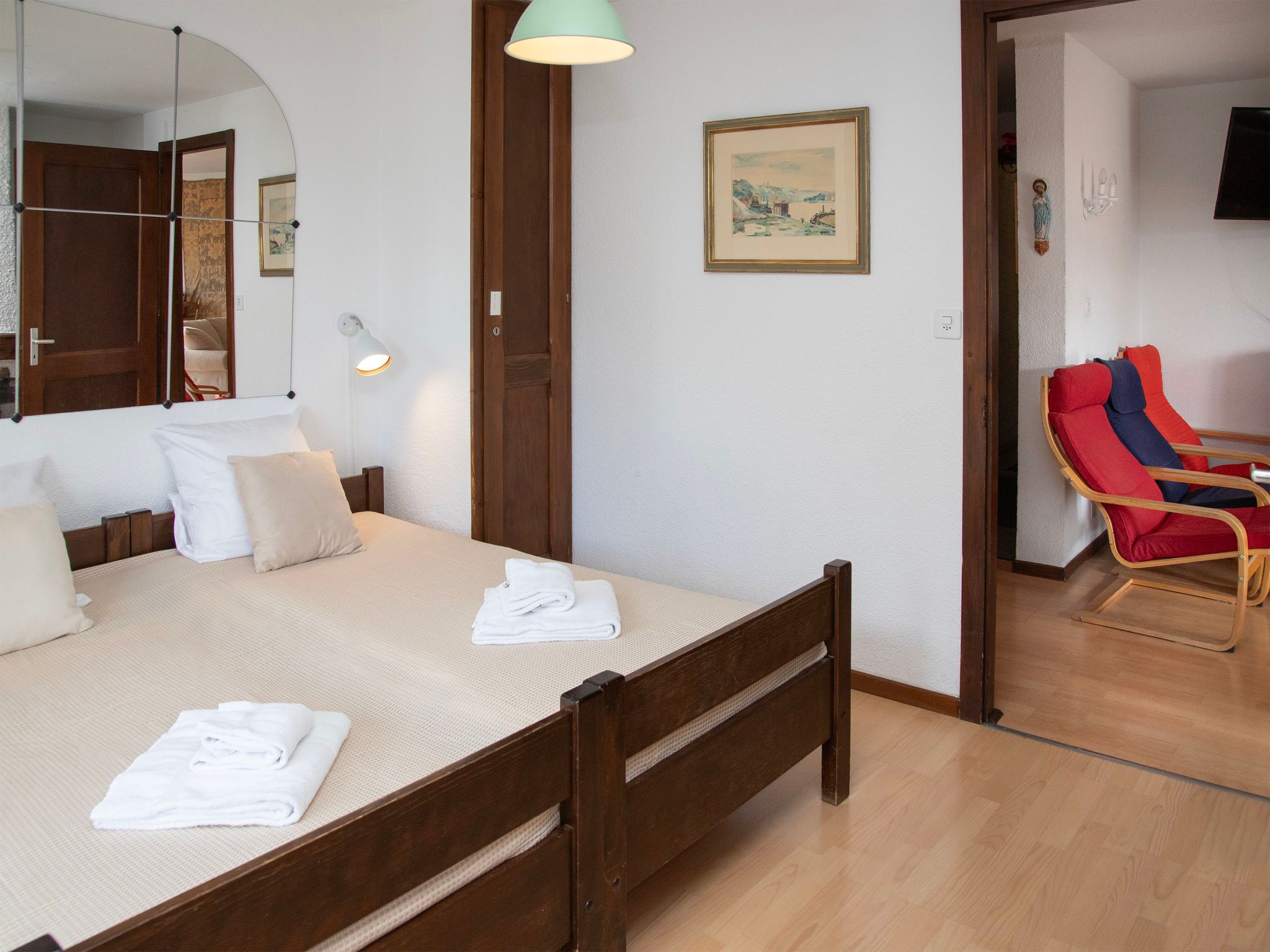 Galaxie 217, 4-Zimmer-Wohnung 90 m2. Teilweise renoviert im Jahre 2016, schön eingerichtet: Wohn-/Esszimmer mit offenem Kamin und Kabel-TV. Ausgang zum Balkon. 1 Zimmer mit 1 Doppelbett (2 x 90 cm, Länge 200 cm), offenem Kamin. 1 Zimmer mit 1 franz. Bett (1 x 160 cm, Länge 200 cm). 1 Zimmer mit 2 Betten. Kochnische (3 Kochplatten, Geschirrspüler, Wasserkocher, Mikrowelle, Racletteofen, Fondue Set (Käse)). Bad/WC, Dusche/WC. Kleiner Balkon. Balkonmöbel. Schöne Sicht auf die Berge. Zur Verfügung: Haartrockner. Internet (Wireless LAN, gratis). Garage Nr. 1er à droite, Höhe 190 cm, Breite 190 cm. Bitte beachten: Nichtraucher-Haus.