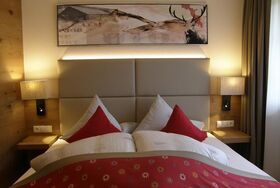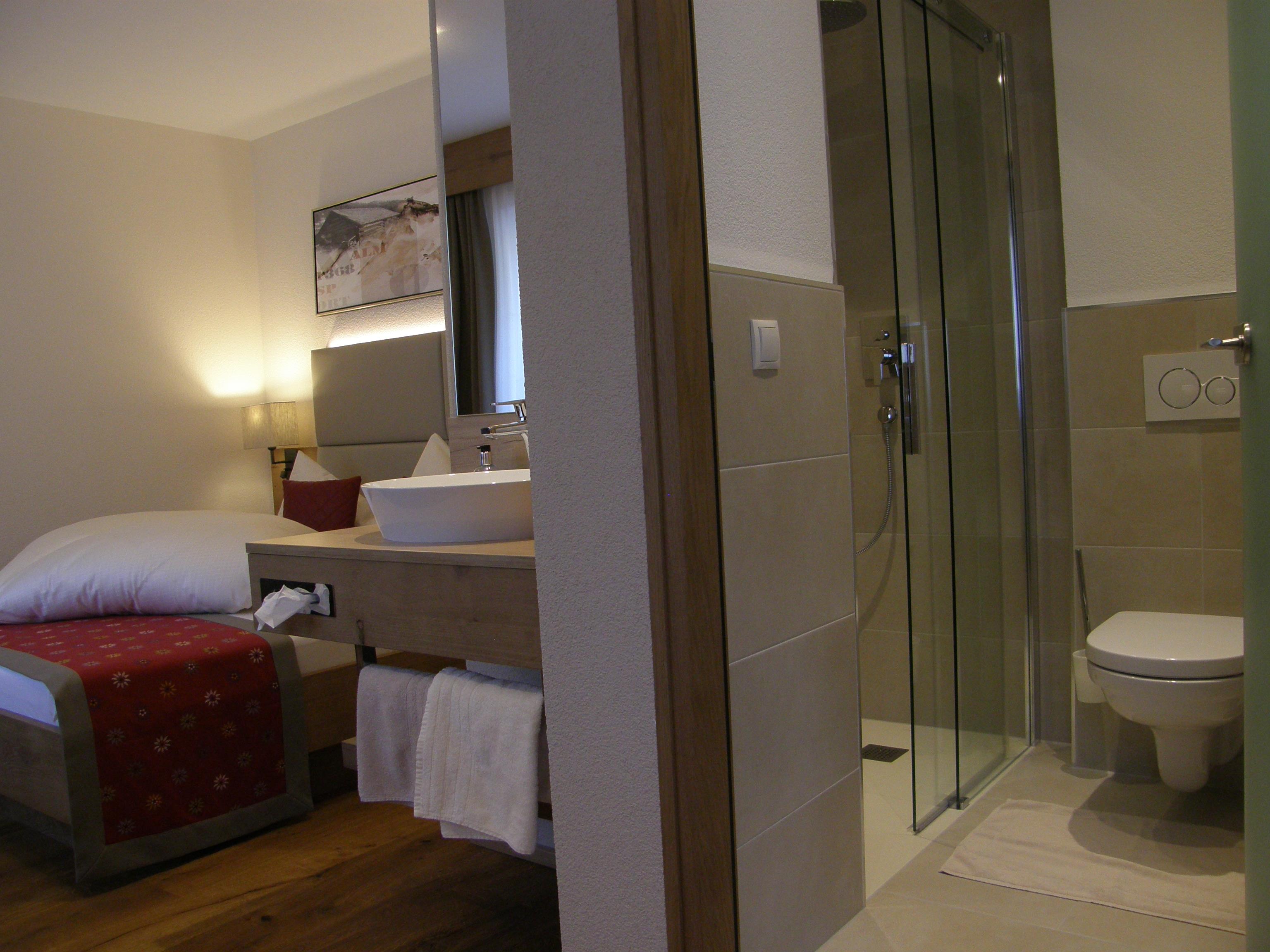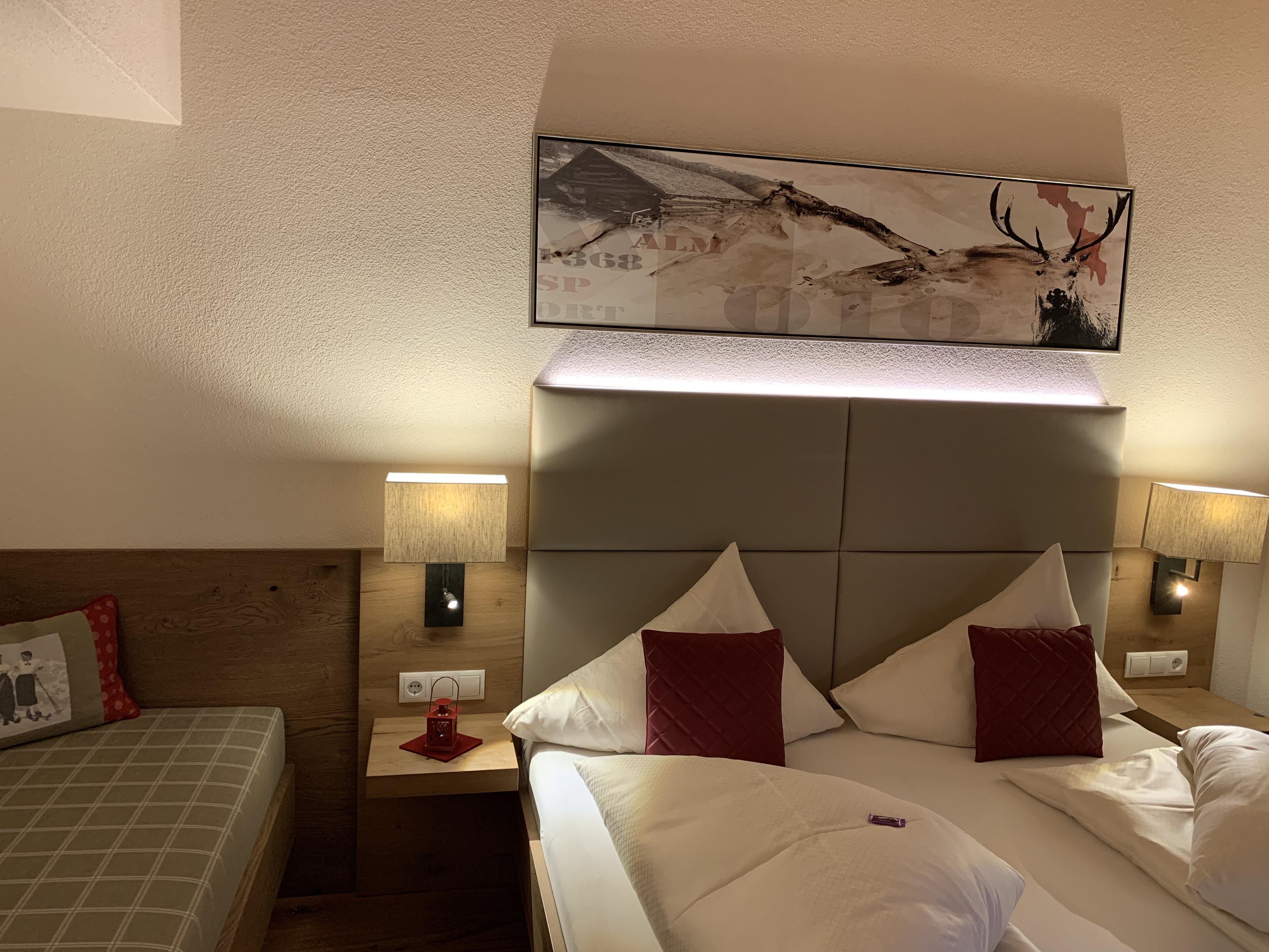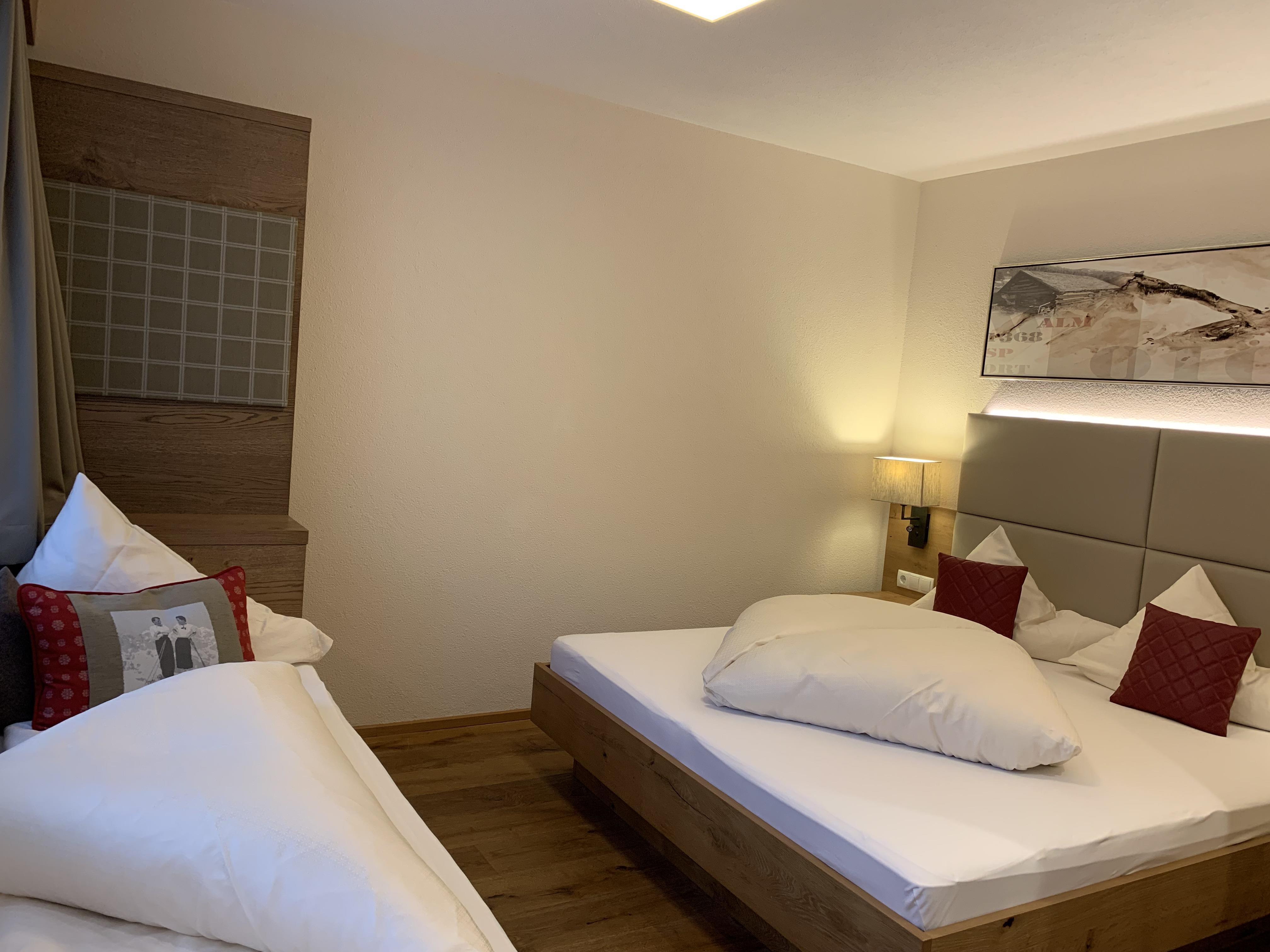 Gemütliches Dreibettzimmer (ca. 22 m²) mit warmen Naturtönen und Holzböden besteht aus: Doppelbett oder auf Wunsch auch getrennte Betten möglich und einem Einzelbett; Dusche und WC, Haarfön; Tresor; Kabel-Flat-TV; tägliche Benützung der Sauna; eigener Balkon mit herrlichem Blick auf die Ötztaler Bergwelt.
