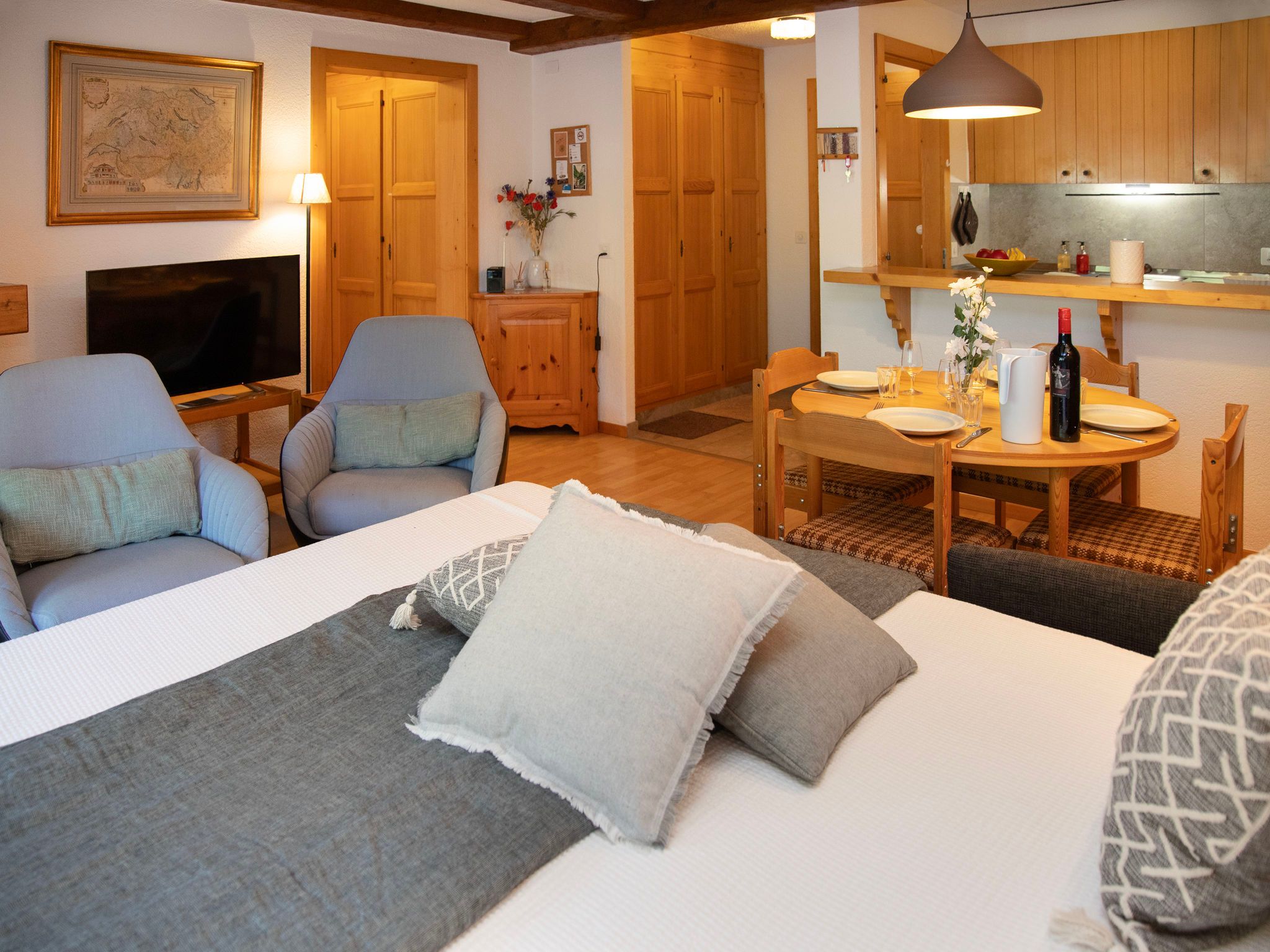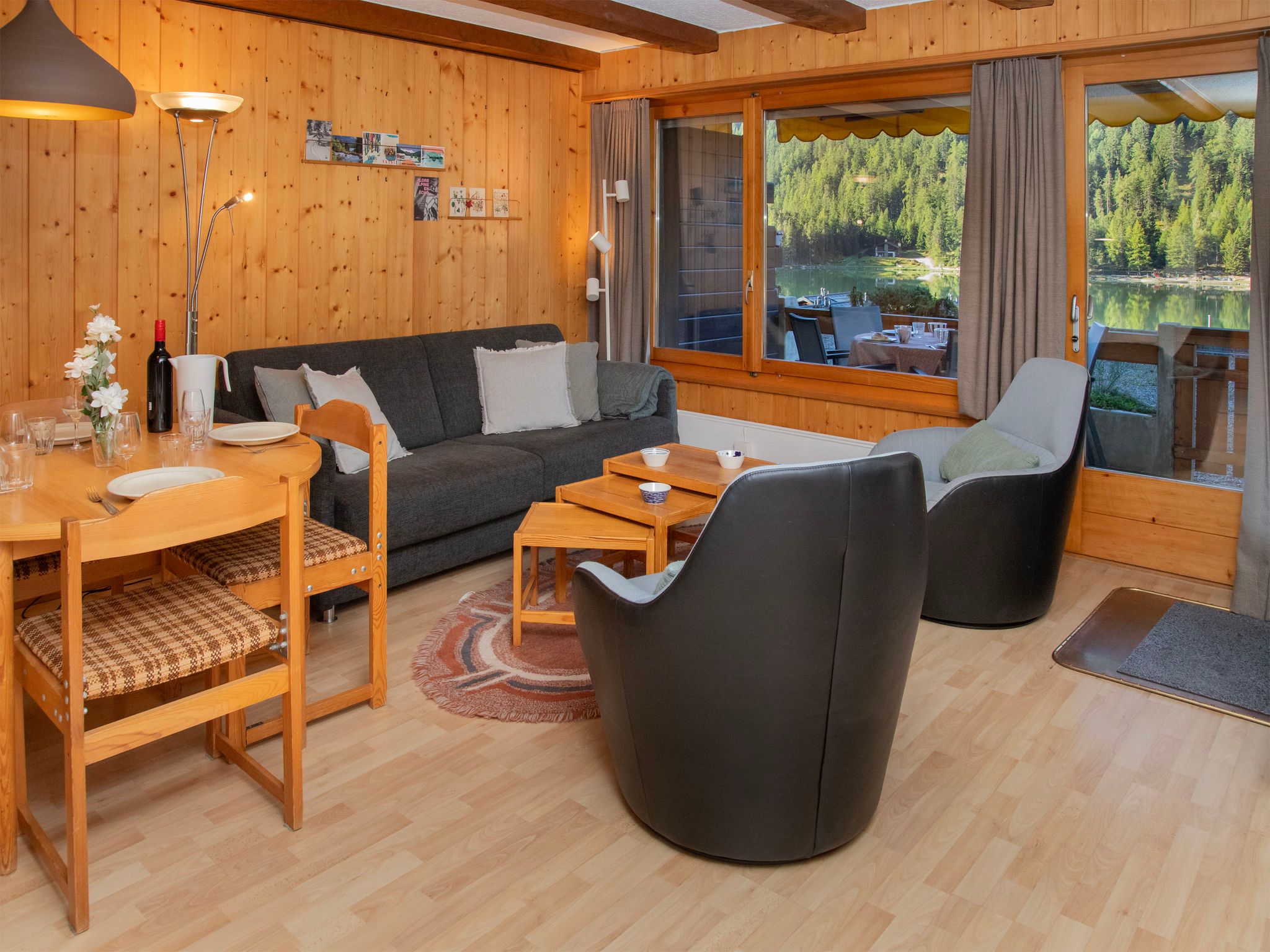 Parc C013, 2-Zimmer-Wohnung 60 m2, im erhöhten Erdgeschoss. Zweckmässig und schön eingerichtet: Wohn-/Esszimmer mit 1 Doppeldiwanbett (140 cm, Länge 200 cm), Kabel-TV. Ausgang zum Balkon. 1 grosses Zimmer mit 2 Betten (90 cm, Länge 200 cm). Kochnische (4 Kochplatten, Backofen, Geschirrspüler). Dusche/WC. Kleiner Balkon. Balkonmöbel, Liegestühle (2). Schöne Sicht auf den See und die Berge. Zur Verfügung: Internet (WLAN, gratis). Parkplatz Nr. 5 (überdacht) beim Haus. Bitte beachten: Nichtraucher-Unterkunft. Maximal 1 Haustier/Hund erlaubt.