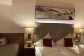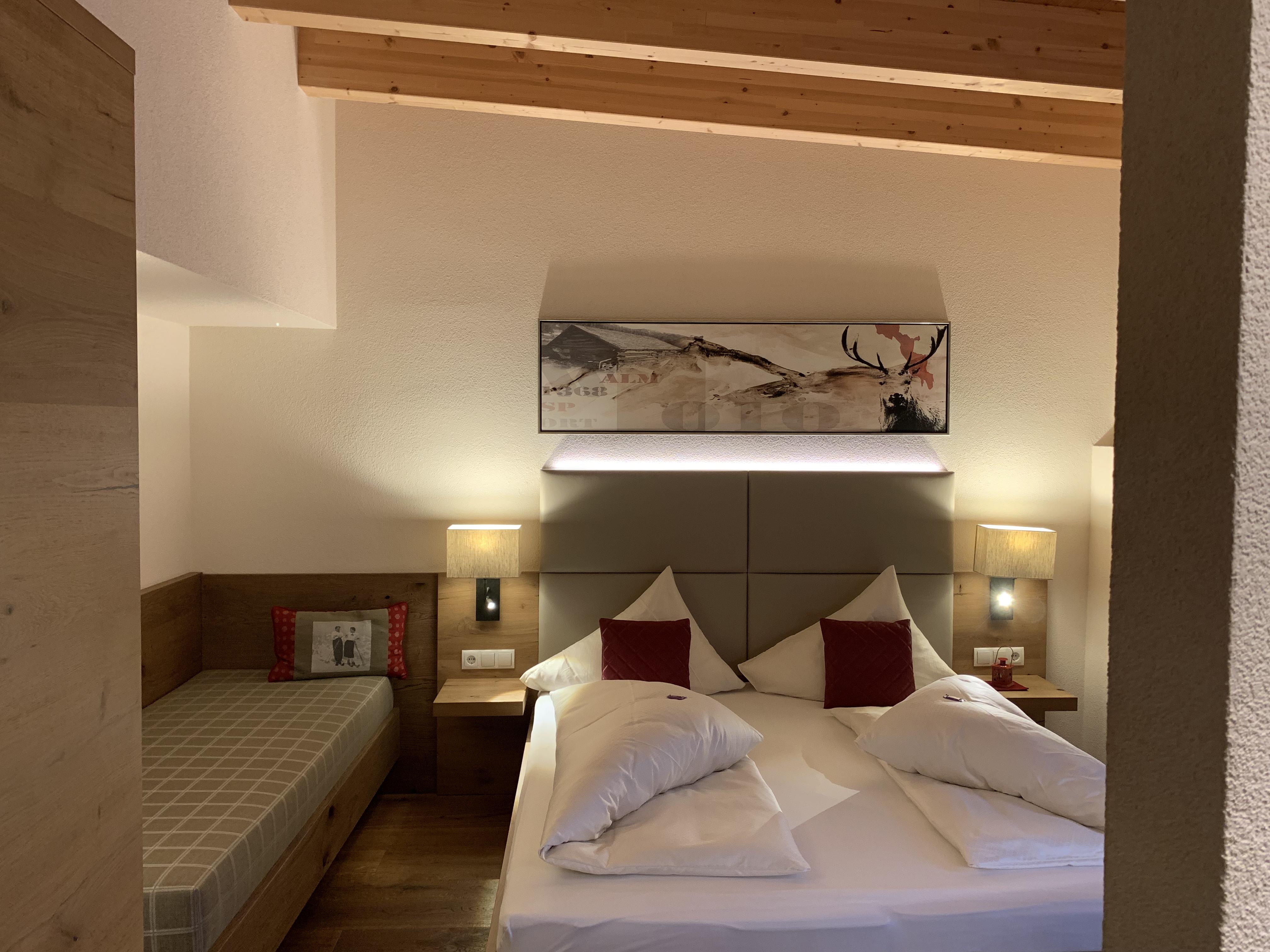 Gemütliches Dreibettzimmer (ca. 22 m²) mit warmen Naturtönen und Holzböden besteht aus: Doppelbett oder auf Wunsch auch getrennte Betten möglich und einem Einzelbett; Dusche und WC, Haarfön; Tresor; Kabel-Flat-TV; tägliche Benützung der Sauna; eigener Balkon mit herrlichem Blick auf die Ötztaler Bergwelt.