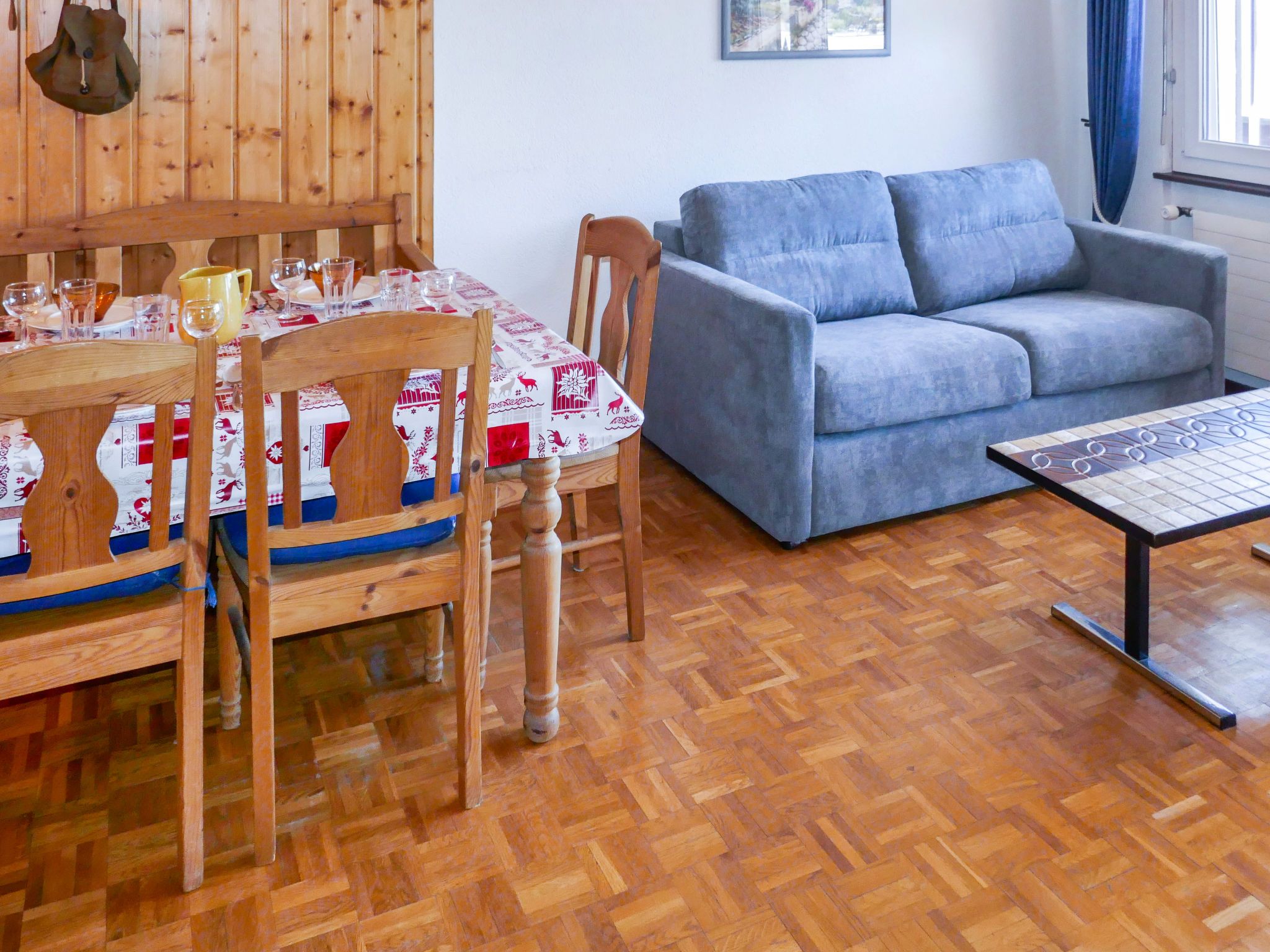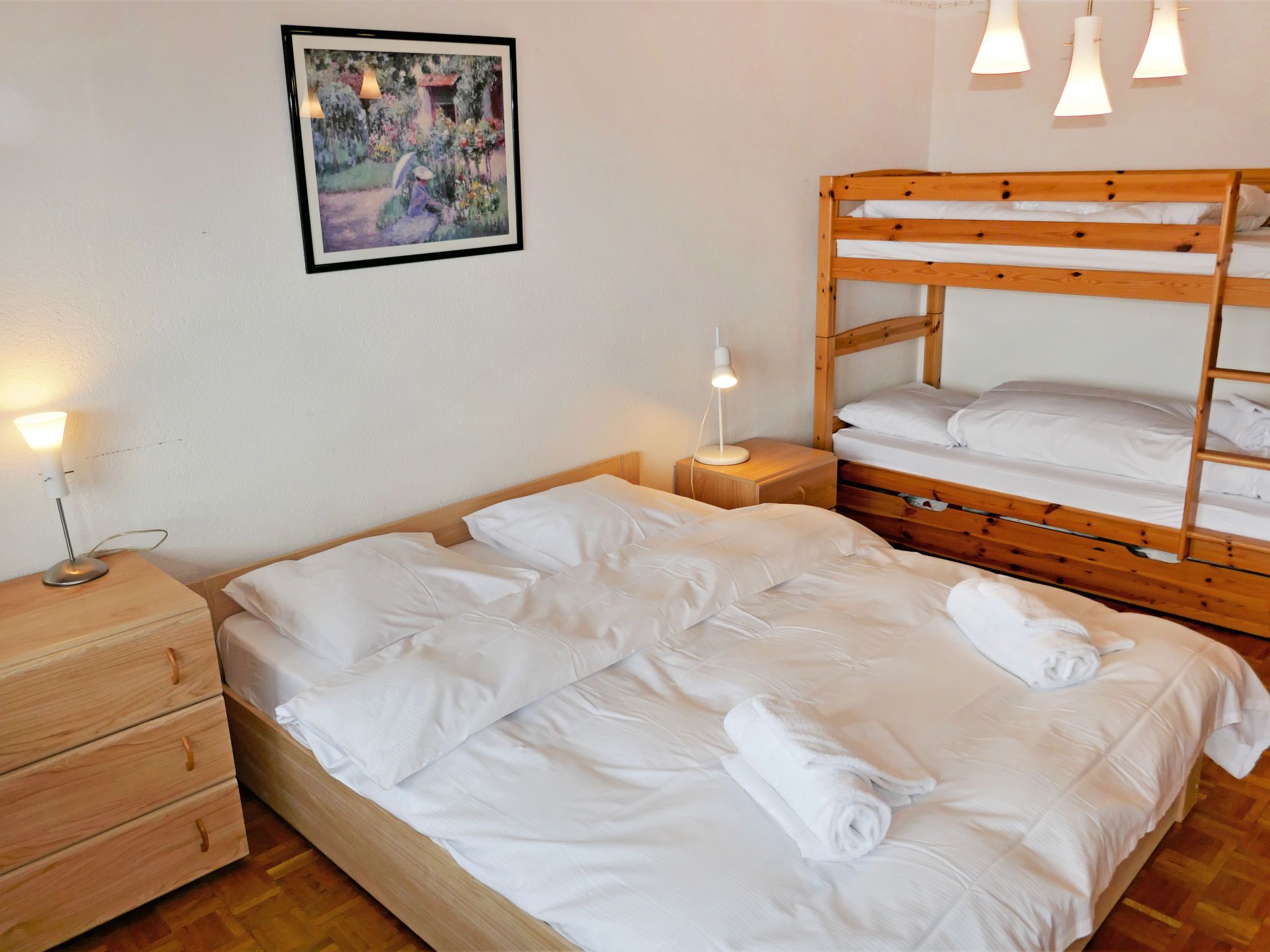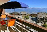 Valaisia 44b, 2-Zimmer-Wohnung 50 m2 im 4. Stock. Einfach eingerichtet: Wohn-/Esszimmer mit Kabel-TV, Radio und CD. Ausgang zum Balkon. 1 Zimmer mit 1 x 2 Etagenbetten (90 cm, Länge 190 cm), 1 Doppelbett (160 cm, Länge 200 cm), Bad/WC. Ausgang zum Balkon. (Geschirrspüler, 4 Glaskeramikplatten, Mikrowelle, Racletteofen, Fondue Set (Käse)). Bad/WC. Grosser Balkon, Ostlage. Terrassenmöbel. Schöne Sicht auf die Berge und das Tal. Zur Verfügung: Haartrockner. Internet (WLAN, gratis). Parkplatz Nr. 44 (überdacht), Höhe 260 cm. Bitte beachten: Nichtraucher-Unterkunft.
