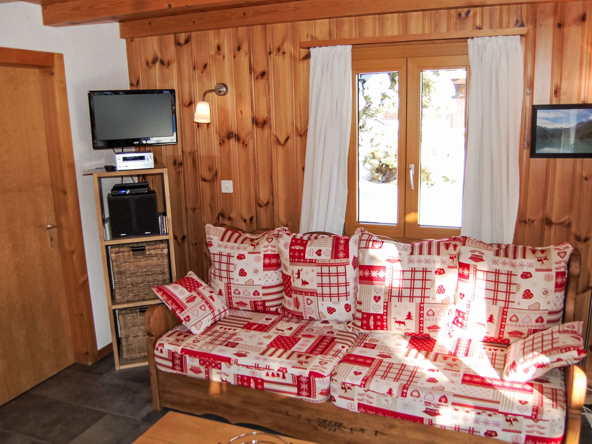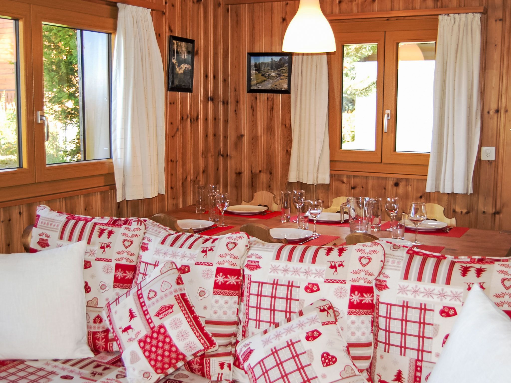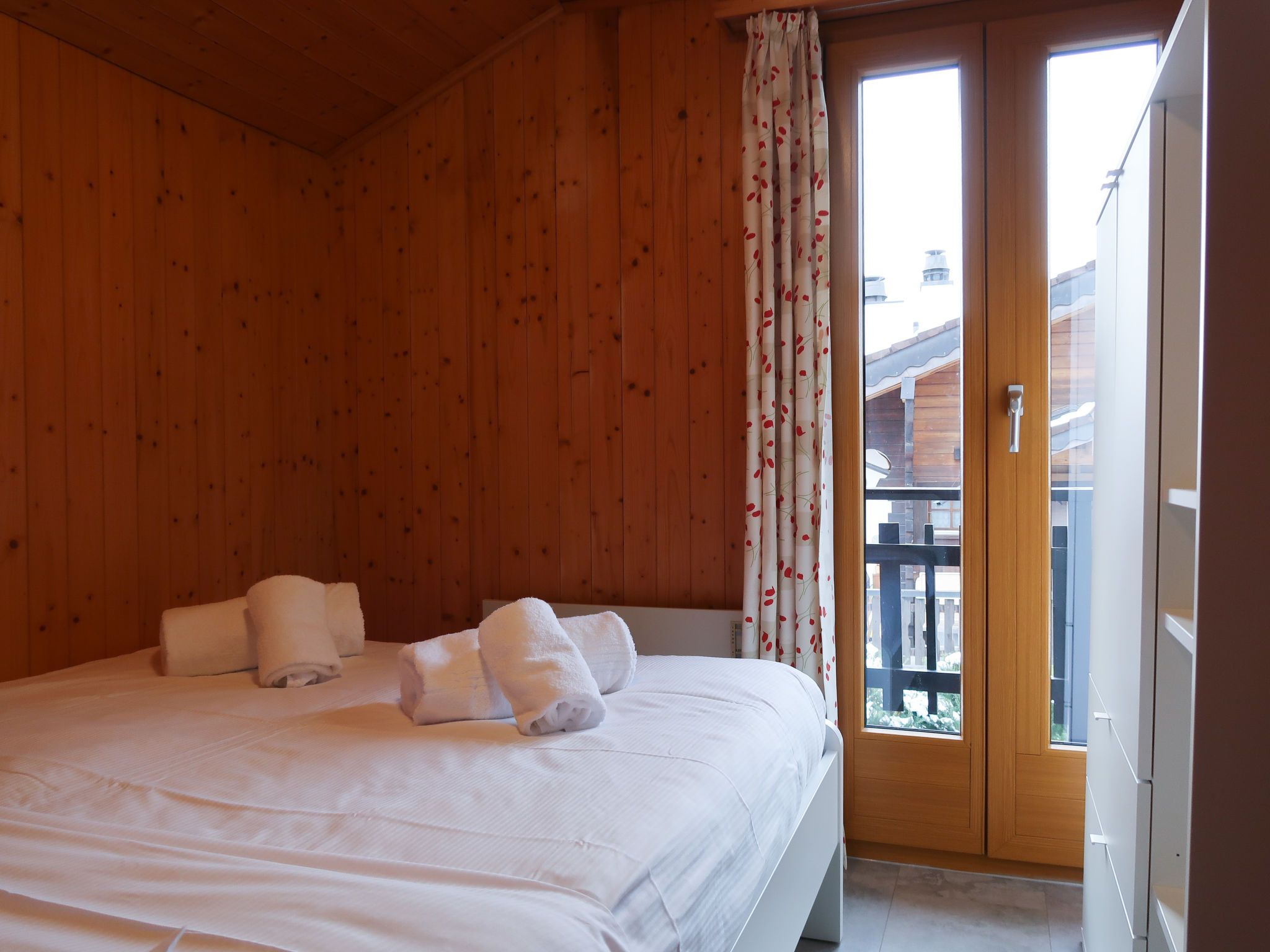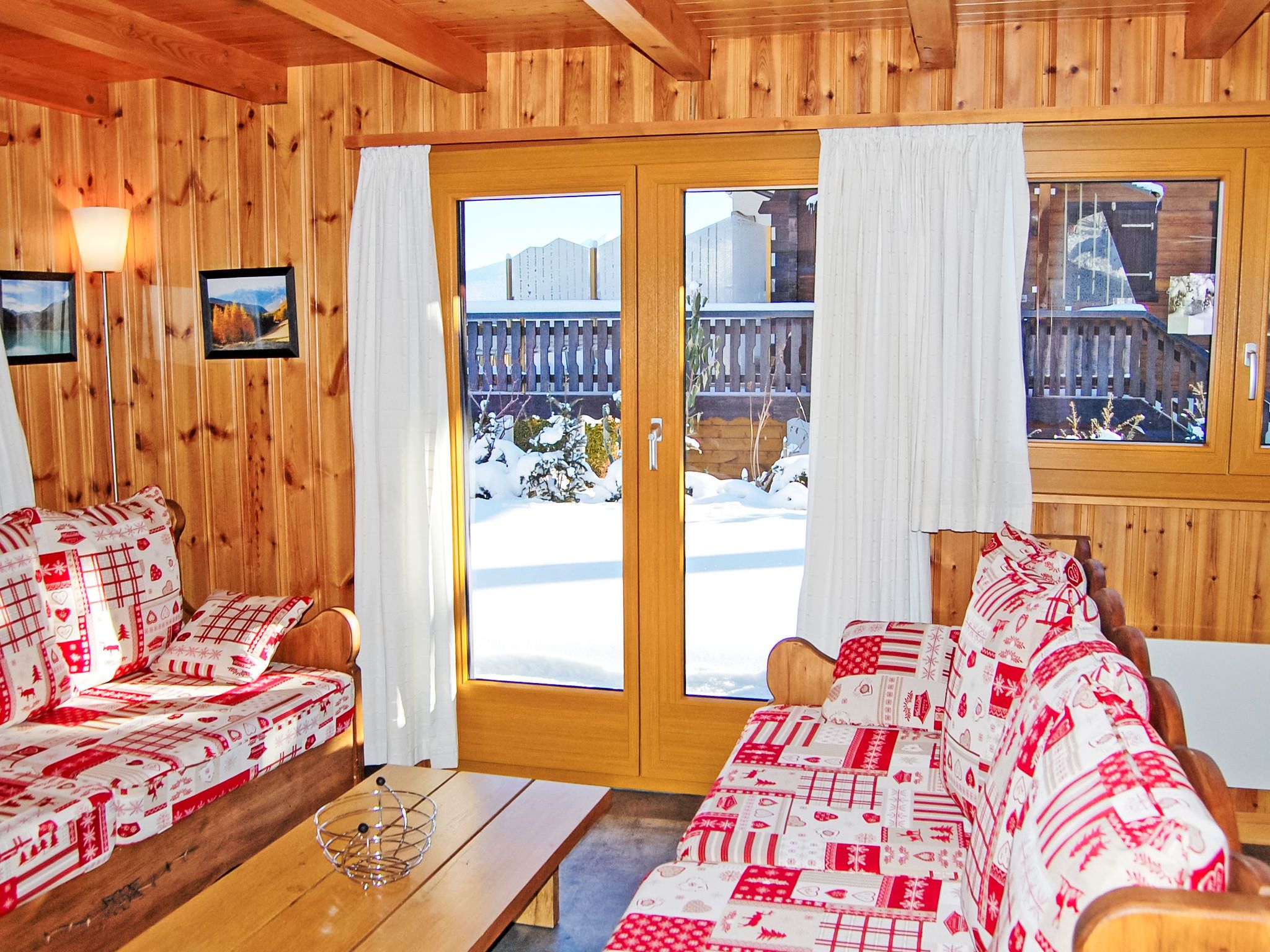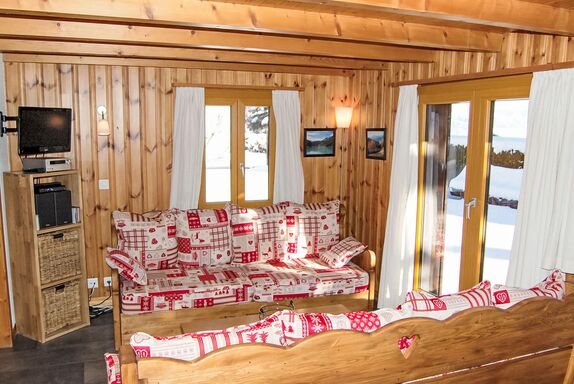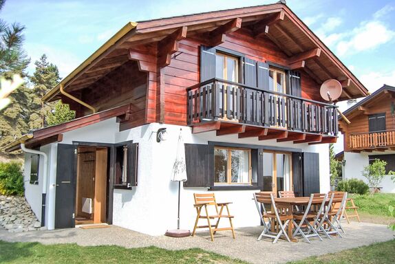 Coucordin, 4-Zimmer-Chalet 73 m2 auf 2 Stockwerken. Schön eingerichtet: Wohn-/Esszimmer mit Sat-TV, Kabel-TV, Stereoanlage und E-Heizung. Ausgang zur Terrasse. Kleine, offene Küche (Backofen, Geschirrspüler, 4 Induktionskochplatten, Toaster, Wasserkocher, Racletteofen, Fondue Set (Chinoise)). Sep. WC. Obergeschoss: 1 Zimmer mit 1 franz. Bett (160 cm, Länge 200 cm). 1 kleines Zimmer mit 1 x 1 Etagenbetten (90 cm, Länge 200 cm). 1 Zimmer mit 1 franz. Bett (180 cm, Länge 200 cm). Dusche/WC, Doppelwaschbecken. Kleiner Balkon, Ostlage, Terrasse 20 m2, Südostlage. Terrassenmöbel, Gartengrill. Zur Verfügung: Waschmaschine, Wäschetrockner, Haartrockner. Internet (Wireless LAN, gratis). Parkplatz (2 Autos). Bitte beachten: Nichtraucher-Haus.