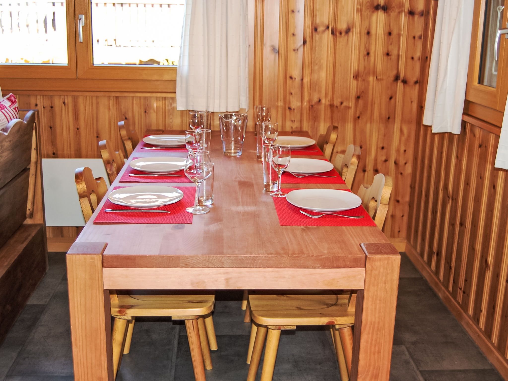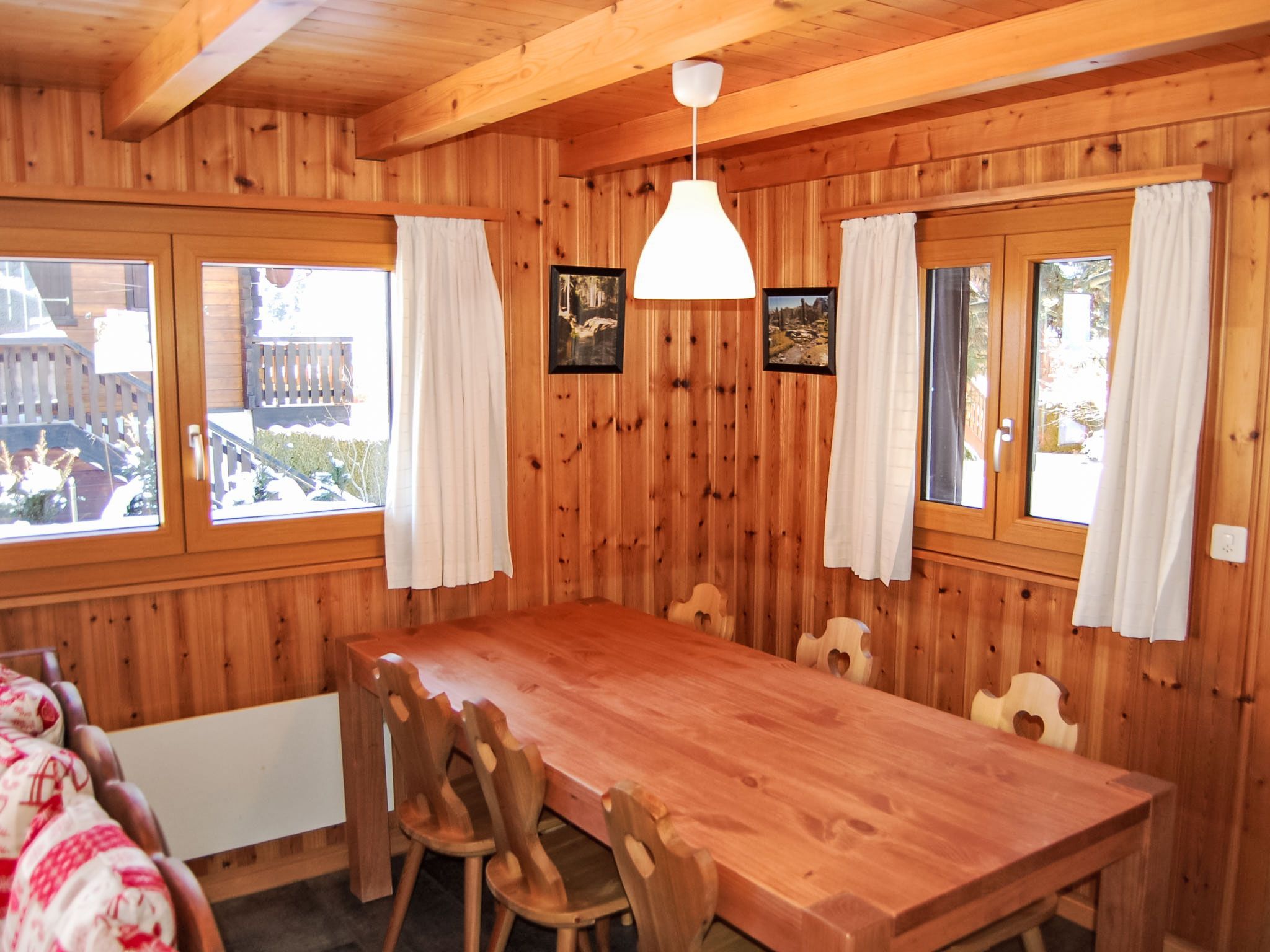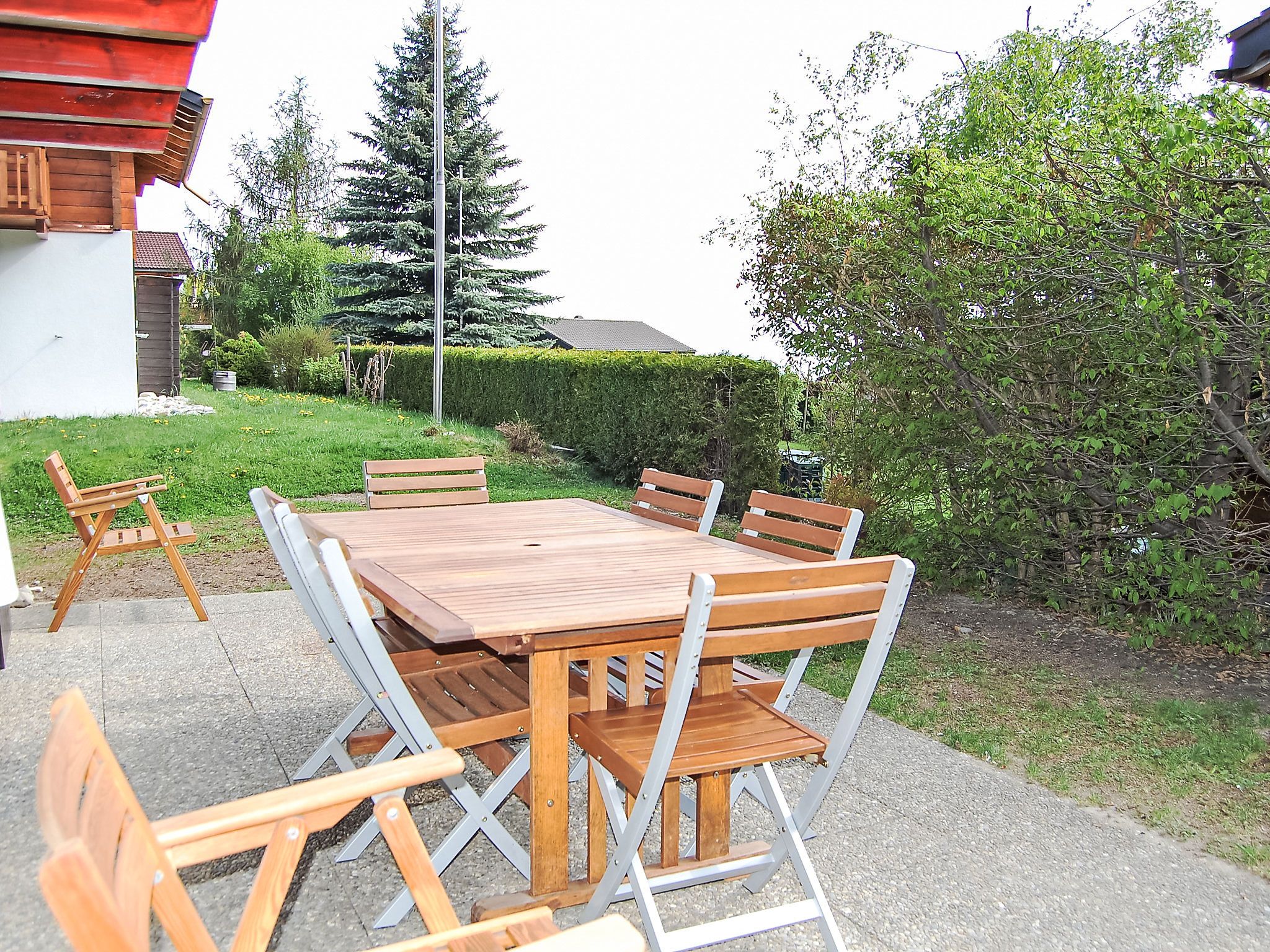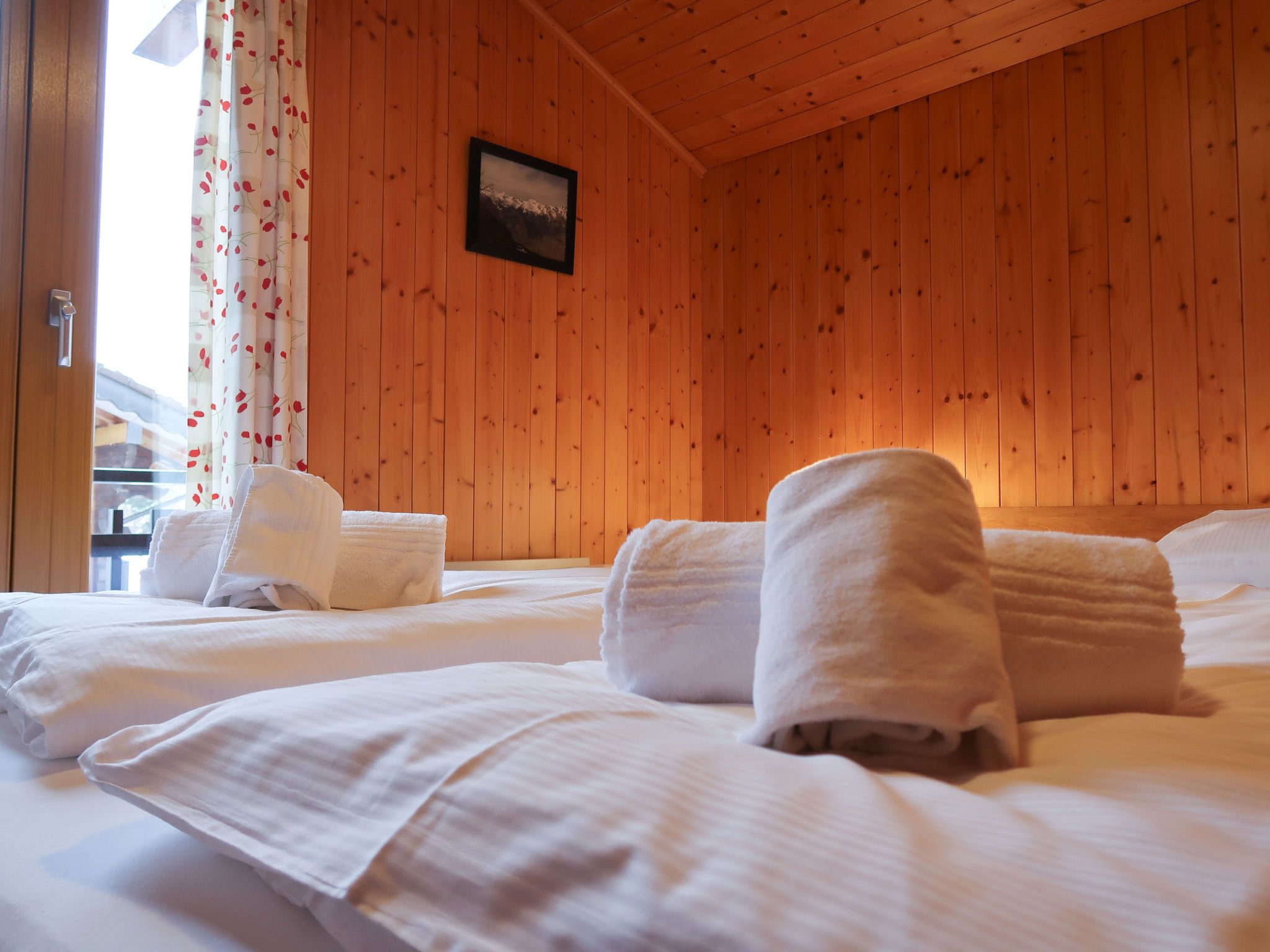 Coucordin, 4-Zimmer-Chalet 73 m2 auf 2 Stockwerken. Schön eingerichtet: Wohn-/Esszimmer mit Sat-TV, Kabel-TV, Stereoanlage und E-Heizung. Ausgang zur Terrasse. Kleine, offene Küche (Backofen, Geschirrspüler, 4 Induktionskochplatten, Toaster, Wasserkocher, Racletteofen, Fondue Set (Chinoise)). Sep. WC. Obergeschoss: 1 Zimmer mit 1 franz. Bett (160 cm, Länge 200 cm). 1 kleines Zimmer mit 1 x 1 Etagenbetten (90 cm, Länge 200 cm). 1 Zimmer mit 1 franz. Bett (180 cm, Länge 200 cm). Dusche/WC, Doppelwaschbecken. Kleiner Balkon, Ostlage, Terrasse 20 m2, Südostlage. Terrassenmöbel, Gartengrill. Zur Verfügung: Waschmaschine, Wäschetrockner, Haartrockner. Internet (Wireless LAN, gratis). Parkplatz (2 Autos). Bitte beachten: Nichtraucher-Haus.