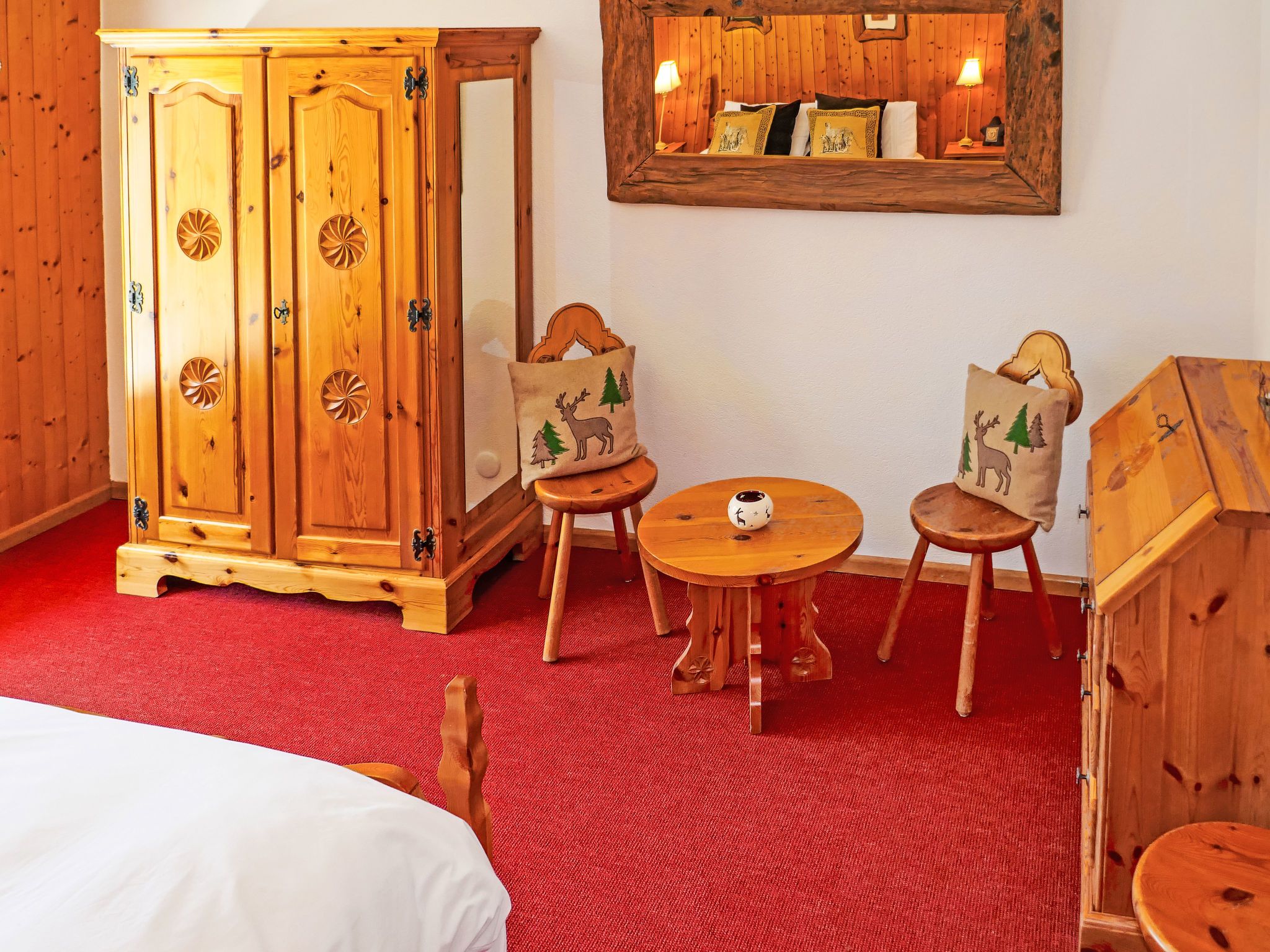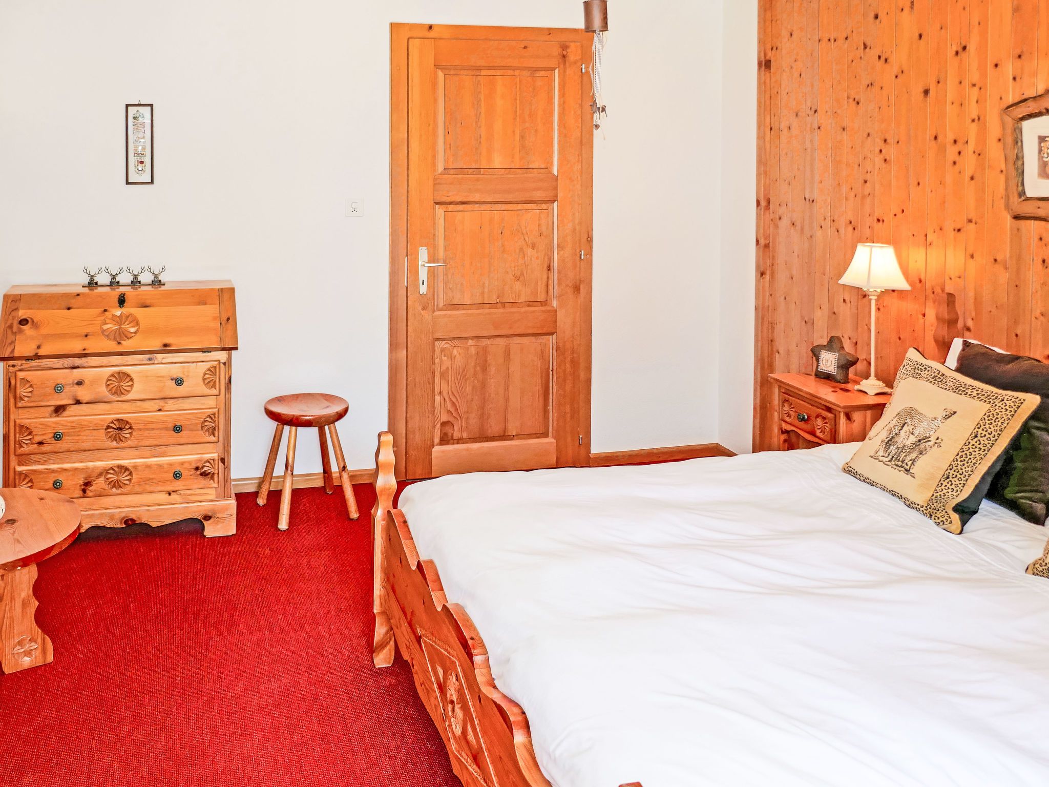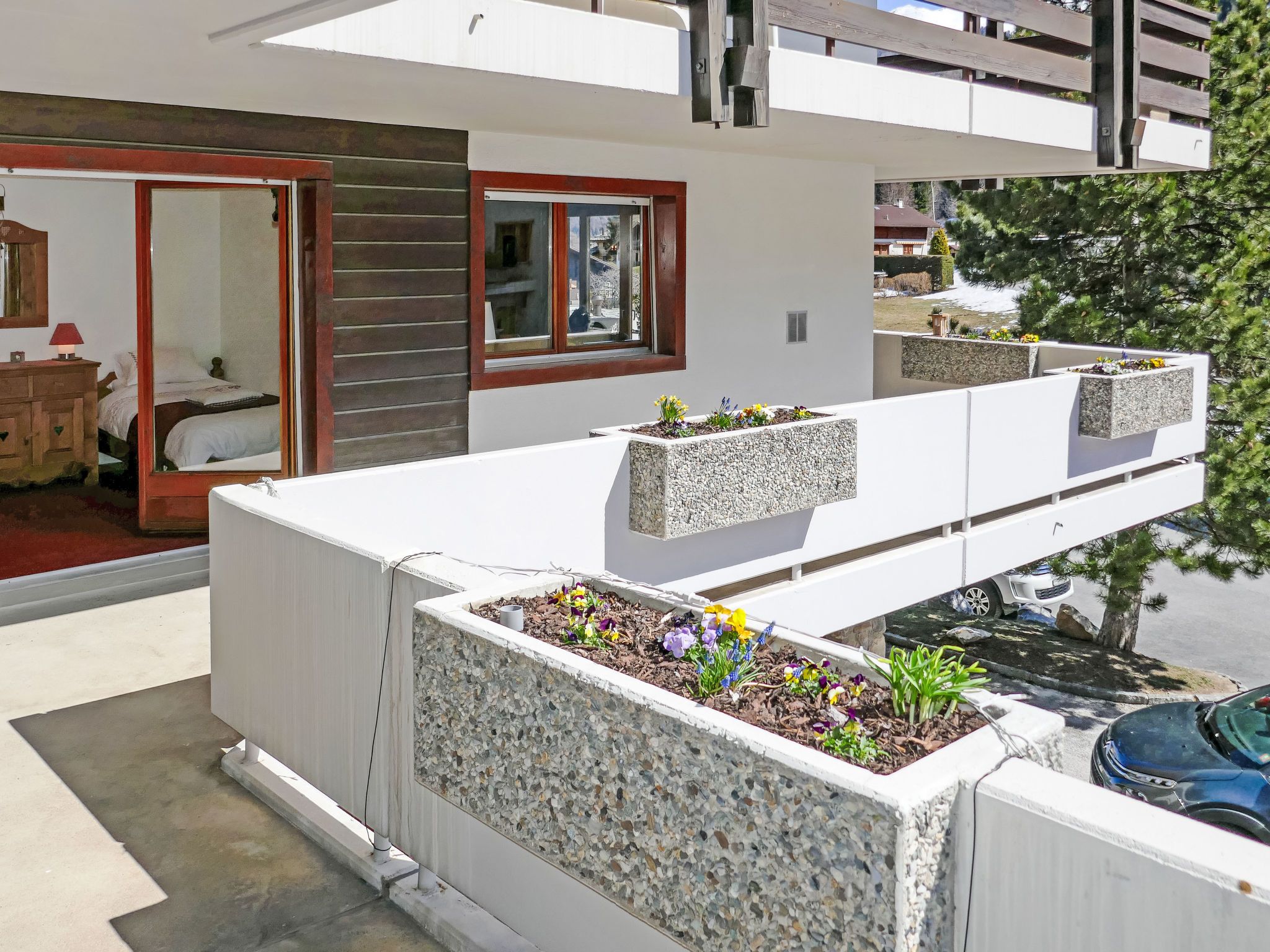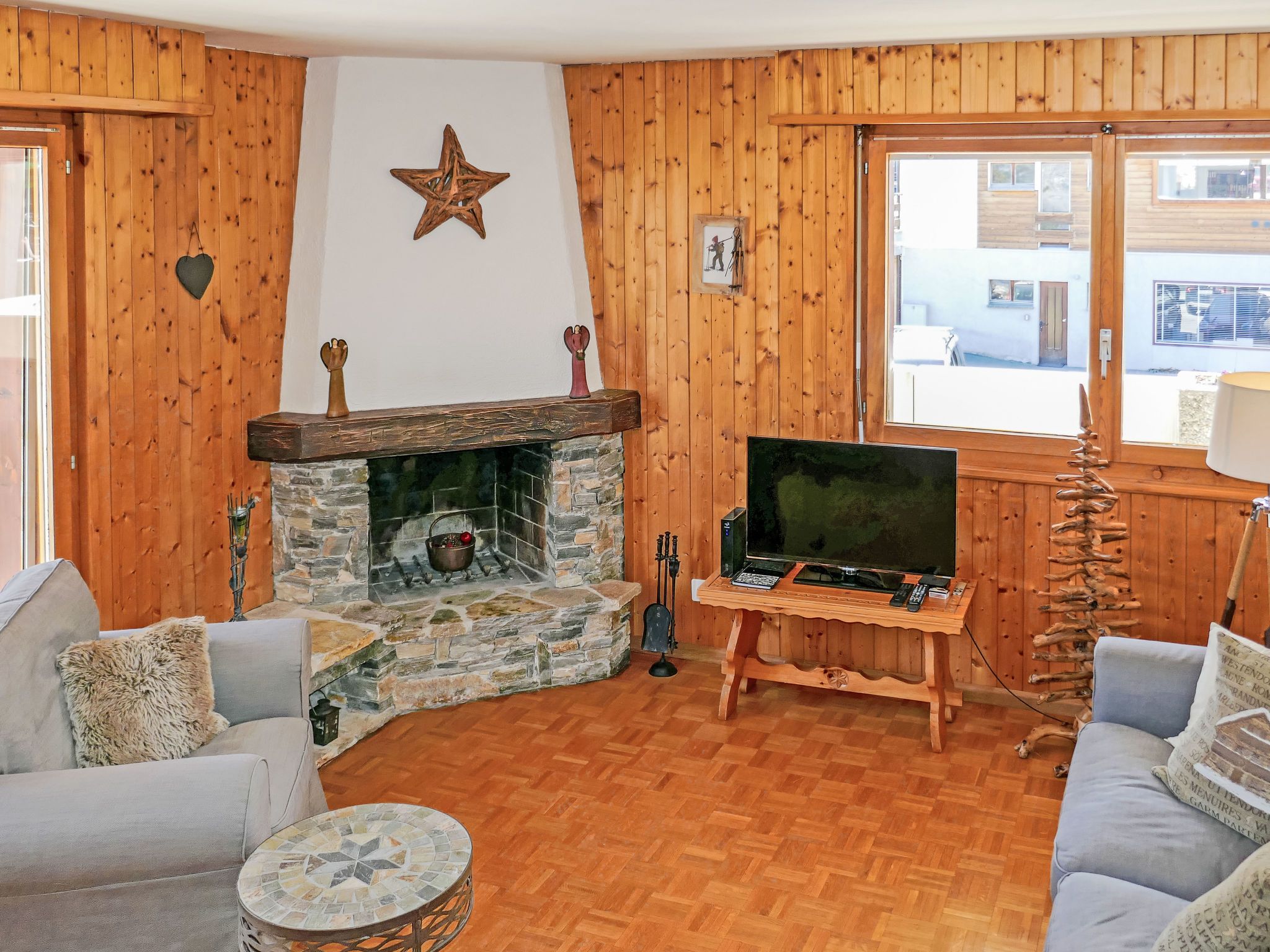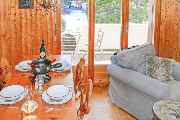 Grand Place 5, 3-Zimmer-Wohnung 70 m2 im 1. Stock. Komfortabel eingerichtet: Wohn-/Esszimmer mit offenem Kamin (nur Deko), Kabel-TV. Ausgang zum Balkon, Richtung Süden und Richtung Westen. 1 Zimmer mit 2 Betten (90 cm, Länge 190 cm). Ausgang zum Balkon, Richtung Westen. 1 Zimmer mit 1 franz. Bett (160 cm, Länge 190 cm). Ausgang zum Balkon, Richtung Westen. Offene Küche (4 Kochplatten, Backofen, Geschirrspüler, Toaster, Wasserkocher, Mikrowelle, elektrische Kaffeemaschine, Kapseln für die Kaffeemaschine (Nespresso) extra, Racletteofen, Fondue Set (Käse)). Bad/WC, sep. WC. Sicht auf die Berge und das Tal. Zur Verfügung: Internet (Wireless LAN, gratis). Garage, Höhe 190 cm, Breite 220 cm. Bitte beachten: Nichtraucher-Unterkunft.