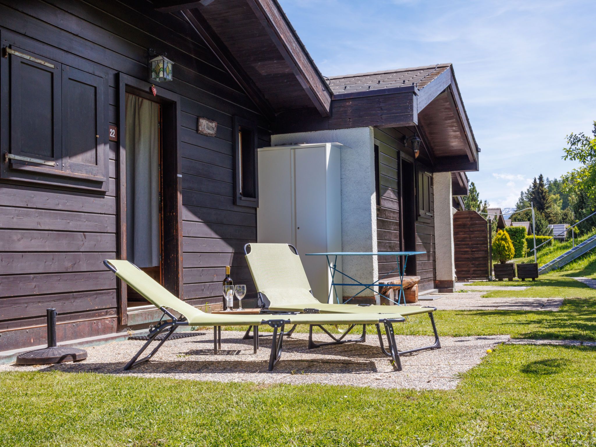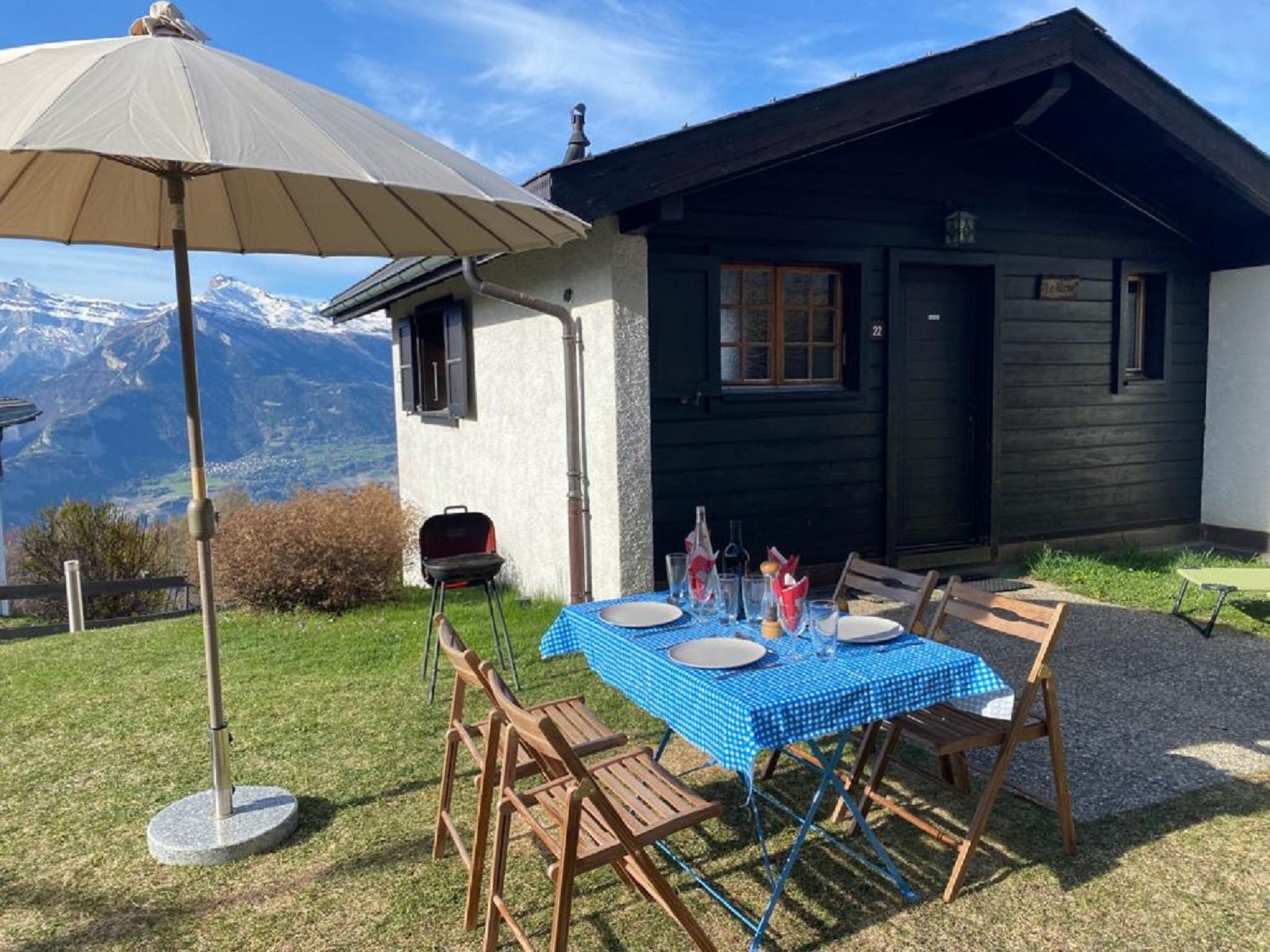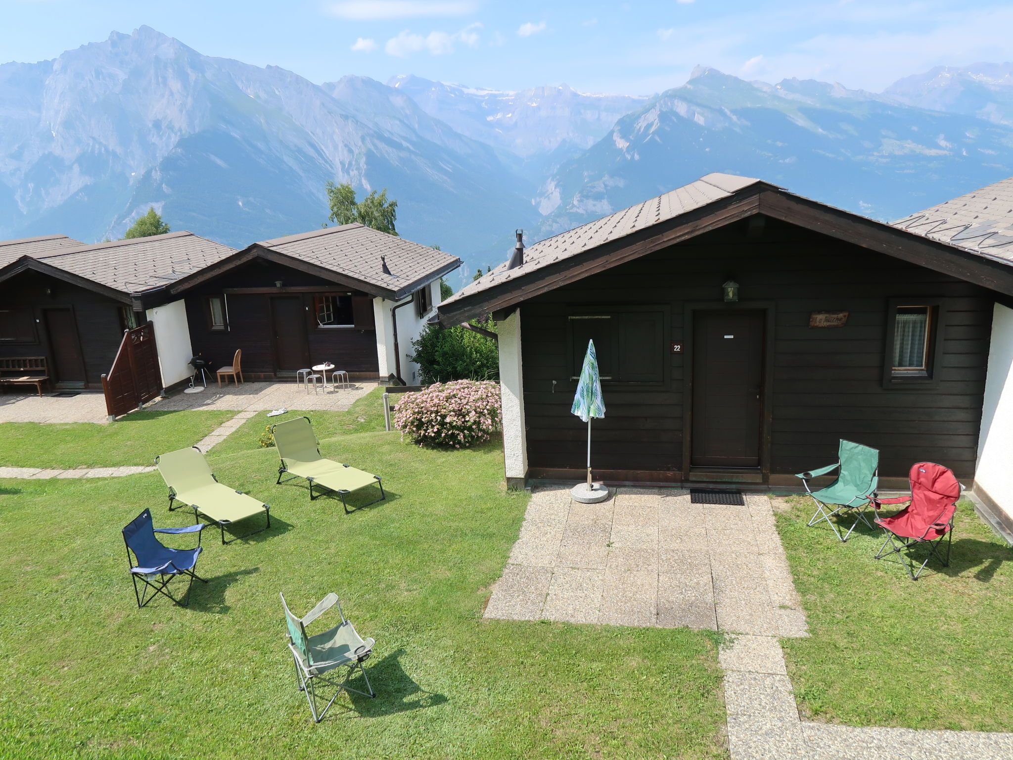 Tsamandon 22, 3-Zimmer-Doppelhaushälfte 50 m2 auf 2 Stockwerken. Zweckmässig eingerichtet: Wohn-/Esszimmer mit Kabel-TV. Ausgang zum Balkon, Richtung Norden. Offene Küche (Backofen, Geschirrspüler, 4 Induktionskochplatten, Toaster, Wasserkocher, Mikrowelle, elektrische Kaffeemaschine, Racletteofen, Fondue Set (Käse)). E-Heizung. Unteres Geschoss: 1 Zimmer mit 1 franz. Bett (140 cm, Länge 200 cm). 1 Zimmer mit 2 Betten (90 cm, Länge 190 cm). Dusche/WC. Liegestühle (2). Schöne Sicht auf die Berge. Zur Verfügung: Internet (WLAN, gratis). Parkplatz Nr. 22. Bitte beachten: Nichtraucher-Haus. Maximal 1 Haustier/Hund erlaubt.
