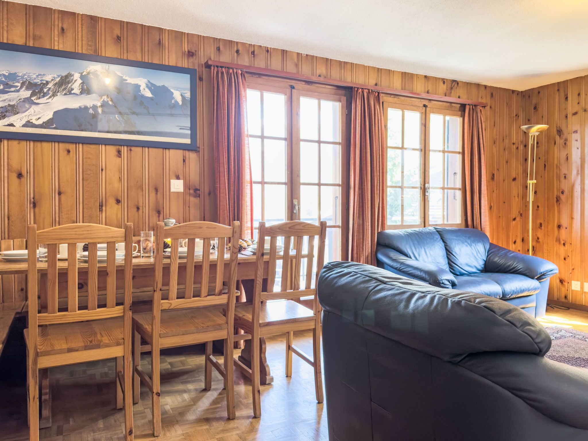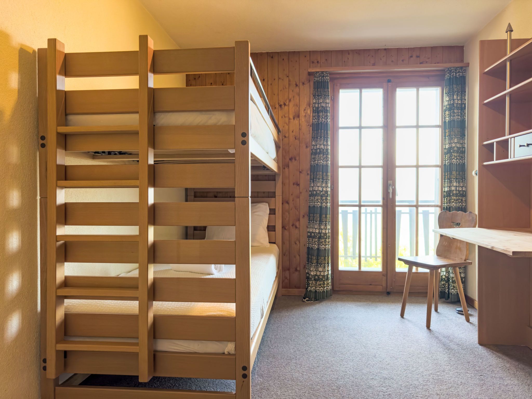 Mont-Soleil 2, 3-Zimmer-Wohnung 85 m2 im 1. Stock. Teilweise renoviert im Jahre 2024, zweckmässig eingerichtet: Wohnzimmer mit Schiebetür mit 2 Wandklappbetten (90 cm, Länge 200 cm), offenem Kamin und Kabel-TV. Ausgang zum Balkon, Richtung Osten und Richtung Süden. 1 Zimmer mit 1 x 2 Etagenbetten (90 cm, Länge 200 cm). Ausgang zum Balkon, Richtung Norden. 1 Zimmer mit 1 franz. Bett (140 cm, Länge 200 cm). Küche (3 Kochplatten, Geschirrspüler, Tiefkühler, Fondue Set (Käse)). Bad/WC, sep. WC. 3 Balkone. Balkonmöbel. Sicht auf die Berge und das Tal. Zur Verfügung: Internet (Wireless LAN, gratis). Bitte beachten: Nichtraucher-Haus.