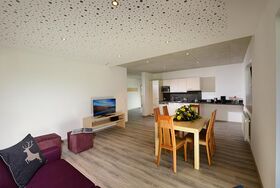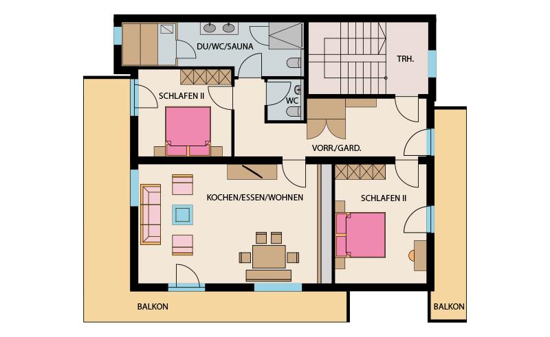 Apartement 13: Vorraum +WC, 2 getrennte Schlafzimmer mit Doppelbetten (Boxspringbetten), 1 Badezimmer mit Doppelwaschbecken, Dusche, WC + integrierte Sauna im Badezimmer (geräumig), Föhn, Wohn-Essbereich mit ausziehbarer Couch (Matratze, 2 Personen), komplett ausgestatteter Küchenblock (+Geschirrspüler, + Mikro), großer Balkon (Tisch/6 Stühle).
