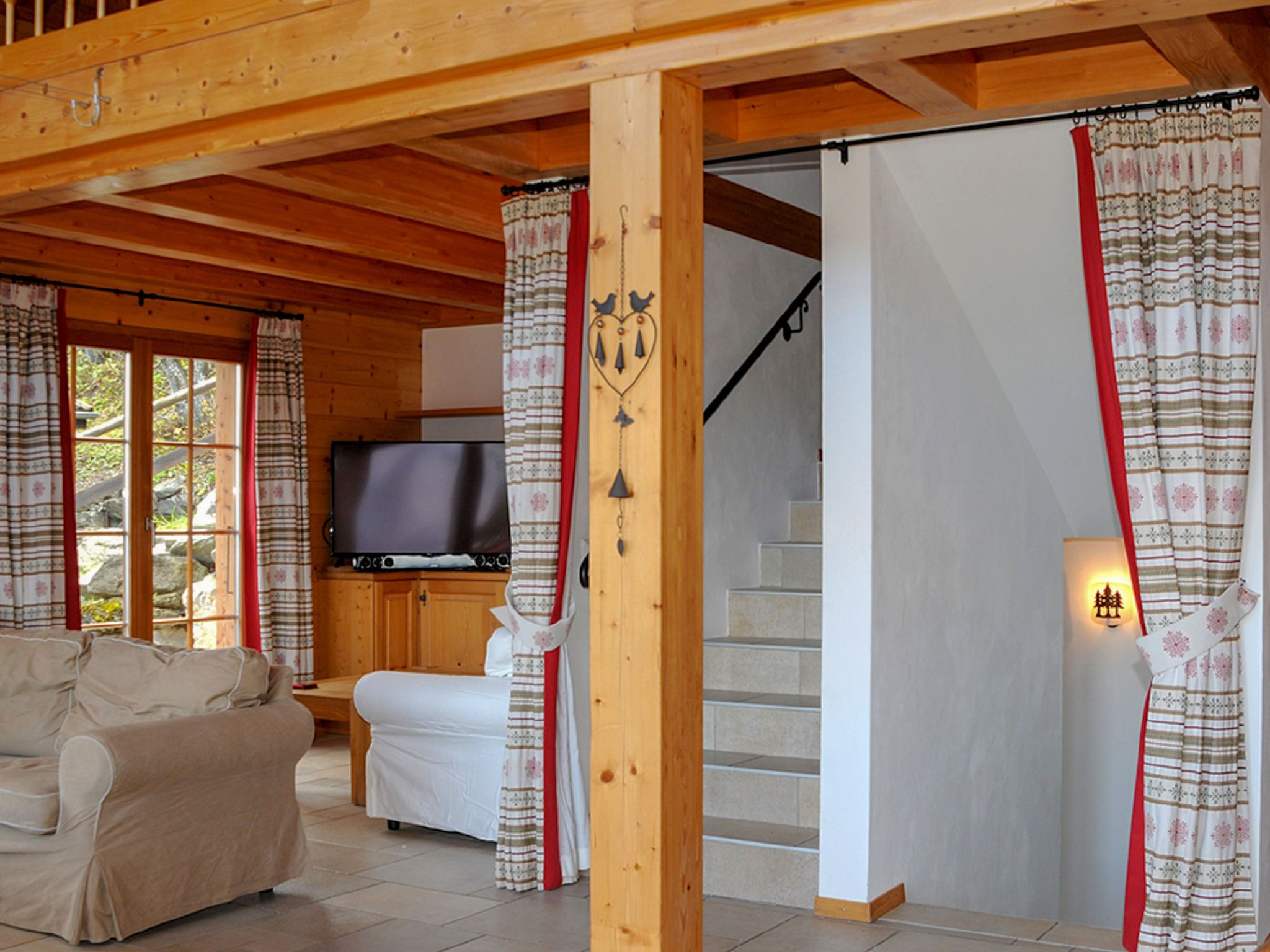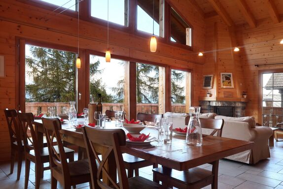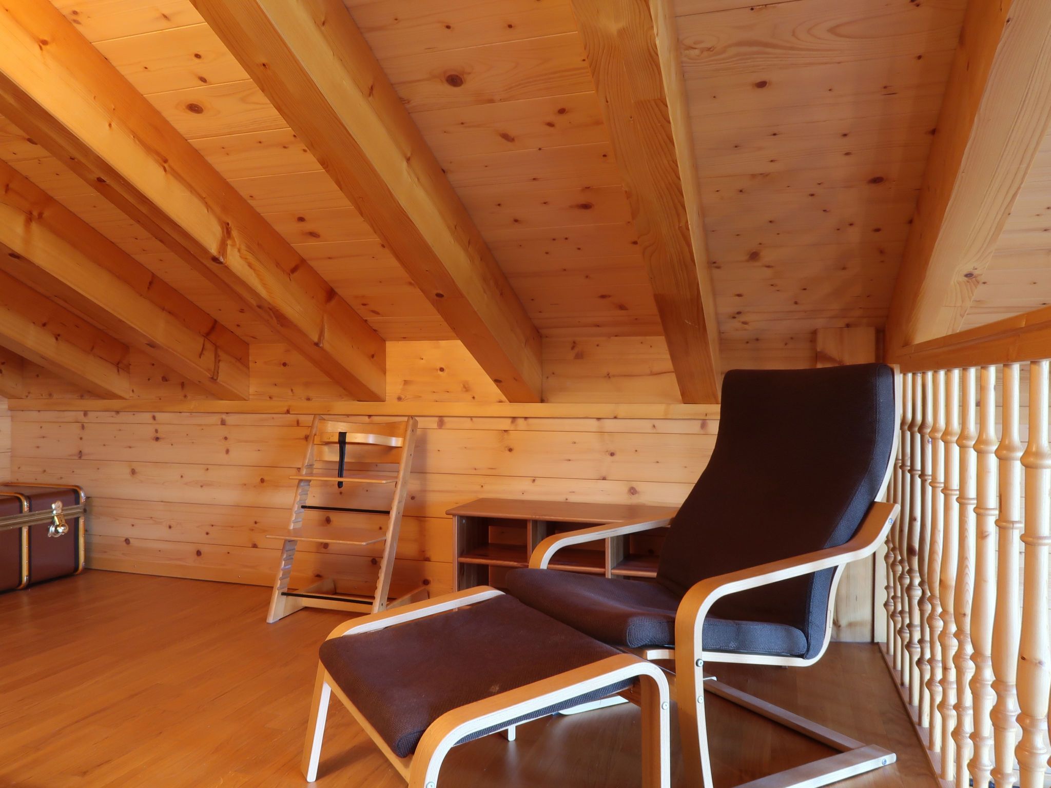 Altamira, 5-Zimmer-Chalet 240 m2 auf 3 Stockwerken. Geräumig, komfortabel und schön eingerichtet: Wohn-/Esszimmer mit offenem Kamin und Kabel-TV. Ausgang zum Balkon, Richtung Norden und Richtung Osten. Offene Küche (Backofen, Geschirrspüler, 4 Glaskeramikplatten, Toaster, Wasserkocher, Mikrowelle, Tiefkühler, elektrische Kaffeemaschine, Kapseln für die Kaffeemaschine (nespresso) extra, Racletteofen, Fondue Set (Chinoise, Käse)). Ausgang zur Terrasse, Richtung Westen. Heizung. Unteres Geschoss: 2 Zimmer, jedes Zimmer mit 1 Doppelbett (2 x 90 cm, Länge 200 cm). 1 Zimmer mit 2 Betten (90 cm, Länge 200 cm). Dusche/WC. Obergeschoss: Eingang. Abgeschrägte, offene Galerie. 1 Zimmer mit 1 Doppelbett (2 x 90 cm, Länge 200 cm), Dusche/WC. Sep. WC. Balkon, Nordlage und Ostlage, grosse Terrasse, Westlage. Terrassenmöbel, Gartengrill. Sicht auf die Berge. Zur Verfügung: Waschmaschine, Wäschetrockner, Kinderhochstuhl, Babybett, Haartrockner. Internet (WLAN, gratis). Parkplatz (2 Autos). Bitte beachten: Nichtraucher-Haus.