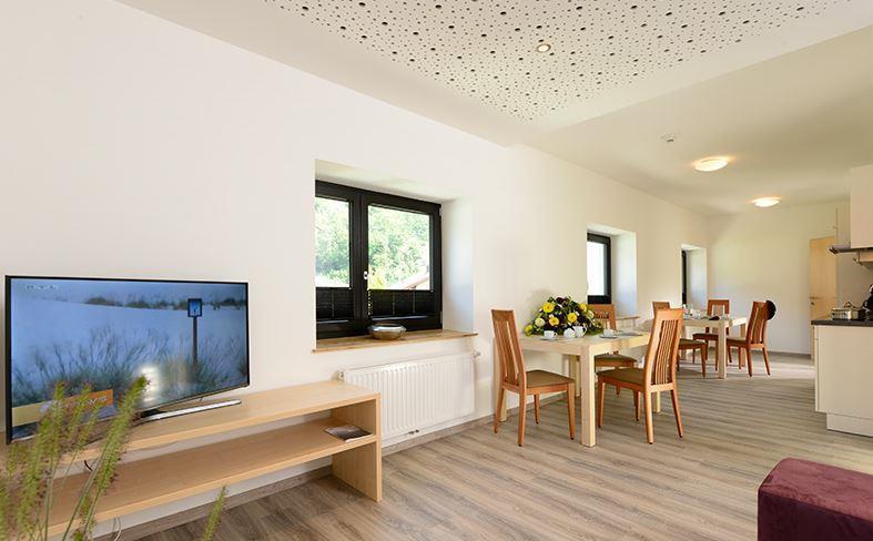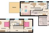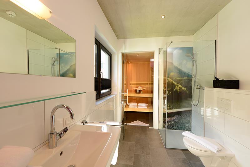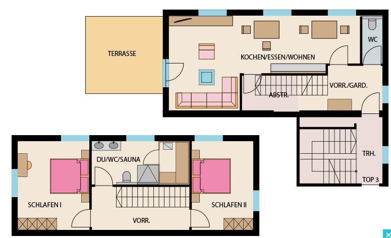 Apartement 11: I. OG: Vorraum + WC, Wohn-Essbereich mit ausziehbarer Couch (Matratze, 2 Personen), komplett ausgestatteter Küchenblock (+Geschirrspüler, + Mikro), Terrasse 6 Stühle/Tisch, 2 Liegen Breite Holztreppe in das II. OG: 2 getrennte Schlafzimmer mit Doppelbetten (Boxspringbetten) + 1 Badezimmer mit Doppelwaschbecken, Dusche, WC + integrierte Sauna im Badezimmer (geräumig)