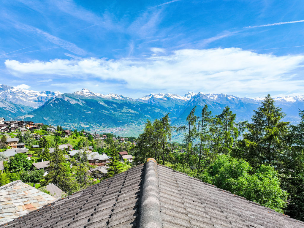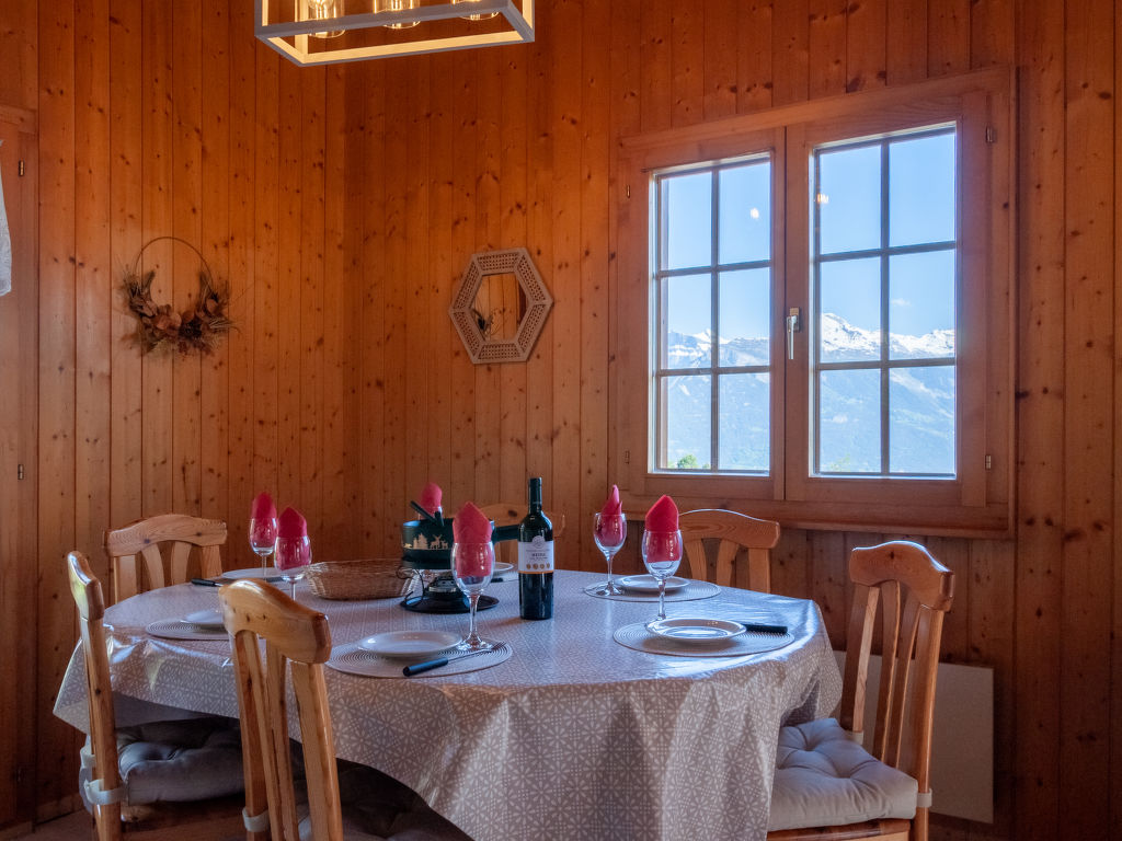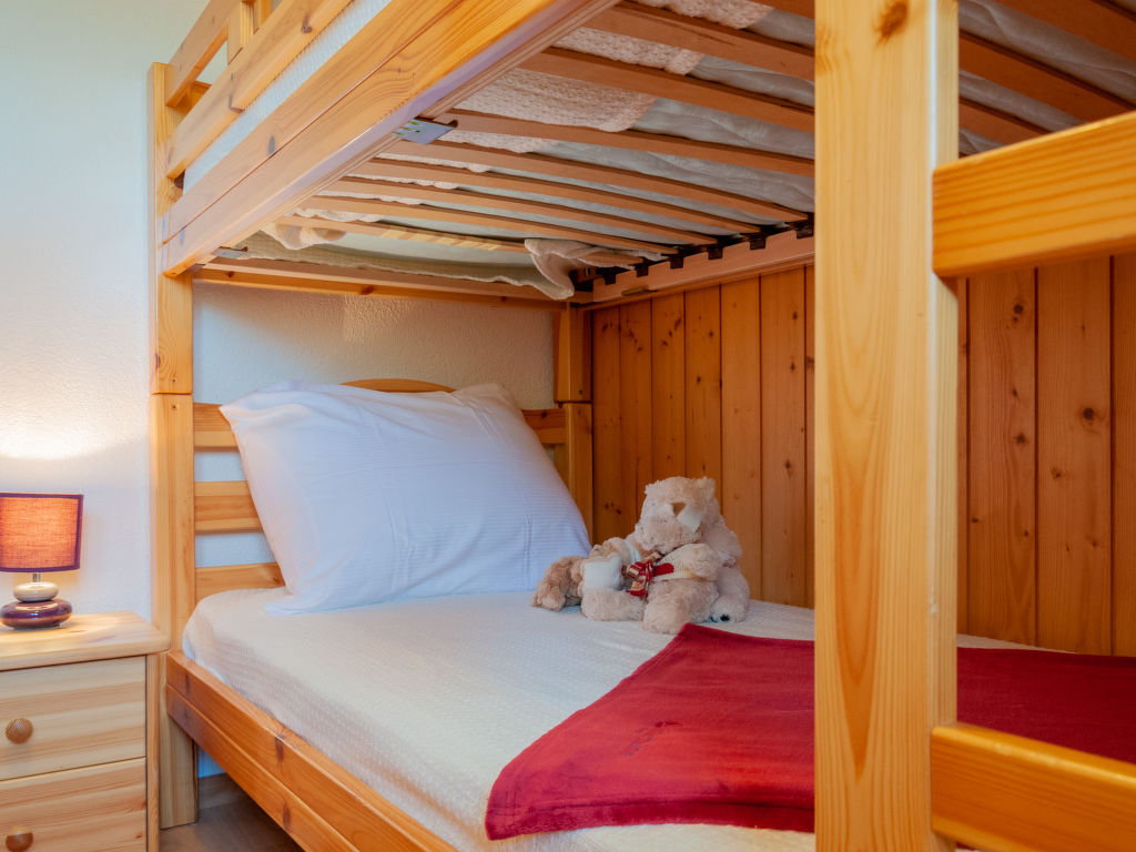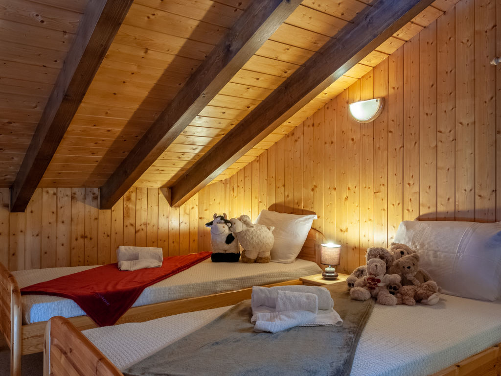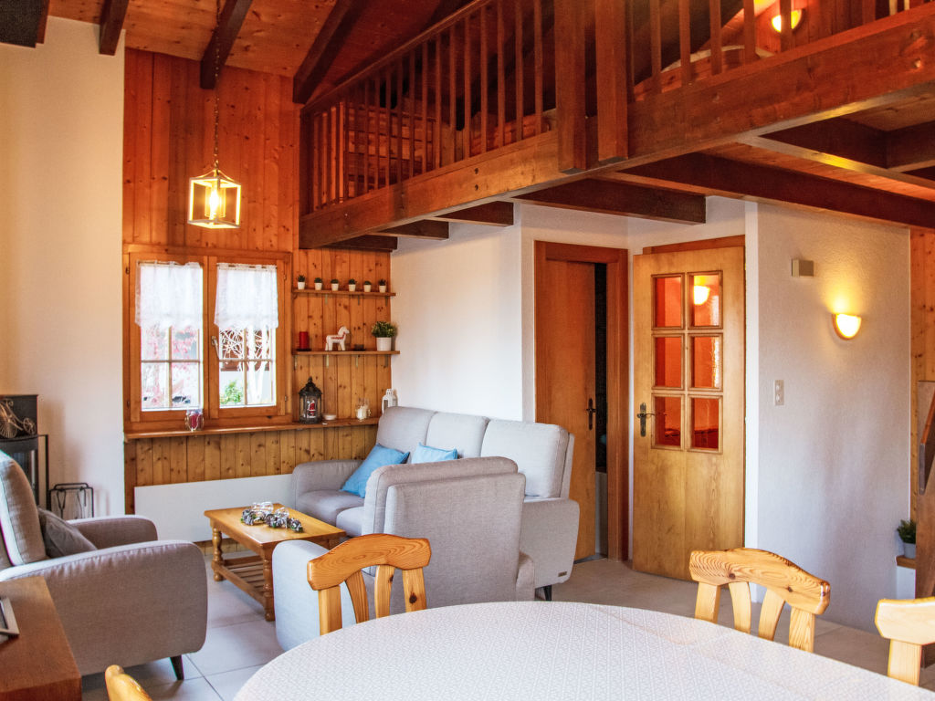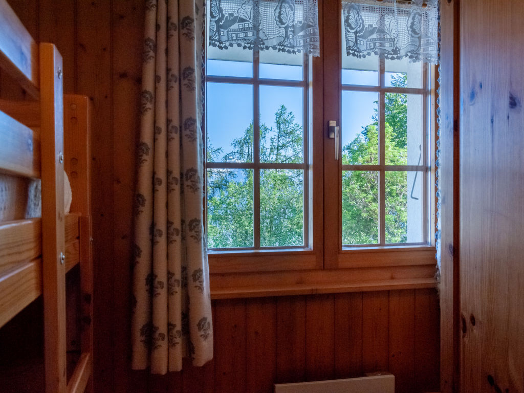 Anusach, 3-Zimmer-Chalet 80 m2 auf 2 Stockwerken. Teilweise renoviert im Jahre 2022, komfortabel und mit viel Holz eingerichtet: kleiner Eingang. Wohn-/Esszimmer mit Schwedenofen und Kabel-TV. Ausgang zur Terrasse, Richtung Norden und Richtung Westen. Offene Küche (Backofen, Geschirrspüler, 4 Glaskeramikplatten, Toaster, Wasserkocher, Mikrowelle, elektrische Kaffeemaschine, Racletteofen, Fondue Set (Käse)). Dusche/WC. E-Heizung. Unteres Geschoss: 1 Zimmer mit 1 franz. Bett (1 x 160 cm, Länge 200 cm). 1 Zimmer mit 1 x 2 Etagenbetten (90 cm, Länge 190 cm). Bad/WC. Obergeschoss: (steile Treppe) abgeschrägte, offene Galerie mit 2 Betten (90 cm, Länge 190 cm). Terrasse, Nordlage. Sehr schöne Sicht auf die Berge und das Tal. Zur Verfügung: Waschmaschine, Haartrockner. Internet (Wireless LAN, gratis). Garage (1 Auto), Höhe 200 cm, Breite 225 cm. Bitte beachten: Nichtraucher-Unterkunft. 1 kleines Haustier/Hund erlaubt. Anstelle eines abgeschlossenen Schlafzimmers befinden sich manche Schlafplätze in einem offenen Bereich (Galerie, Nische etc.).