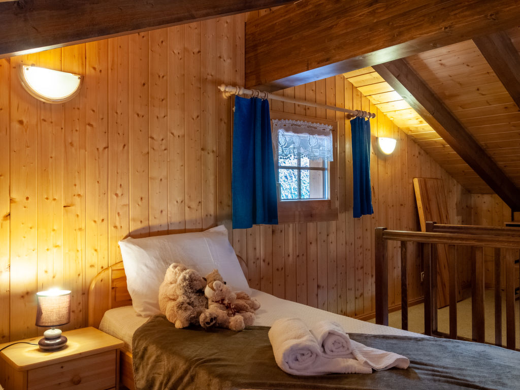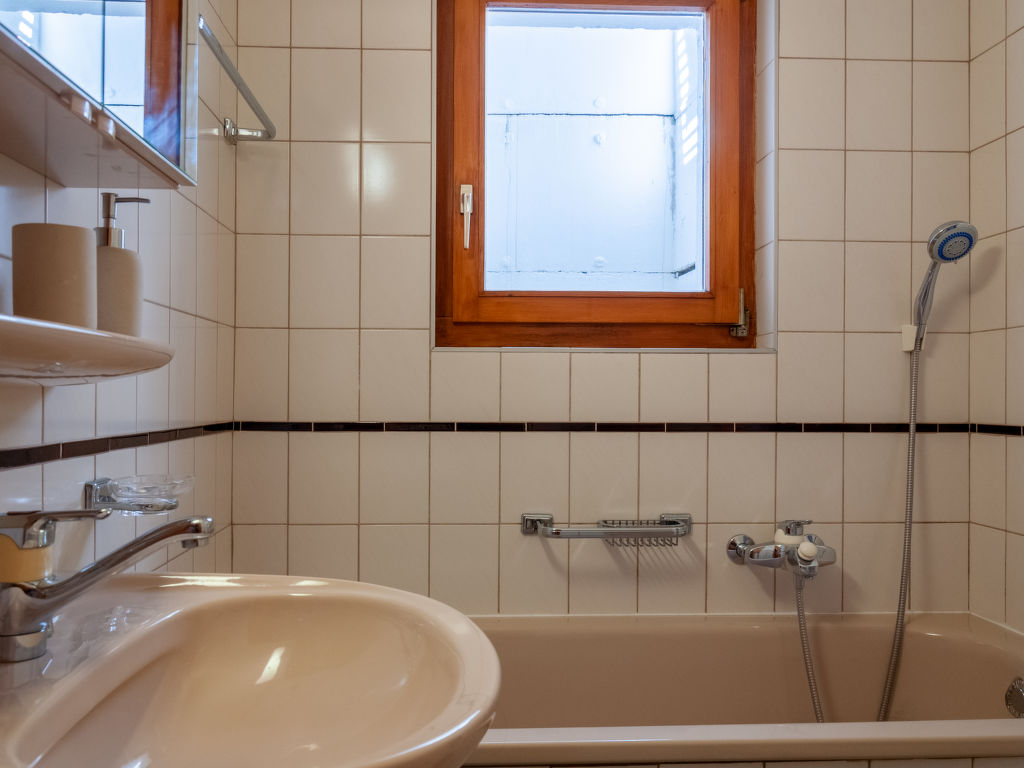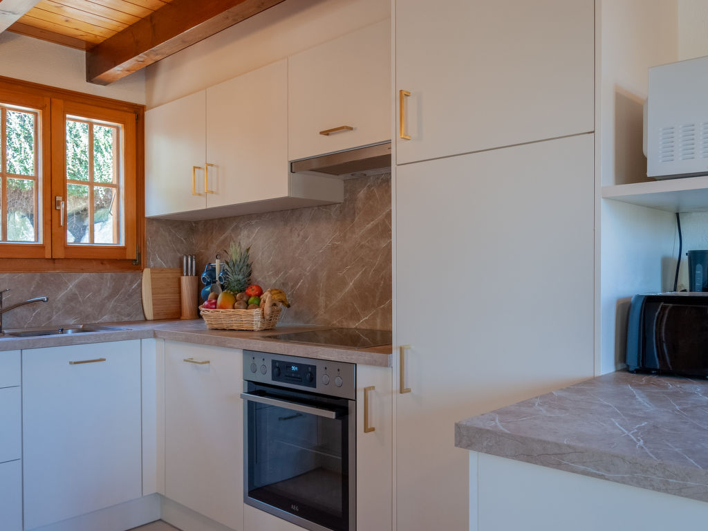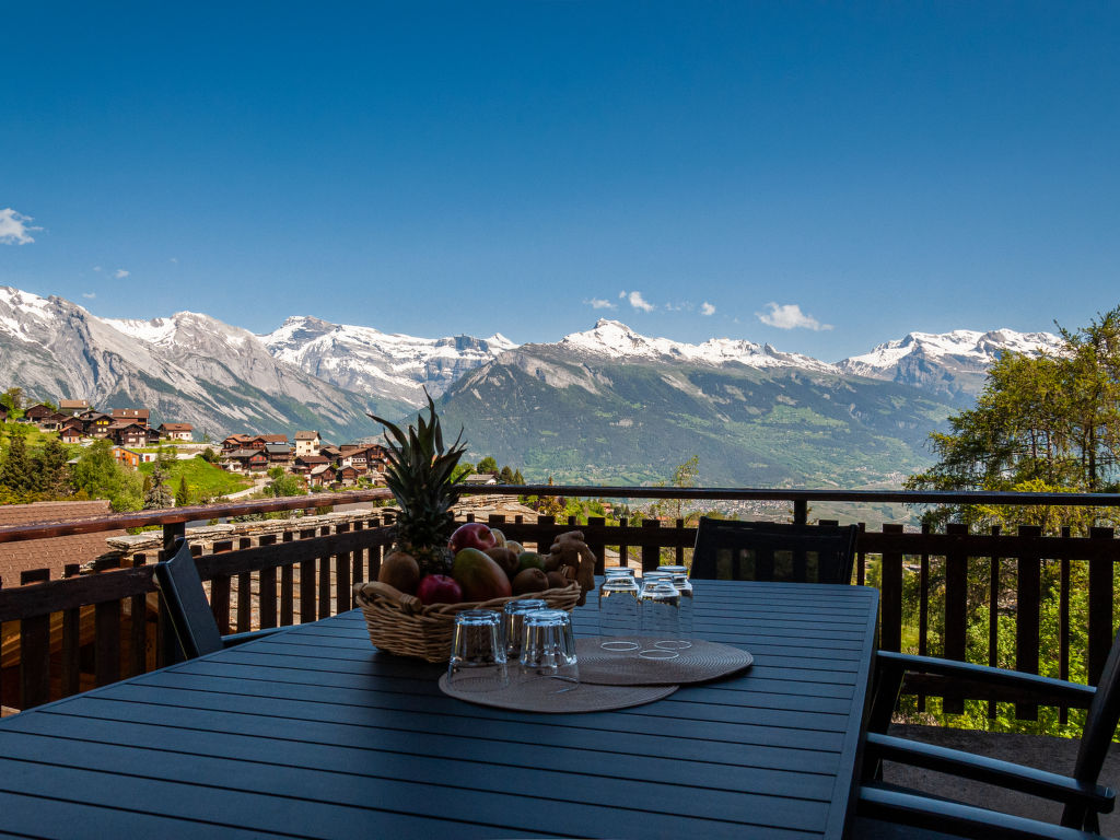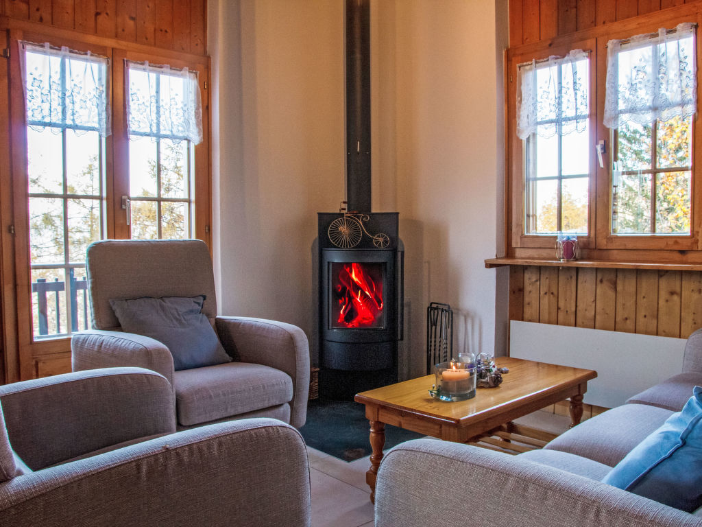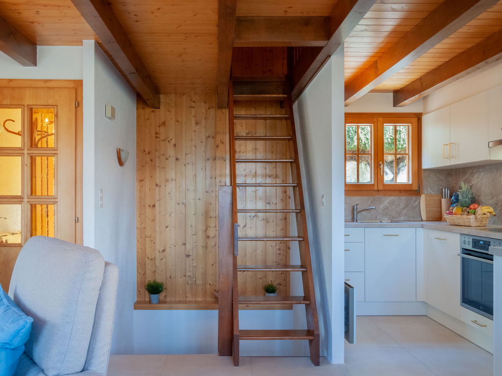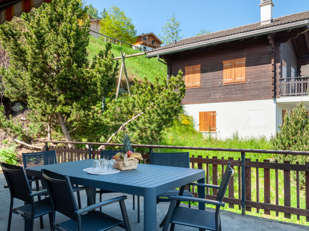 Anusach, 3-Zimmer-Chalet 80 m2 auf 2 Stockwerken. Teilweise renoviert im Jahre 2022, komfortabel und mit viel Holz eingerichtet: kleiner Eingang. Wohn-/Esszimmer mit Schwedenofen und Kabel-TV. Ausgang zur Terrasse, Richtung Norden und Richtung Westen. Offene Küche (Backofen, Geschirrspüler, 4 Glaskeramikplatten, Toaster, Wasserkocher, Mikrowelle, elektrische Kaffeemaschine, Racletteofen, Fondue Set (Käse)). Dusche/WC. E-Heizung. Unteres Geschoss: 1 Zimmer mit 1 franz. Bett (1 x 160 cm, Länge 200 cm). 1 Zimmer mit 1 x 2 Etagenbetten (90 cm, Länge 190 cm). Bad/WC. Obergeschoss: (steile Treppe) abgeschrägte, offene Galerie mit 2 Betten (90 cm, Länge 190 cm). Terrasse, Nordlage. Sehr schöne Sicht auf die Berge und das Tal. Zur Verfügung: Waschmaschine, Haartrockner. Internet (Wireless LAN, gratis). Garage (1 Auto), Höhe 200 cm, Breite 225 cm. Bitte beachten: Nichtraucher-Unterkunft. 1 kleines Haustier/Hund erlaubt. Anstelle eines abgeschlossenen Schlafzimmers befinden sich manche Schlafplätze in einem offenen Bereich (Galerie, Nische etc.).