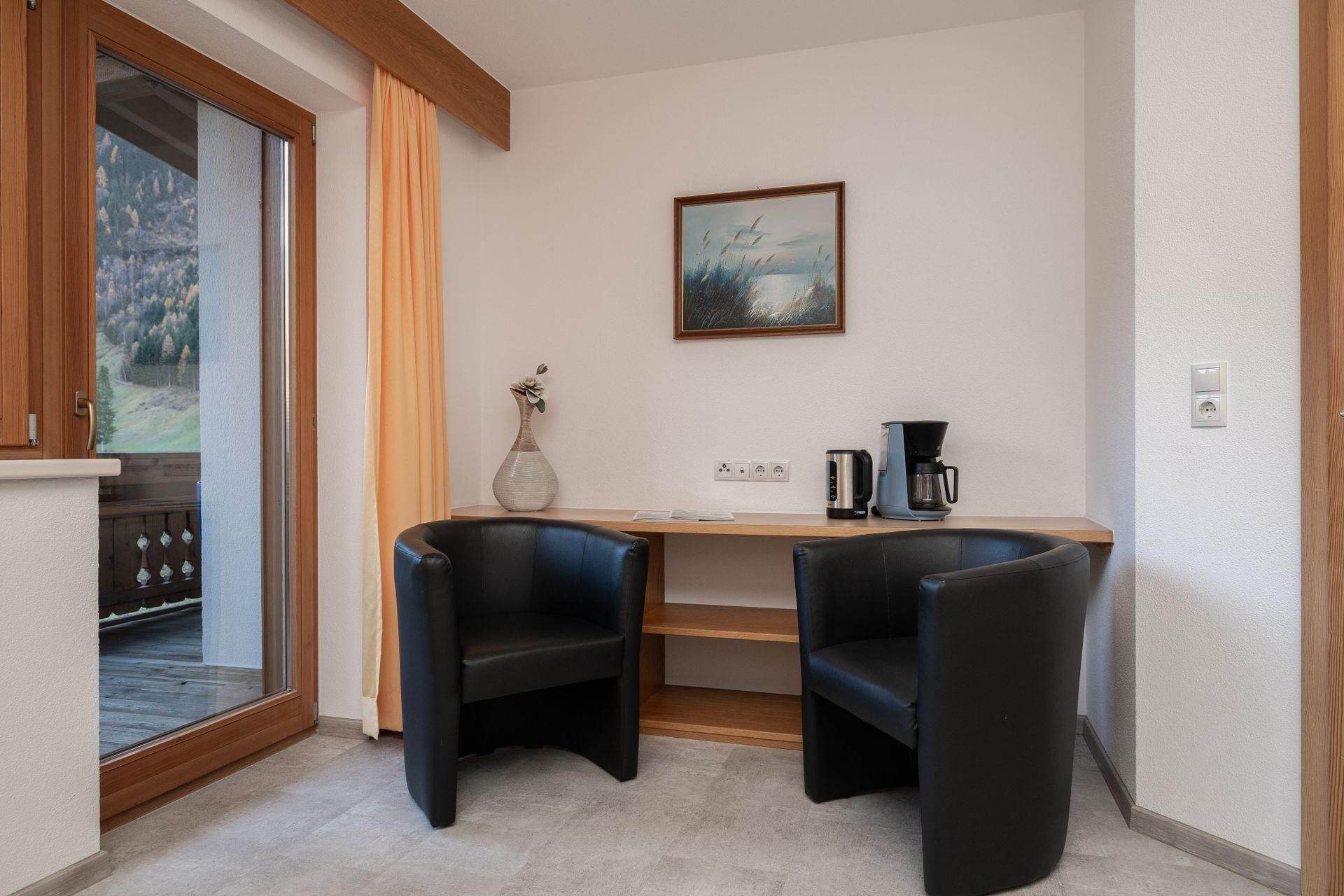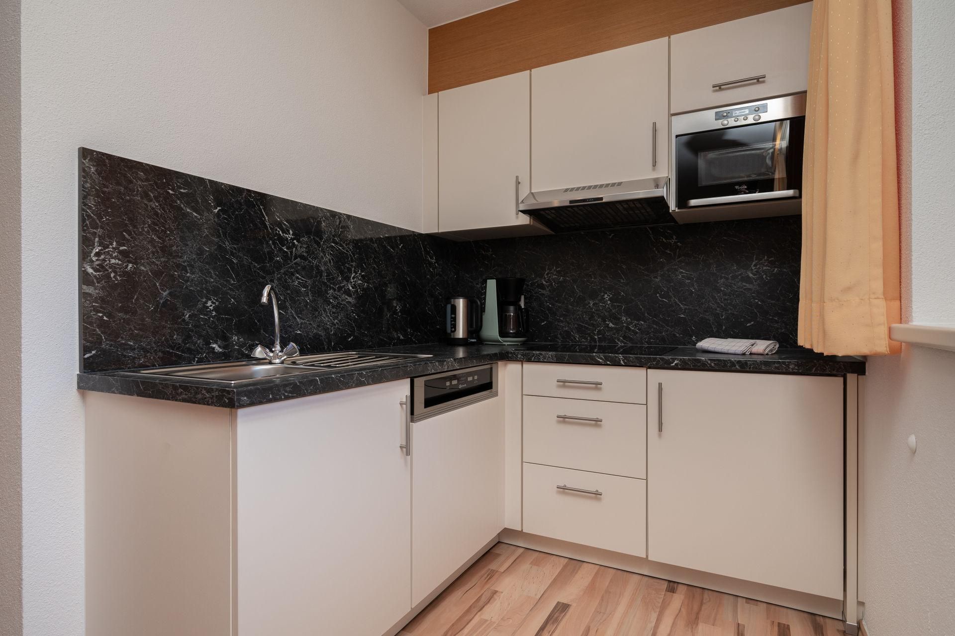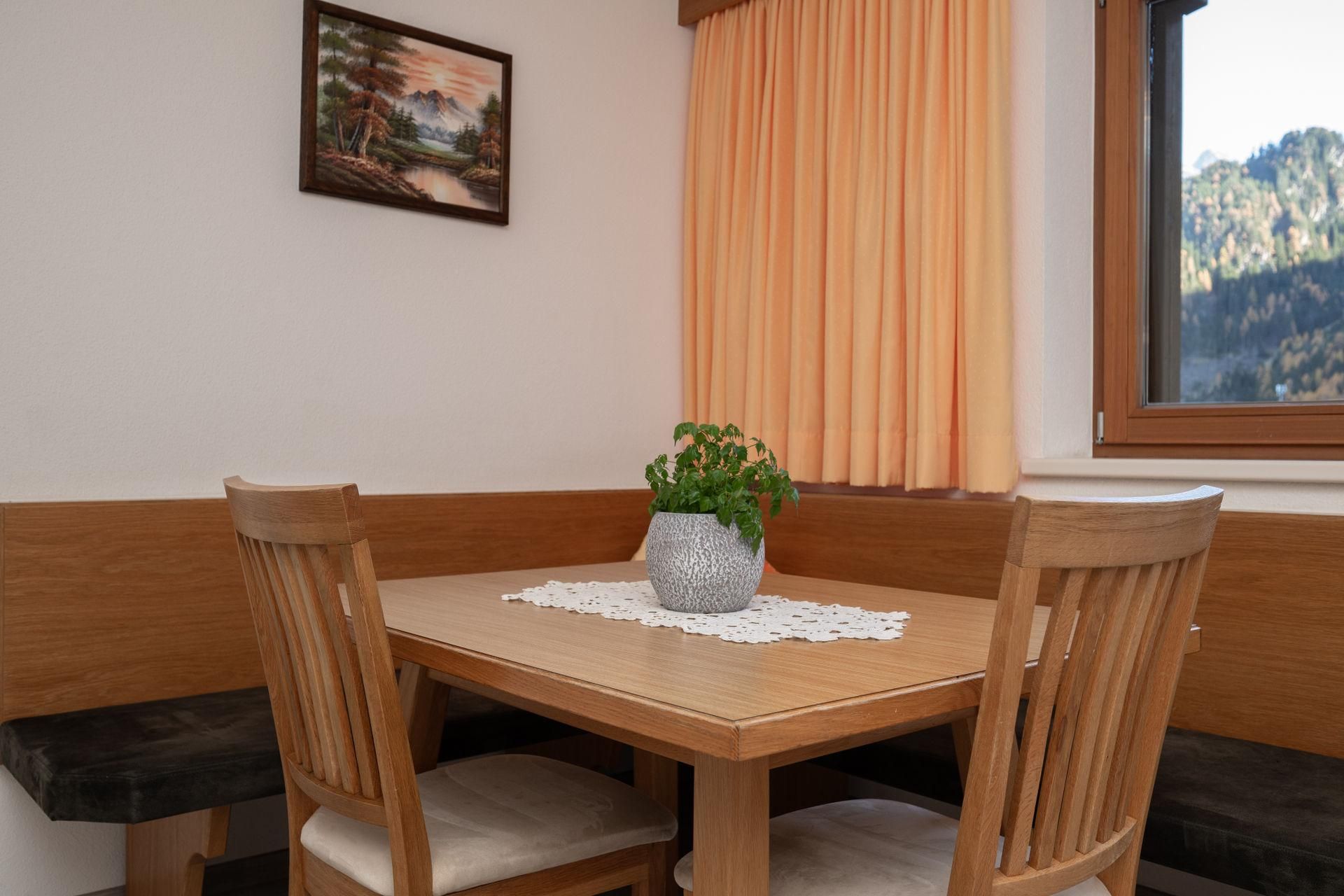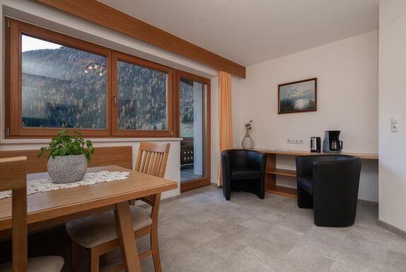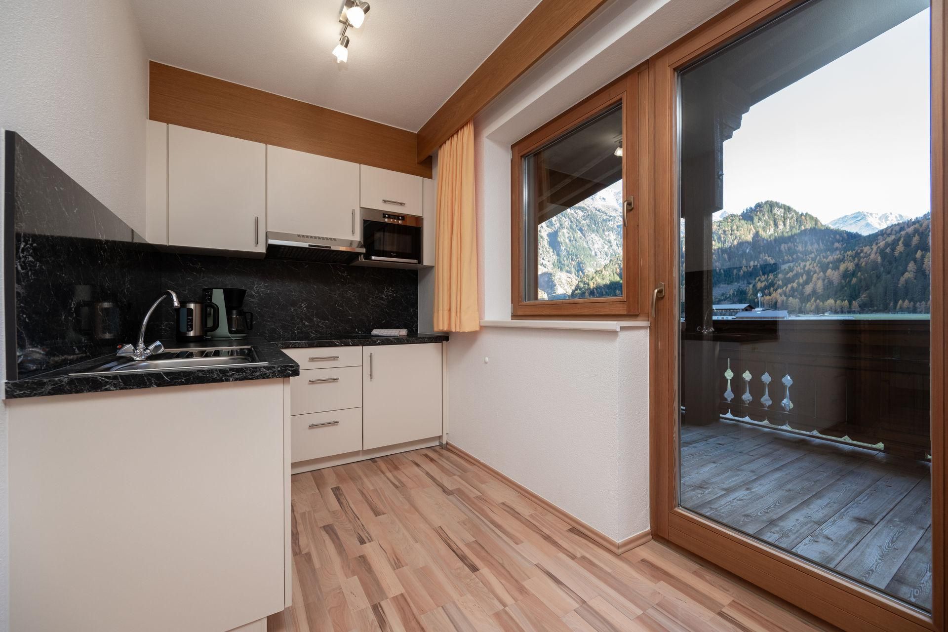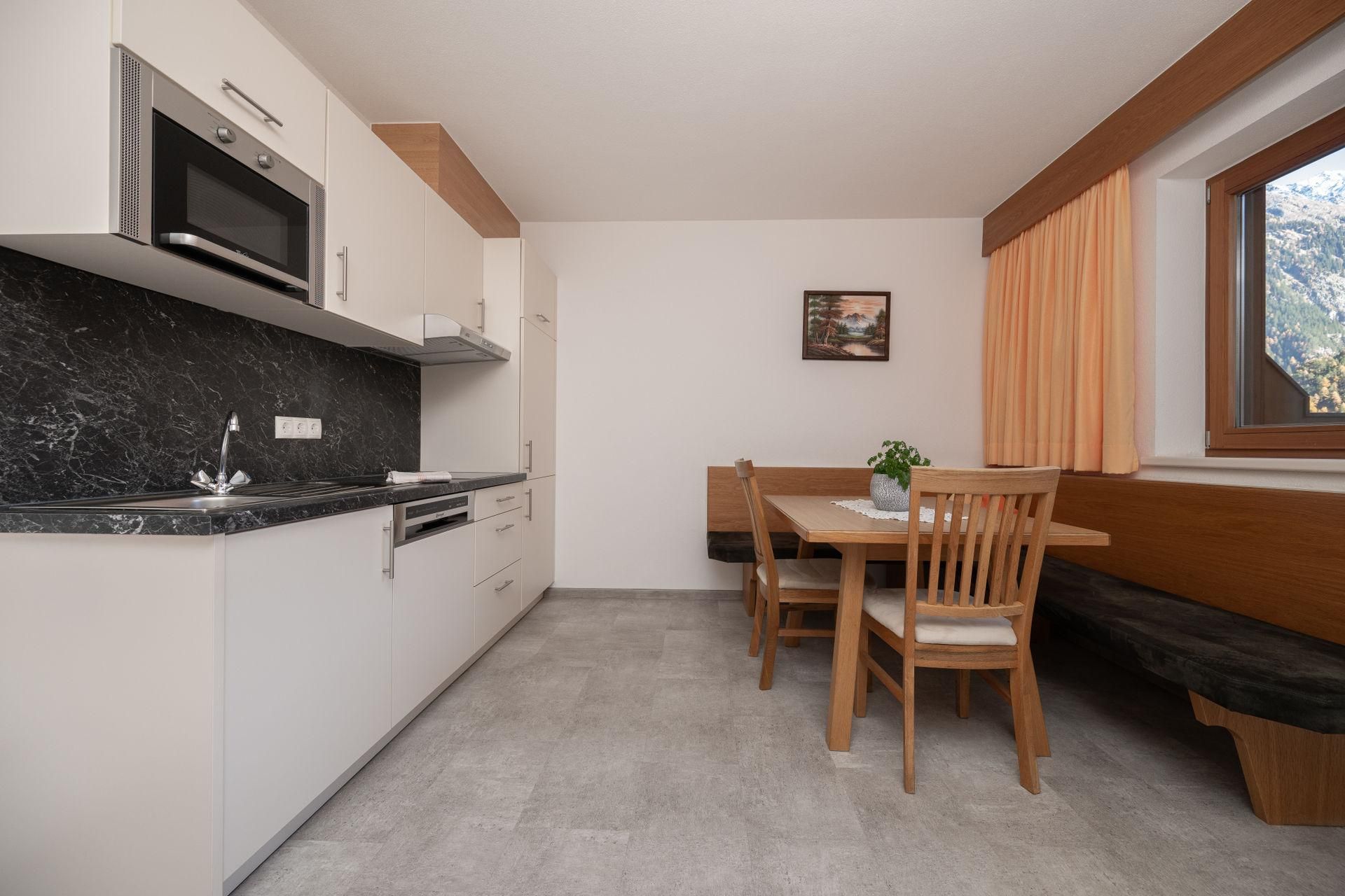 Appartement „Edelweiss“ mit ca. 61 m²: 2 getrennte Doppelzimmer mit je einem Badezimmer mit Dusche/WC, eine voll ausgestattete Wohnküche mit Sitzecke Mikrowelle, Cerankochfeld, Kühlschrank, Kaffeemaschine, Toaster, Spülmaschine, Wasserkocher uvm. Vorraum mit Garderobe. Großer möblierter Balkon in Richtung Süden.