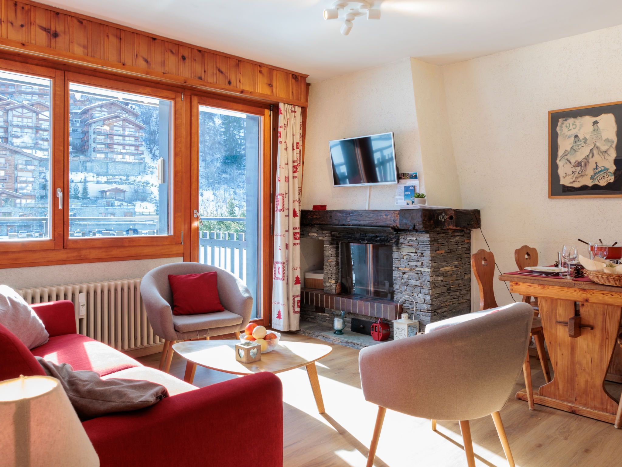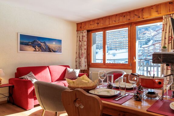 Ecluses 2, 3-Zimmer-Wohnung 62 m2 im 1. Stock. Teilweise renoviert im Jahre 2026, komfortabel eingerichtet: Wohn-/Esszimmer mit offenem Kamin (nur Deko), Kabel-TV. Ausgang zum Balkon. 1 Zimmer mit 1 Bett (90 cm, Länge 190 cm), 1 x 2 Etagenbetten (90 cm, Länge 190 cm). Ausgang zum Balkon, Richtung Süden. 1 Zimmer mit 1 franz. Bett (160 cm, Länge 190 cm). Ausgang zum Balkon, Richtung Süden. Offene Küche (Backofen, Geschirrspüler, 4 Glaskeramikplatten, Toaster, Wasserkocher, elektrische Kaffeemaschine, Fondue Set (Chinoise, Käse)). Dusche/WC, sep. WC. Balkon, Südlage. Balkonmöbel. Sicht auf die Ortschaft. Zur Verfügung: Haartrockner. Internet (WLAN, gratis). Parkplatz Nr. 2 (überdacht), Höhe 270 cm, Breite 240 cm. Bitte beachten: Nichtraucher-Unterkunft.