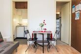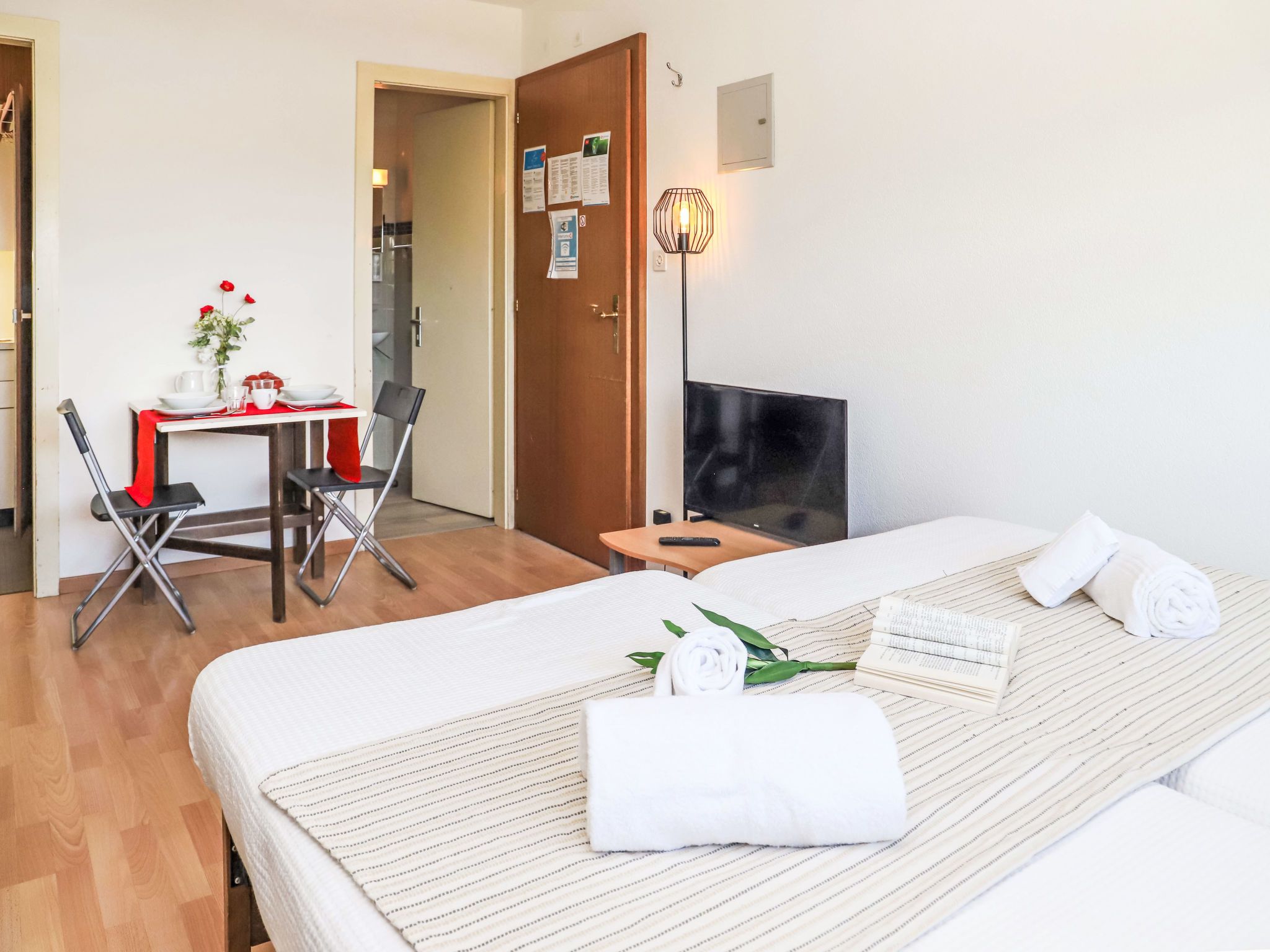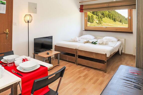 Rosablanche C25, 1-Zimmer-Wohnung 20 m2 im 2. Stock, Nordlage. Einfach eingerichtet: Wohn-/Schlafzimmer mit 1 Ausziehbett (2 Pers. 2 x 90 cm, Länge 190 cm), Kabel-TV. Kochnische (2 Glaskeramikplatten, Wasserkocher, Fondue Set (Chinoise)). Dusche/WC. Sicht auf die Berge. Zur Verfügung: Internet (WLAN, gratis). Bitte beachten: Nichtraucher-Haus. Aufzug C.