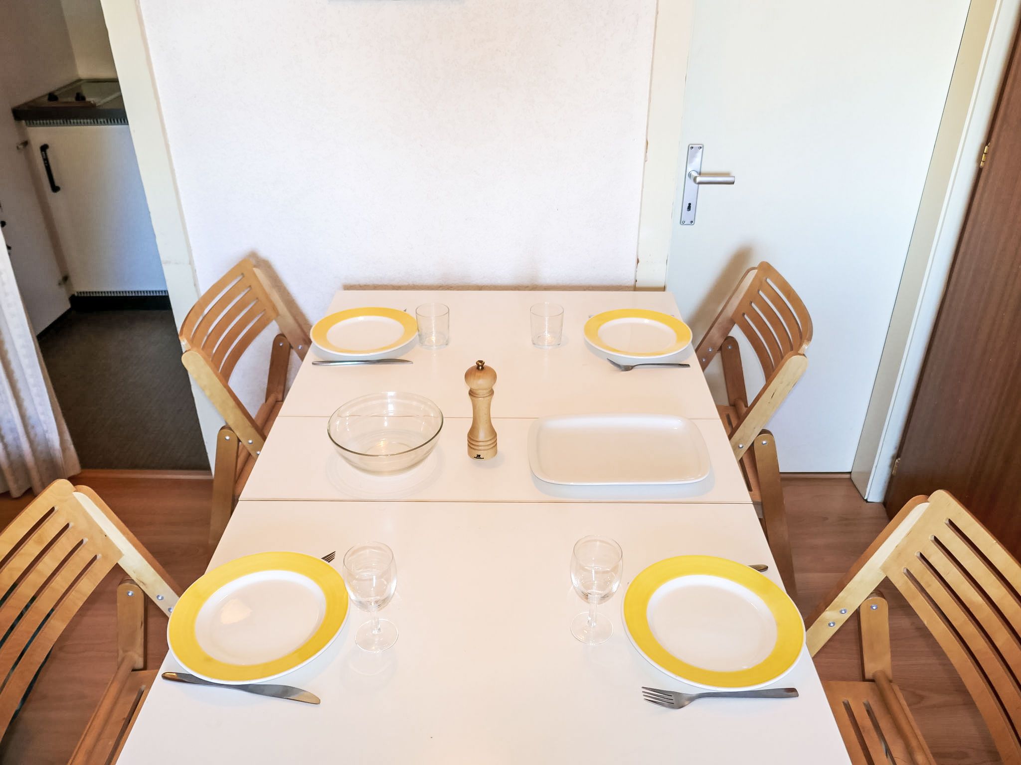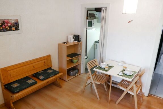 Rosablanche C15, 1-Zimmer-Studio 18 m2 im 1. Stock, Nordlage. Einfach eingerichtet: Wohn-/Schlafzimmer mit 1 Ausziehbett (2 Pers. 2 x 90 cm, Länge 190 cm), Kabel-TV und Radio. Kleine Kochnische (2 Glaskeramikplatten, Mikrowelle, elektrische Kaffeemaschine, Kapseln für die Kaffeemaschine (Nespresso) extra). Dusche/WC. Sicht auf die Berge und die Ortschaft. Zur Verfügung: Internet (WLAN, gratis). Bitte beachten: Nichtraucher-Haus.