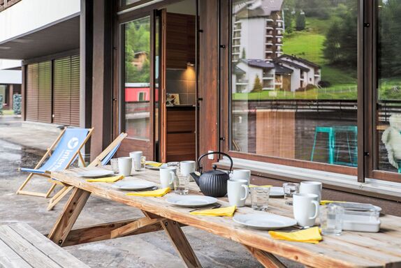 Rosablanche 205, 5-Zimmer-Wohnung 159 m2, im erhöhten Erdgeschoss. Geräumig, modern und mit viel Holz eingerichtet: Wohn-/Esszimmer mit Panoramafenster mit Kabel-TV. 1 grosses Zimmer mit 1 franz. Bett (160 cm, Länge 200 cm), Bad/WC, Doppelwaschbecken und mit Eckbadewanne. 1 Zimmer mit 2 Betten (90 cm, Länge 190 cm). Ausgang zum Balkon, Richtung Norden und Richtung Osten. 1 Zimmer mit Panoramafenster mit 2 Betten (90 cm, Länge 190 cm), Waschbecken und Dusche. Ausgang zum Balkon, Richtung Norden und Richtung Osten. 1 kleines Kinderzimmer mit 2 Betten (90 cm, Länge 190 cm). Grosse, offene Küche (Backofen, Geschirrspüler, 4 Induktionskochplatten, Toaster, Wasserkocher, Mikrowelle, Tiefkühler, elektrische Kaffeemaschine, Racletteofen, Fondue Set (Chinoise)) mit Esstisch. Ausgang zur Terrasse. Dusche/WC, sep. WC. Terrasse, Südlage. Terrassenmöbel. Sicht auf die Berge. Zur Verfügung: Haartrockner. Internet (Wireless LAN, gratis). Garage Nr. 75. Bitte beachten: Nichtraucher-Haus. Aufzug E.