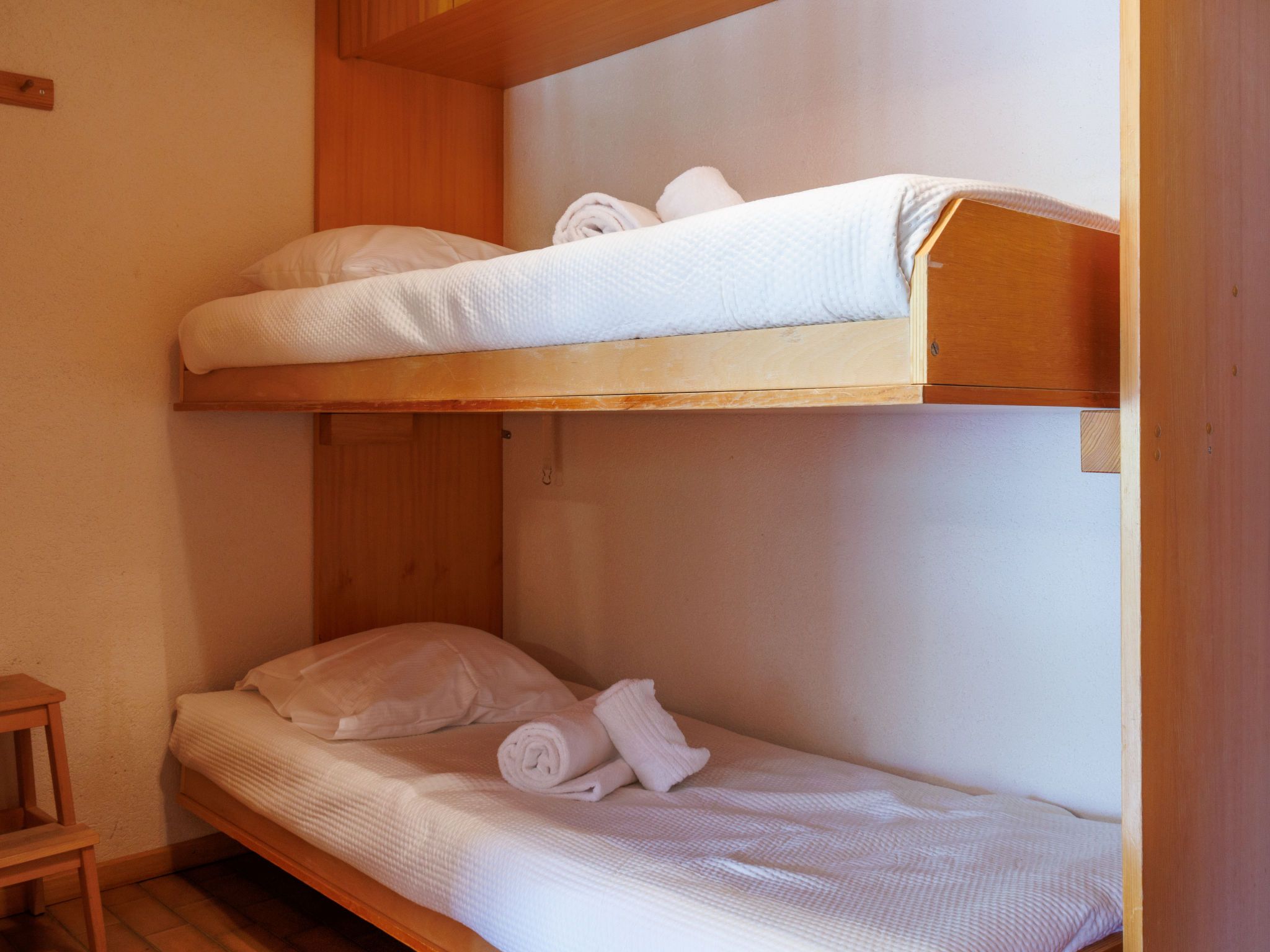 Dents Rousses H2, 2-Zimmer-Wohnung 45 m2 im 2. Stock. Einfach eingerichtet: Eingang mit 1 x 2 Etagenbetten (80 cm, Länge 190 cm). Wohn-/Esszimmer mit Kabel-TV. Ausgang zum Balkon, Richtung Süden. 1 Zimmer mit 1 Doppelbett (2 x 90 cm, Länge 200 cm). Kochnische (3 Kochplatten, Backofen, Geschirrspüler, Toaster, Wasserkocher). Bad/WC. Balkon, Südlage. Zur Verfügung: Haartrockner. Internet (WLAN). Garage Nr. 7, Höhe 210 cm, Breite 200 cm. Bitte beachten: Nichtraucher-Haus, Parkplatz nur für kleine Wagen. Kamin ausser Betrieb. Anstelle eines abgeschlossenen Schlafzimmers befinden sich manche Schlafplätze in einem offenen Bereich (Galerie, Nische etc.).