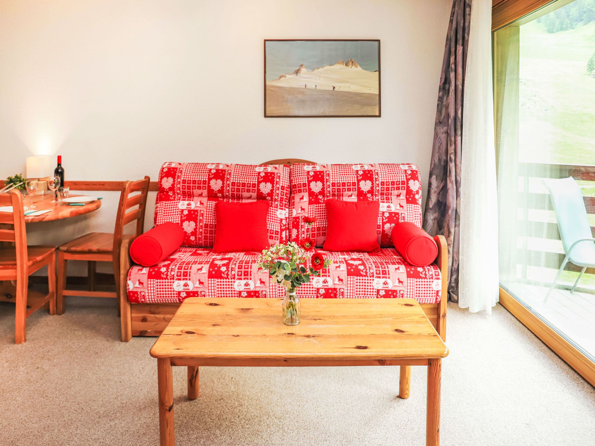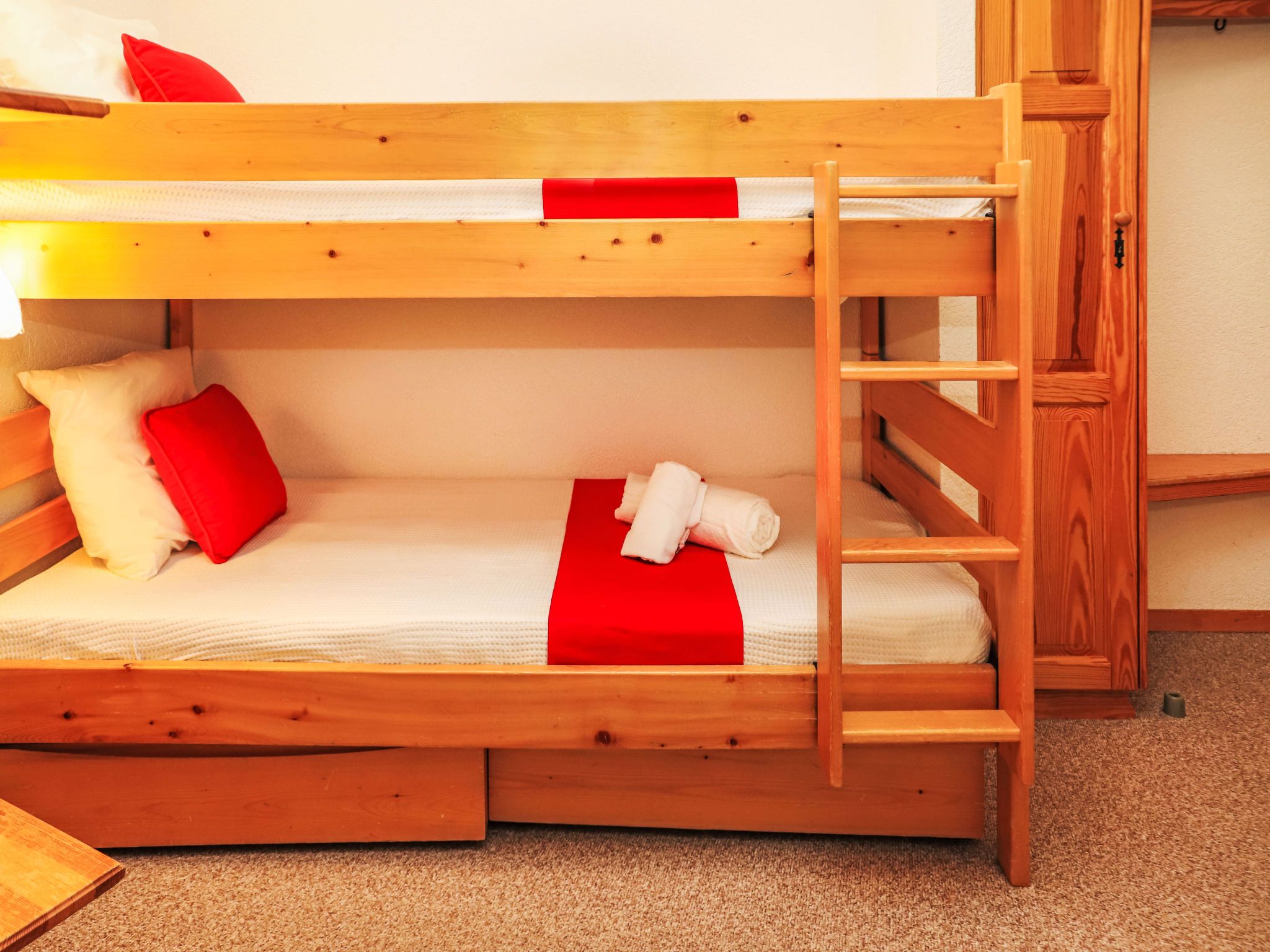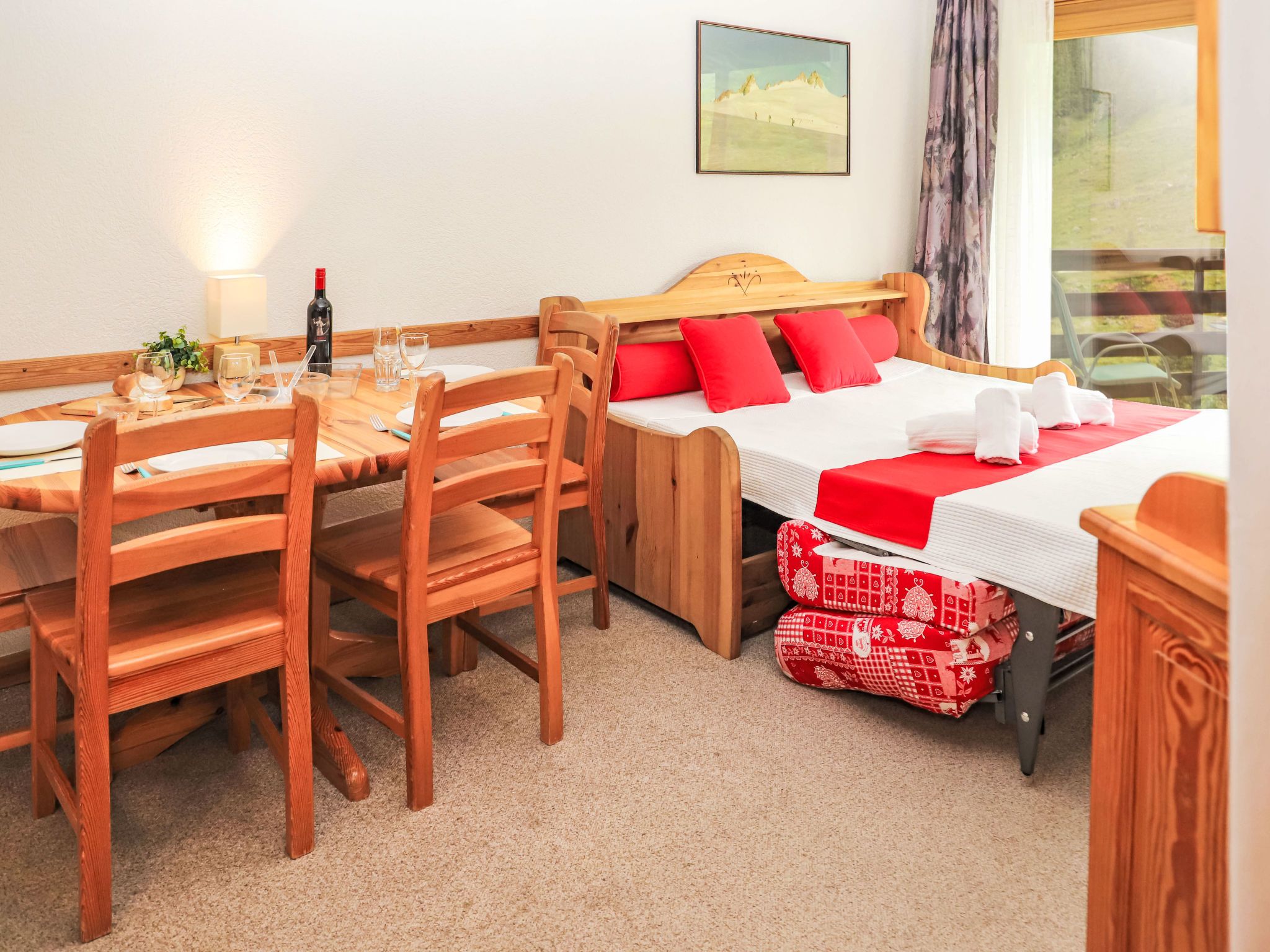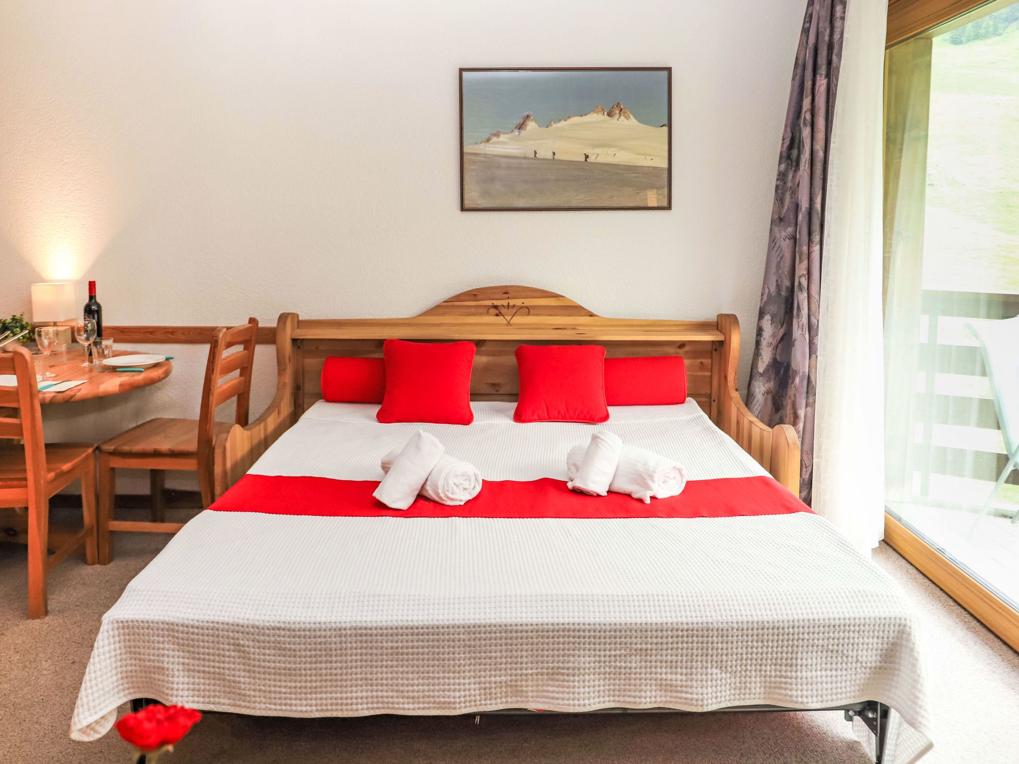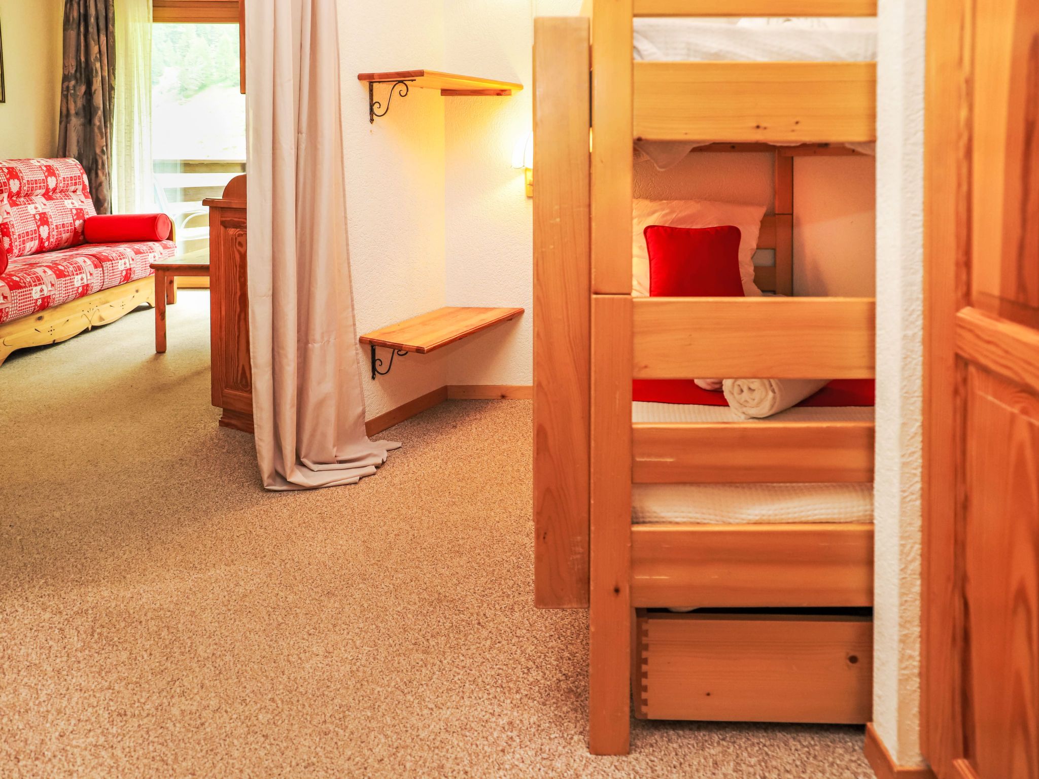 Mont Fort 55, 1-Zimmer-Wohnung 35 m2 im 5. Stock. Wohn-/Esszimmer mit 1 Doppeldiwanbett (160 cm, Länge 190 cm), Kabel-TV, CD und DVD. Eingang mit 1 x 2 Etagenbetten (90 cm, Länge 180 cm). Offene Küche (2 Kochplatten, Toaster, Wasserkocher, Mikrowelle, elektrische Kaffeemaschine, Racletteofen, Fondue Set (Käse)). Bad/WC. Balkon, Südostlage. Zur Verfügung: Haartrockner. Internet (Wireless LAN). Bitte beachten: Nichtraucher-Unterkunft, Nichtraucher-Haus. Anstelle eines abgeschlossenen Schlafzimmers befinden sich manche Schlafplätze in einem offenen Bereich (Galerie, Nische etc.).