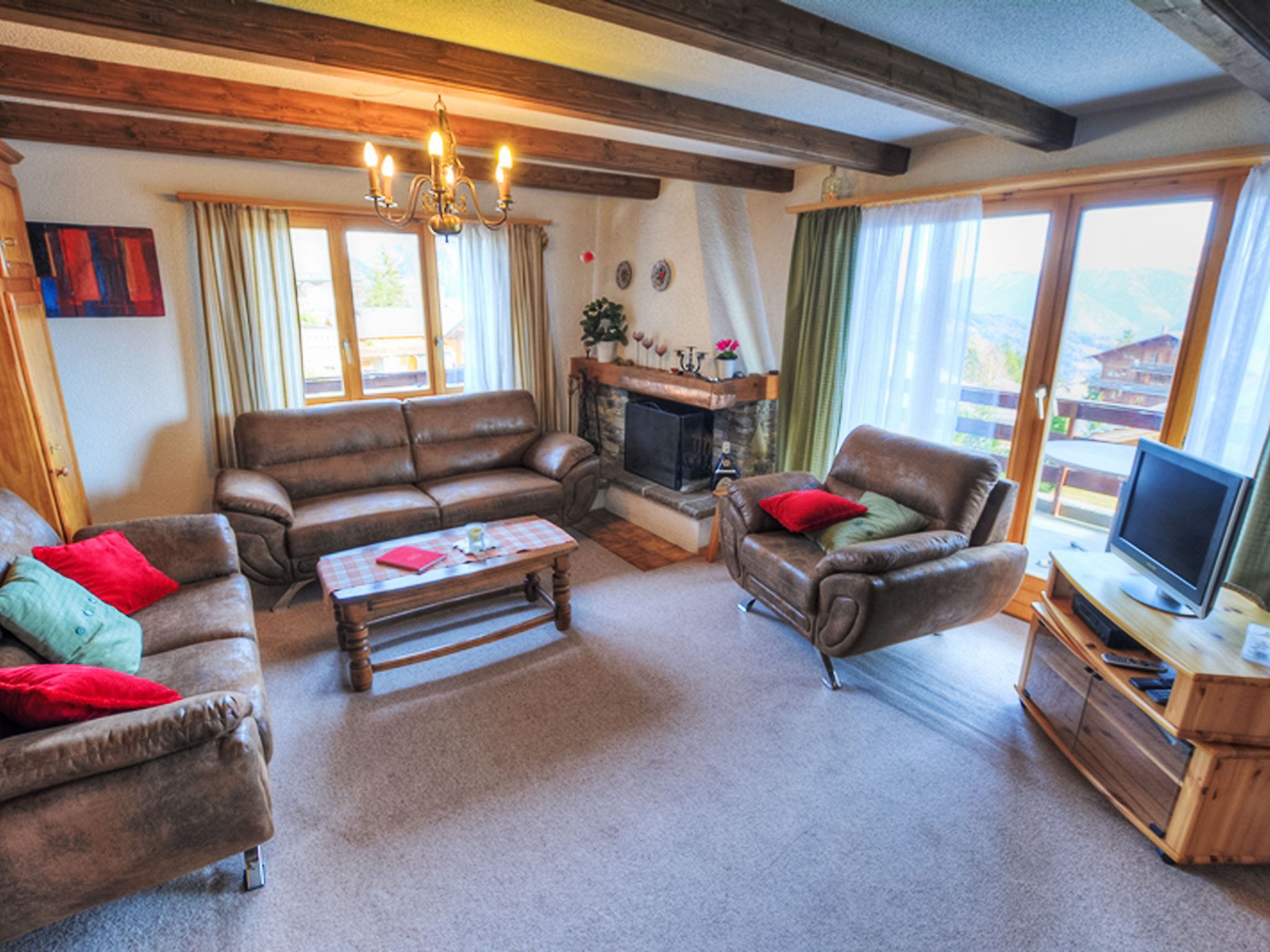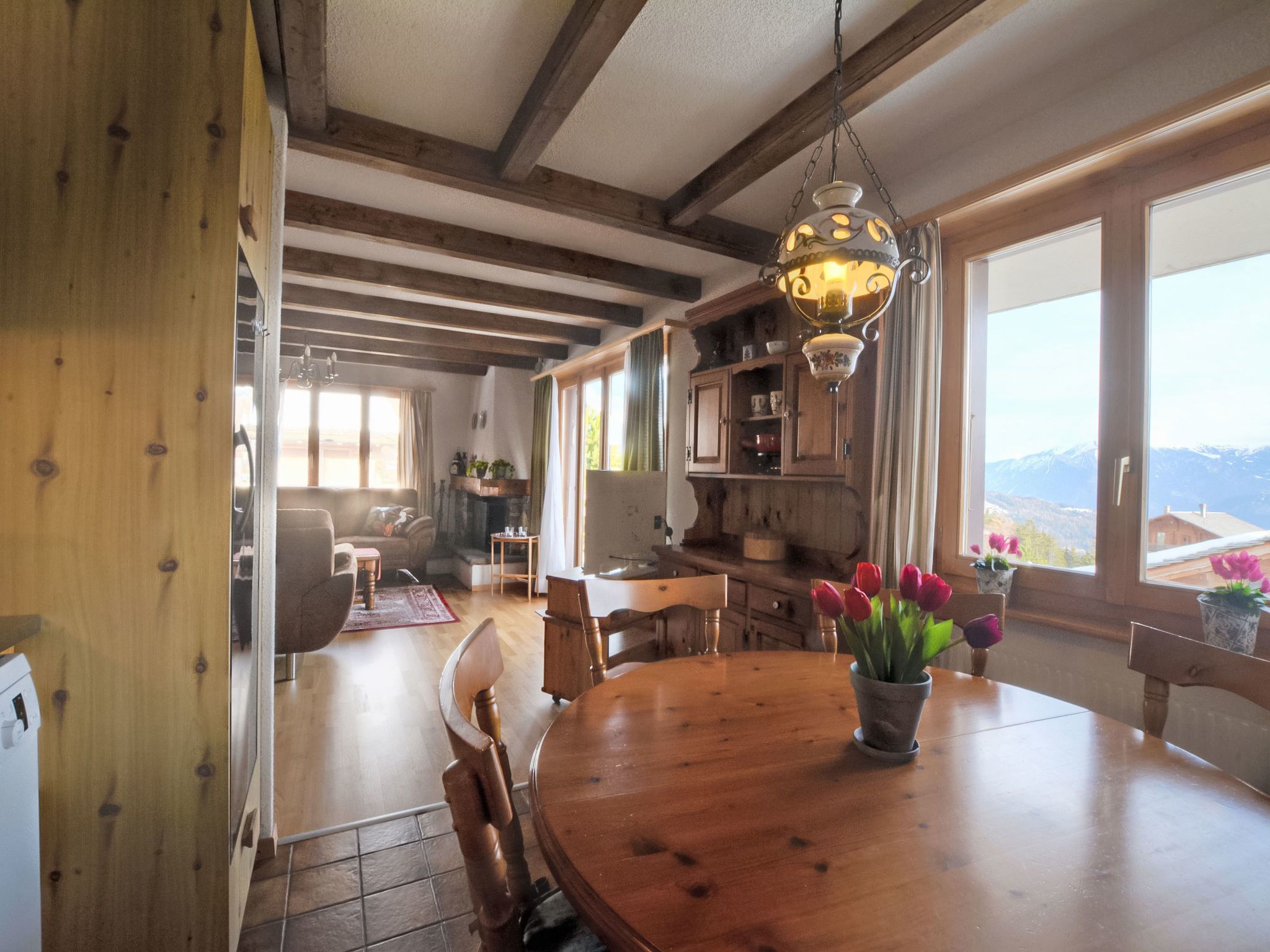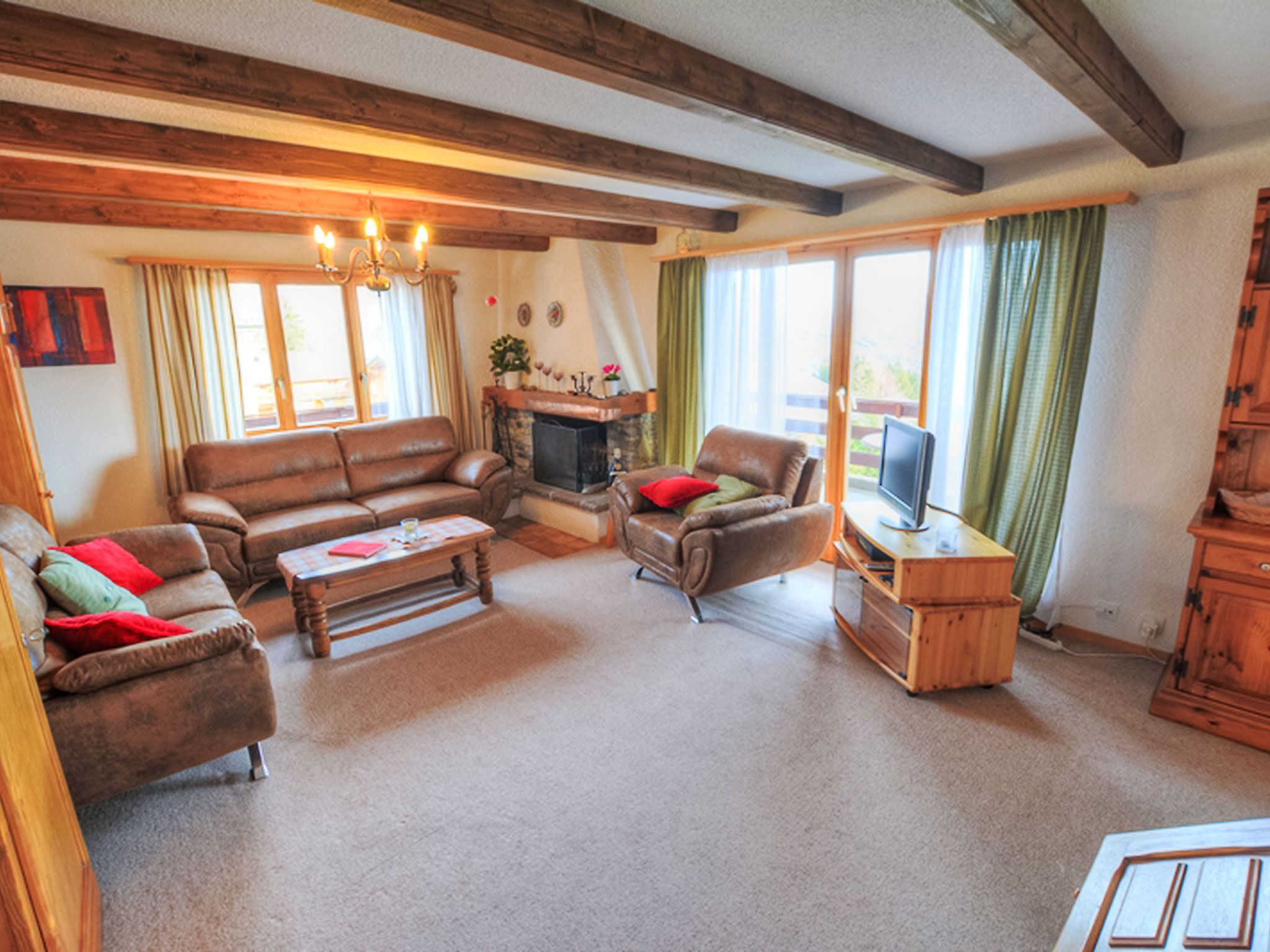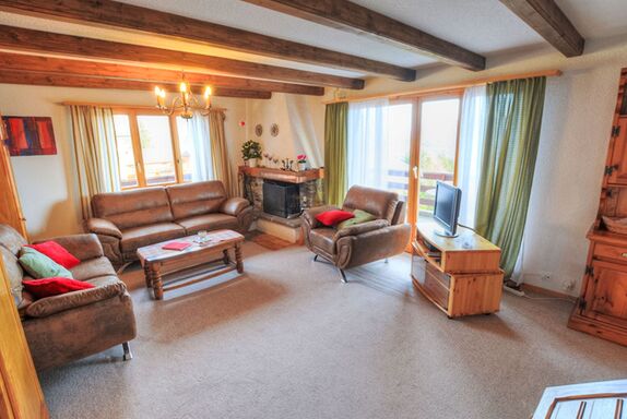 3-Zimmer-Wohnung 75 m2 im 1. Stock. Zweckmässig und gemütlich eingerichtet: Wohn-/Esszimmer mit offenem Kamin, Essecke, Kabel-TV und DVD. Ausgang zum Balkon, Richtung Süden und Richtung Osten. 1 Doppelzimmer mit 1 franz. Bett. 1 Zimmer mit 1 Bett und 1 x 2 Etagenbetten. Offene Küche (4 Kochplatten, Geschirrspüler, Mikrowelle). Bad/WC, sep. WC. Balkonmöbel. Sehr schöne Sicht auf die Berge und die Landschaft. Zur Verfügung: Internet (Wireless LAN, gratis). Bitte beachten: Nichtraucher-Unterkunft.