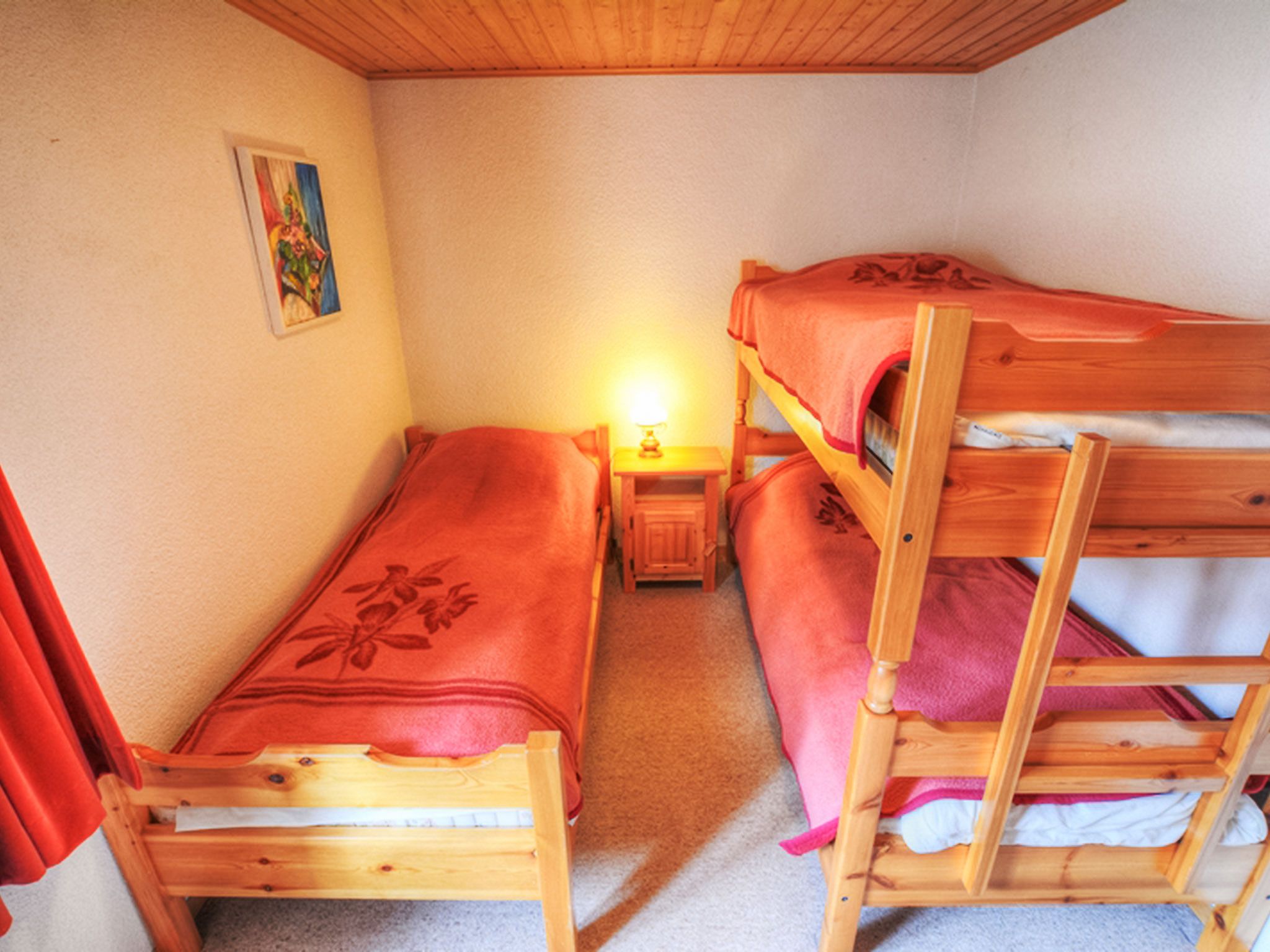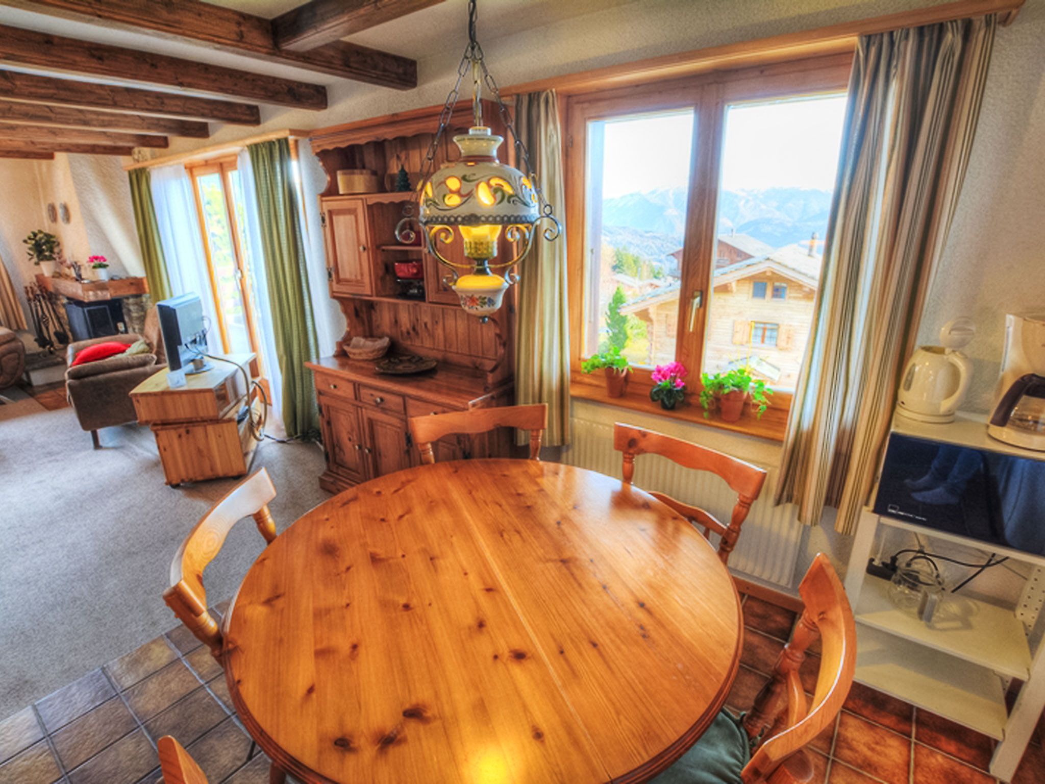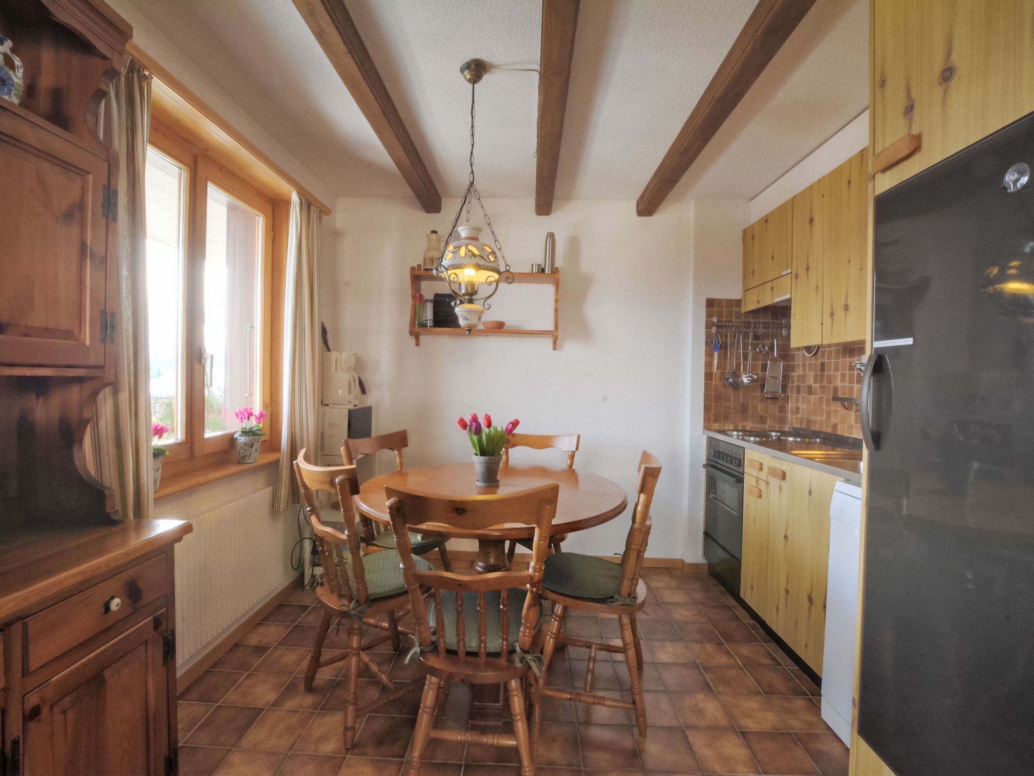 3-Zimmer-Wohnung 75 m2 im 1. Stock. Zweckmässig und gemütlich eingerichtet: Wohn-/Esszimmer mit offenem Kamin, Essecke, Kabel-TV und DVD. Ausgang zum Balkon, Richtung Süden und Richtung Osten. 1 Doppelzimmer mit 1 franz. Bett. 1 Zimmer mit 1 Bett und 1 x 2 Etagenbetten. Offene Küche (4 Kochplatten, Geschirrspüler, Mikrowelle). Bad/WC, sep. WC. Balkonmöbel. Sehr schöne Sicht auf die Berge und die Landschaft. Zur Verfügung: Internet (Wireless LAN, gratis). Bitte beachten: Nichtraucher-Unterkunft.