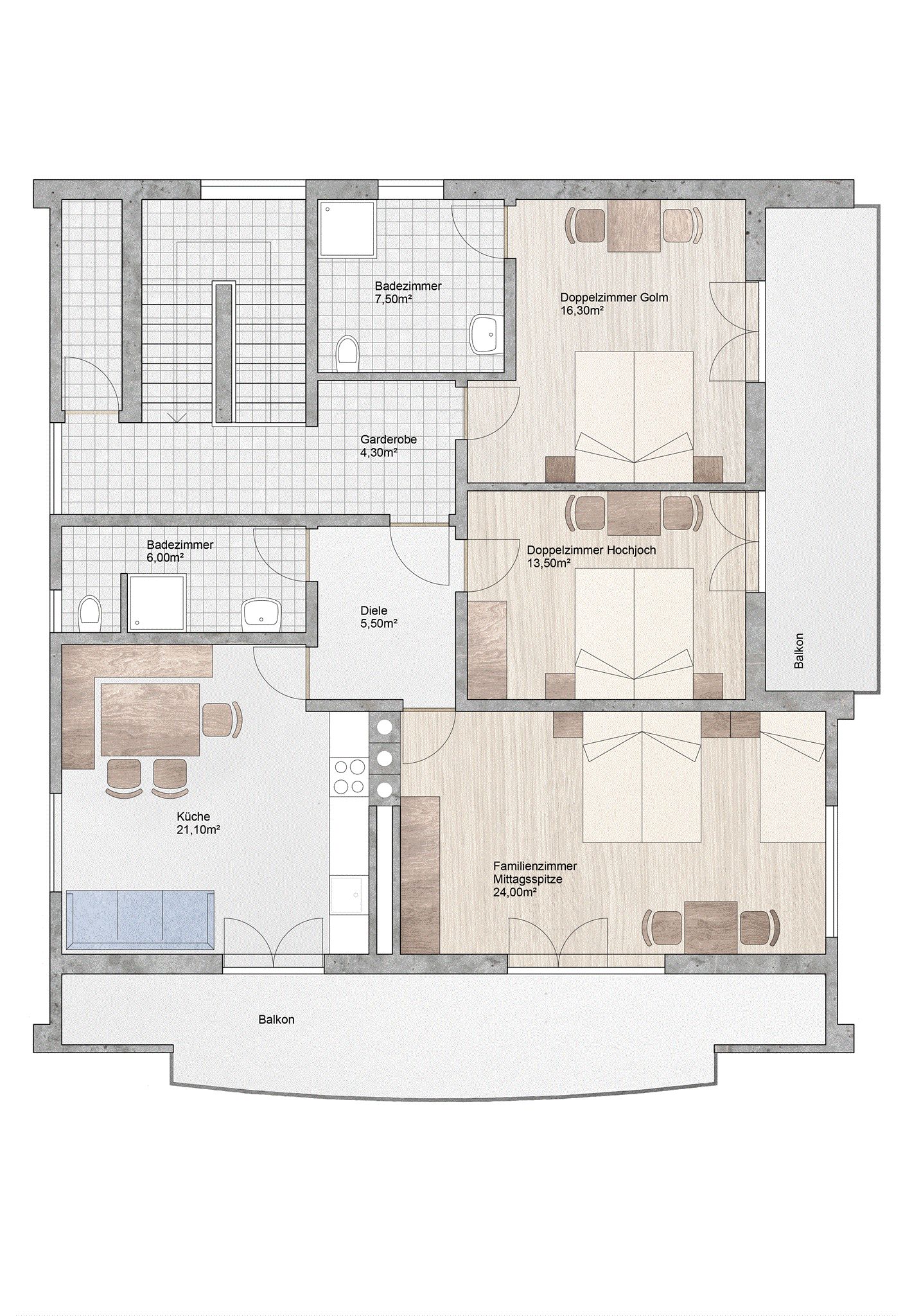 Die Fewo beeinhaltet 1 Doppelzimmer mit Balkon und Du/WC. 1 Doppelzimmer mit Balkon. 1 Dreibettzimmer mit Balkon. 1 seperate Dusche mit WC. Eine Wohnküche mit Sitzgelegenheit und Sofa sowie TV.