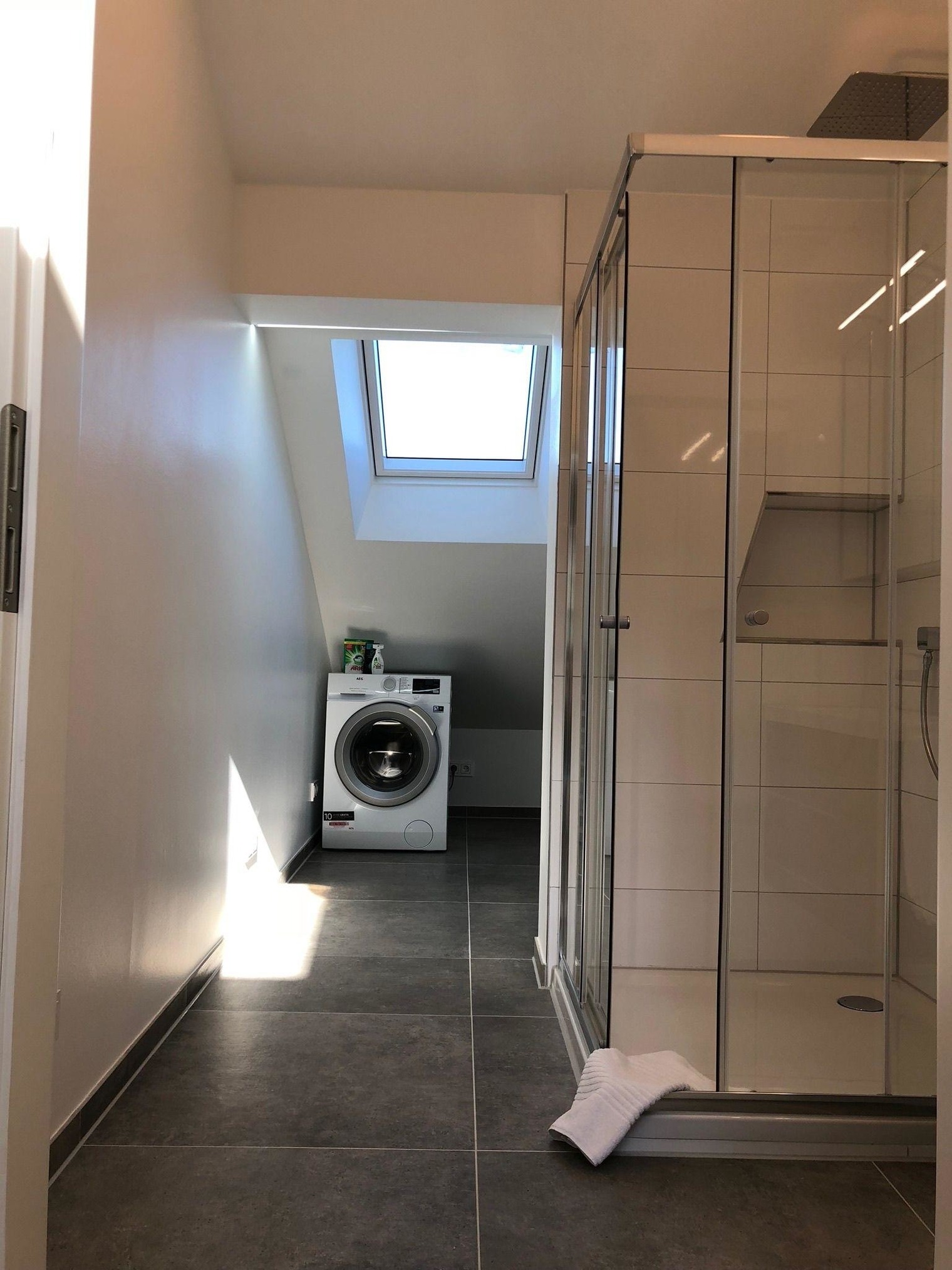 Das geräumige Tageslichtbad beeindruckt mit einer großzügigen Dusche, Waschbecken und WC. Hier steht Ihnen auch eine Waschmaschine zur Verfügung, damit Sie Ihren Aufenthalt in vollen Zügen genießen können.