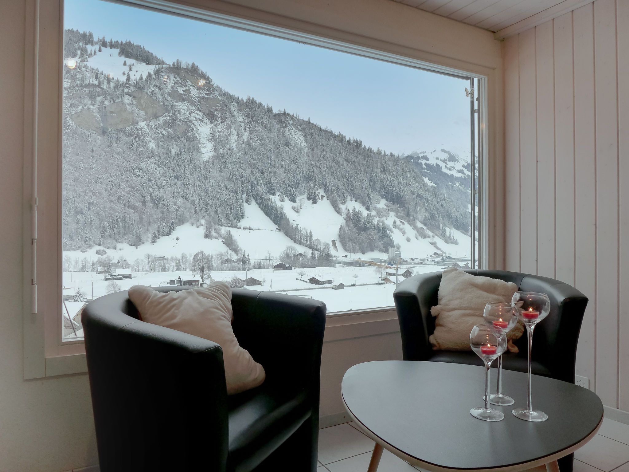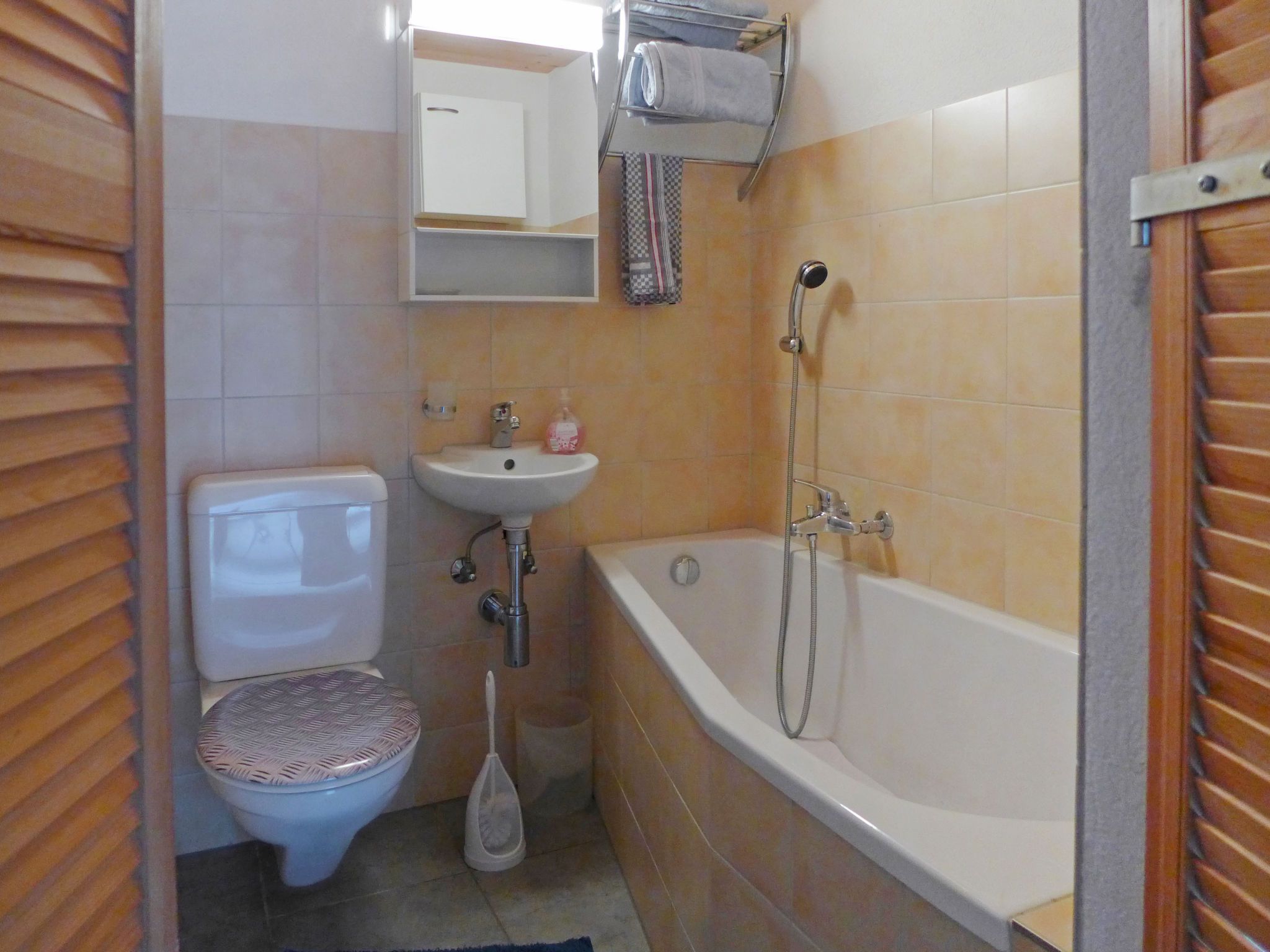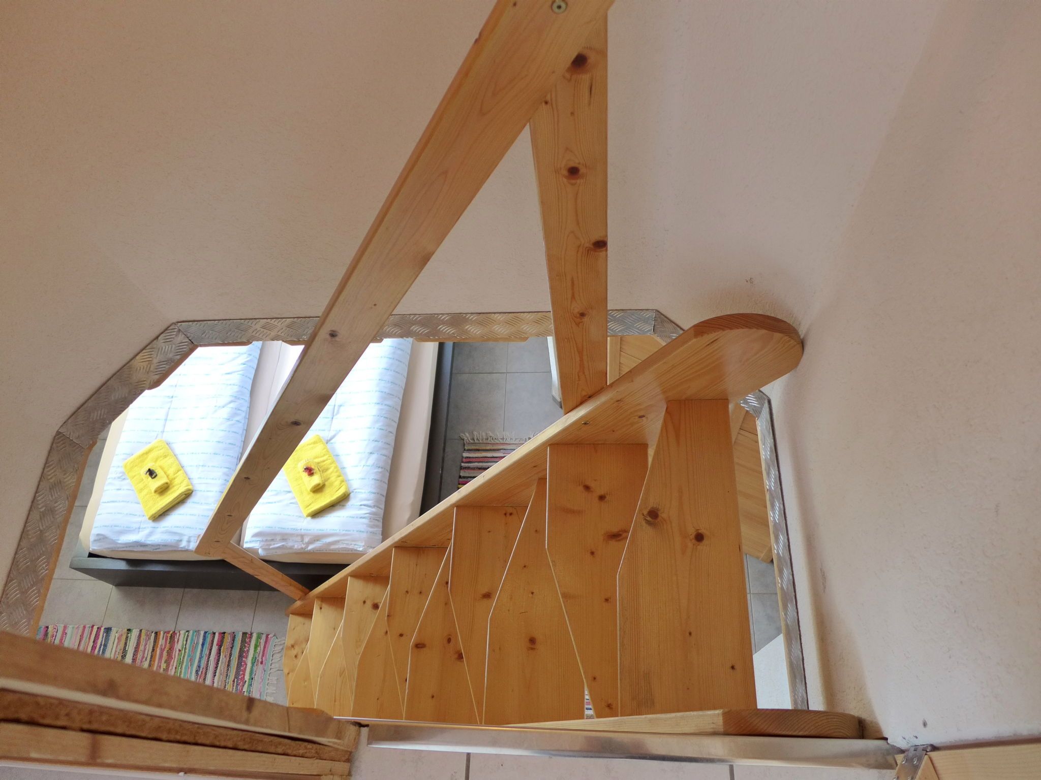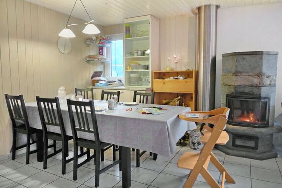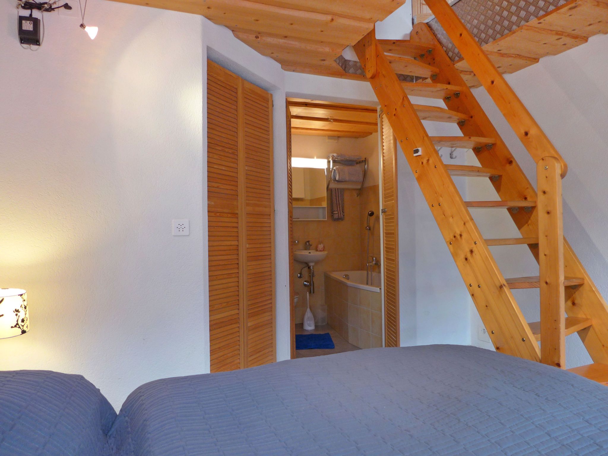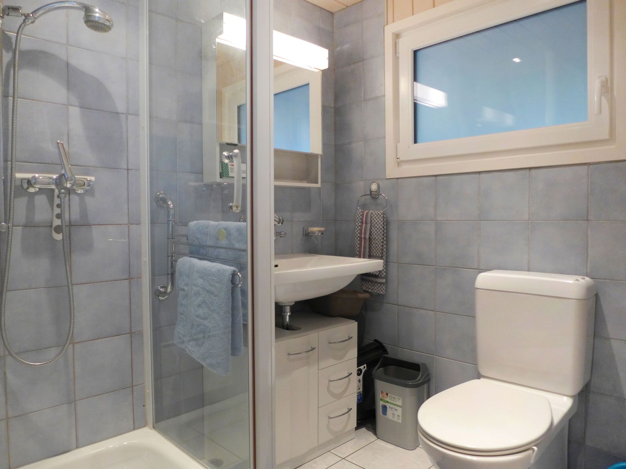 5-Zimmer-Chalet 83 m2 auf 2 Stockwerken. Hell, teilweise abgeschrägt, einfach und gemütlich eingerichtet: offenes Wohn-/Esszimmer mit Panoramafenster mit Schwedenofen. Ausgang zur Terrasse. 1 Zimmer mit 2 Betten (90 cm, Länge 200 cm). 1 grosses Kinderzimmer mit 1 x 2 Etagenbetten (90 cm, Länge 200 cm). Kleine, offene Küche (Backofen, Geschirrspüler, 4 Glaskeramikplatten, Mikrowelle, Tiefkühler, elektrische Kaffeemaschine, Racletteofen, Fondue Set (Käse)). Dusche/WC. Unteres Geschoss: (steile Treppe) 1 Doppelzimmer mit 1 Doppelbett (160 cm, Länge 200 cm), Bad/WC. Ausgang zum Garten. Terrasse, Südlage. Terrassenmöbel, Liegestühle (2). Sehr schöne Panoramasicht auf die Berge, das Tal und die Landschaft. Zur Verfügung: Kinderhochstuhl, Babybett bis 3 Jahre, Haartrockner, Holz (extra). Internet (Wireless LAN, gratis). Bitte beachten: geeignet für Familien. Nichtraucher-Haus.