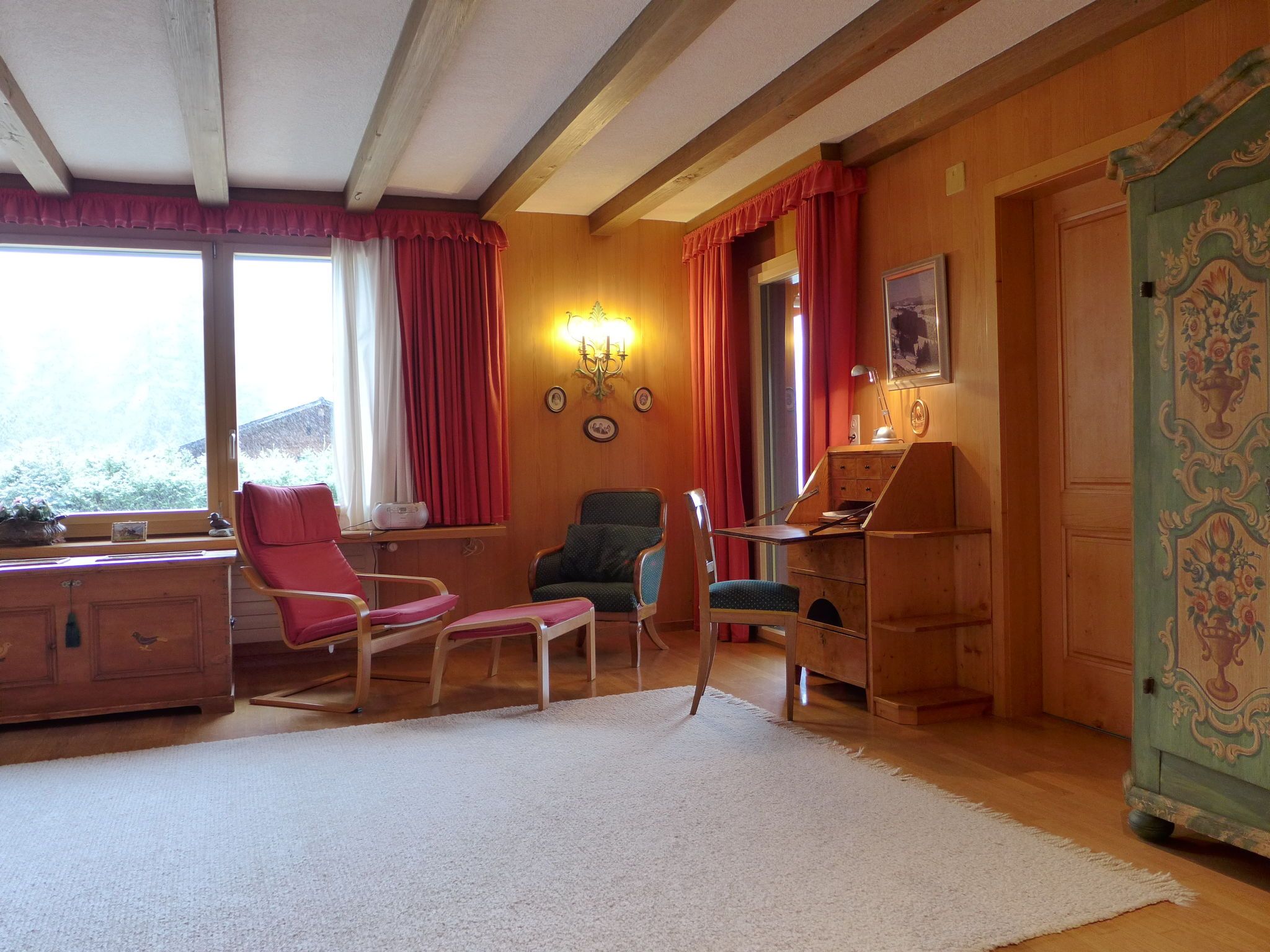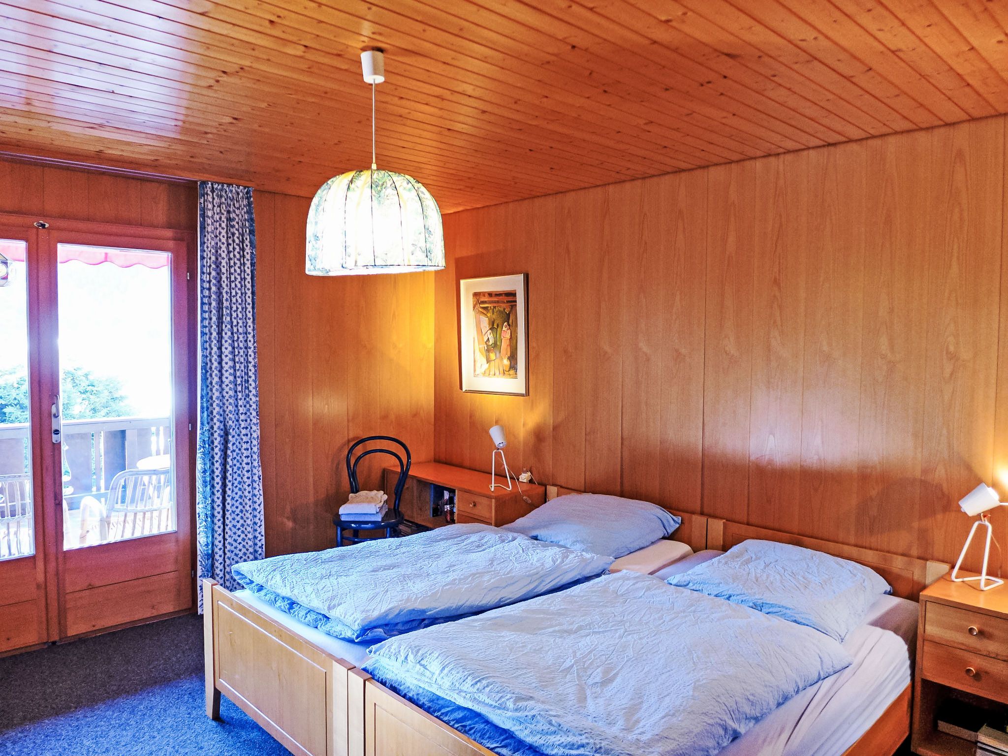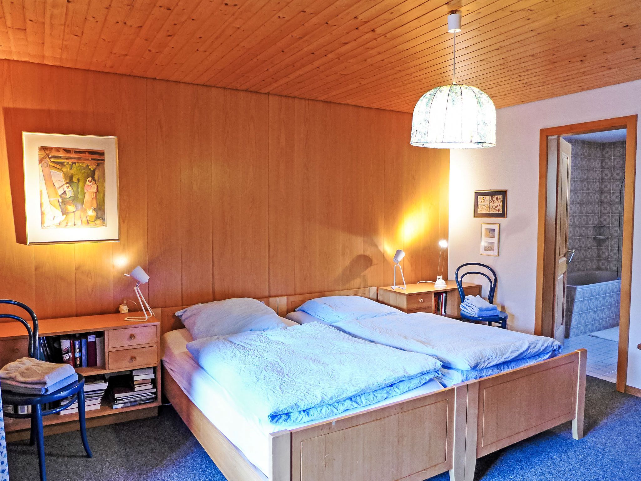 4-Zimmer-Chalet 120 m2 auf 2 Stockwerken, Südwestlage. Geräumig und hell, sehr komfortabel und geschmackvoll eingerichtet: grosses Wohn-/Esszimmer mit Panoramafenster mit offenem Kamin, Essecke, Sat-TV und Radio. Ausgang zum Balkon. 1 grosses Zimmer mit 1 Doppelbett (2 x 90 cm, Länge 200 cm), Bad, Bidet und sep. WC. Grosse Küche (Backofen, Geschirrspüler, 4 Glaskeramikplatten, Mikrowelle, elektrische Kaffeemaschine, Fondue Set (Käse)) mit Durchreiche. Unteres Geschoss: 2 Zimmer, jedes Zimmer mit 2 Betten (90 cm, Länge 200 cm). Dusche/WC. Grosser Balkon, Südlage. Balkonmöbel. Herrliche Panoramasicht auf die Berge, das Tal und die Ortschaft. Zur Verfügung: Waschmaschine, Babybett bis 3 Jahre. Internet (WLAN, gratis). Bitte beachten: geeignet für Familien. Nichtraucher-Unterkunft.