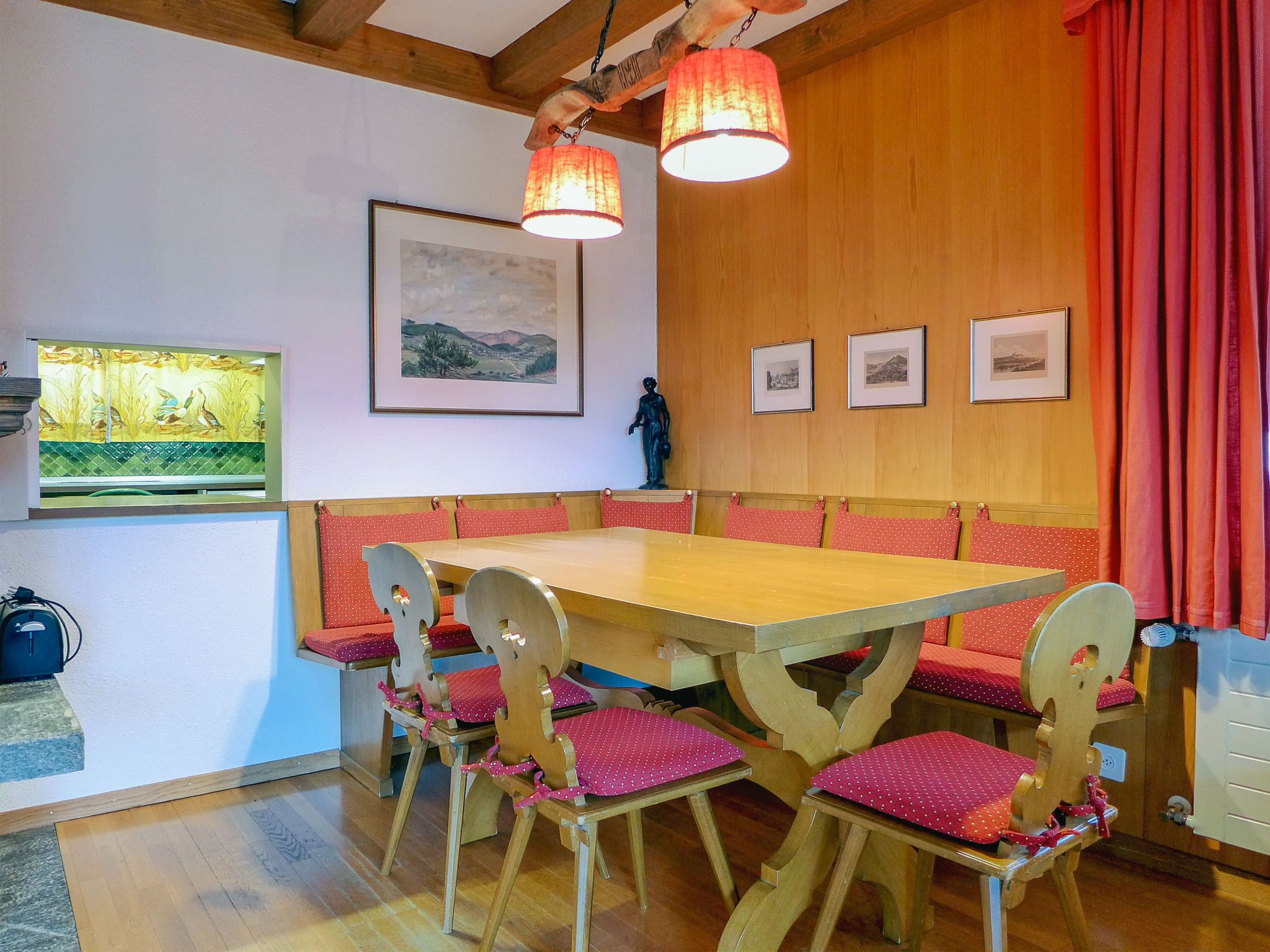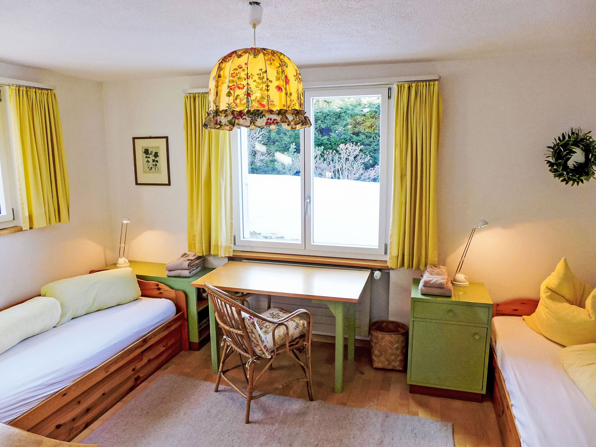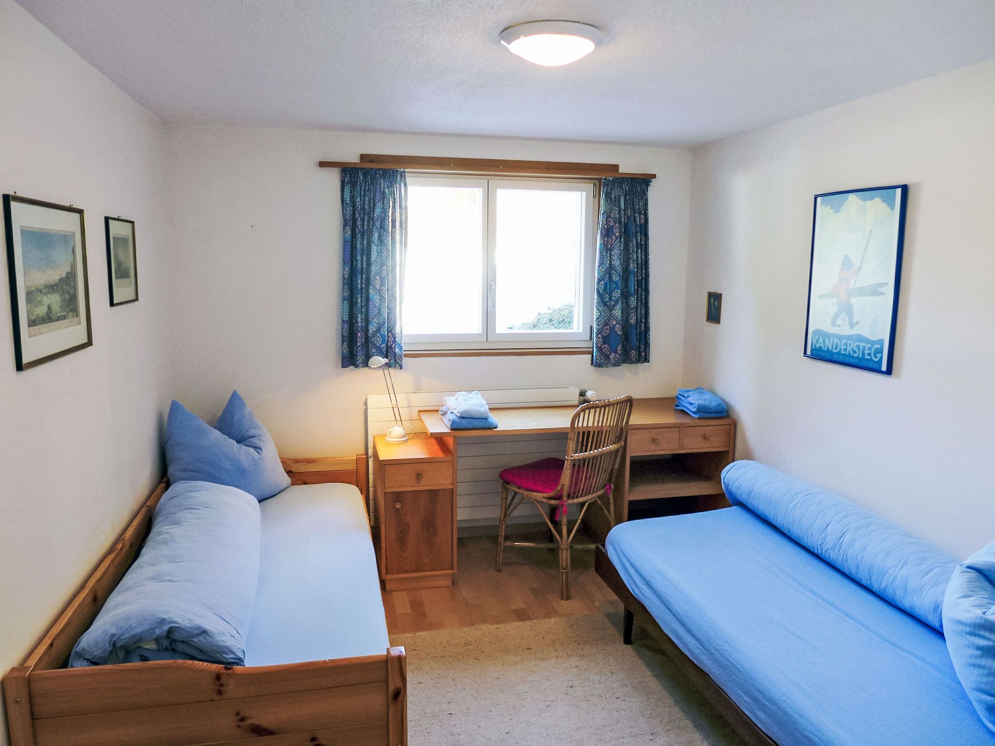 4-Zimmer-Chalet 120 m2 auf 2 Stockwerken, Südwestlage. Geräumig und hell, sehr komfortabel und geschmackvoll eingerichtet: grosses Wohn-/Esszimmer mit Panoramafenster mit offenem Kamin, Essecke, Sat-TV und Radio. Ausgang zum Balkon. 1 grosses Zimmer mit 1 Doppelbett (2 x 90 cm, Länge 200 cm), Bad, Bidet und sep. WC. Grosse Küche (Backofen, Geschirrspüler, 4 Glaskeramikplatten, Mikrowelle, elektrische Kaffeemaschine, Fondue Set (Käse)) mit Durchreiche. Unteres Geschoss: 2 Zimmer, jedes Zimmer mit 2 Betten (90 cm, Länge 200 cm). Dusche/WC. Grosser Balkon, Südlage. Balkonmöbel. Herrliche Panoramasicht auf die Berge, das Tal und die Ortschaft. Zur Verfügung: Waschmaschine, Babybett bis 3 Jahre. Internet (WLAN, gratis). Bitte beachten: geeignet für Familien. Nichtraucher-Unterkunft.