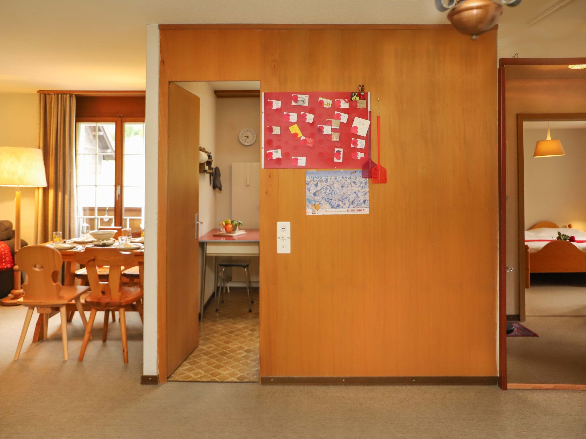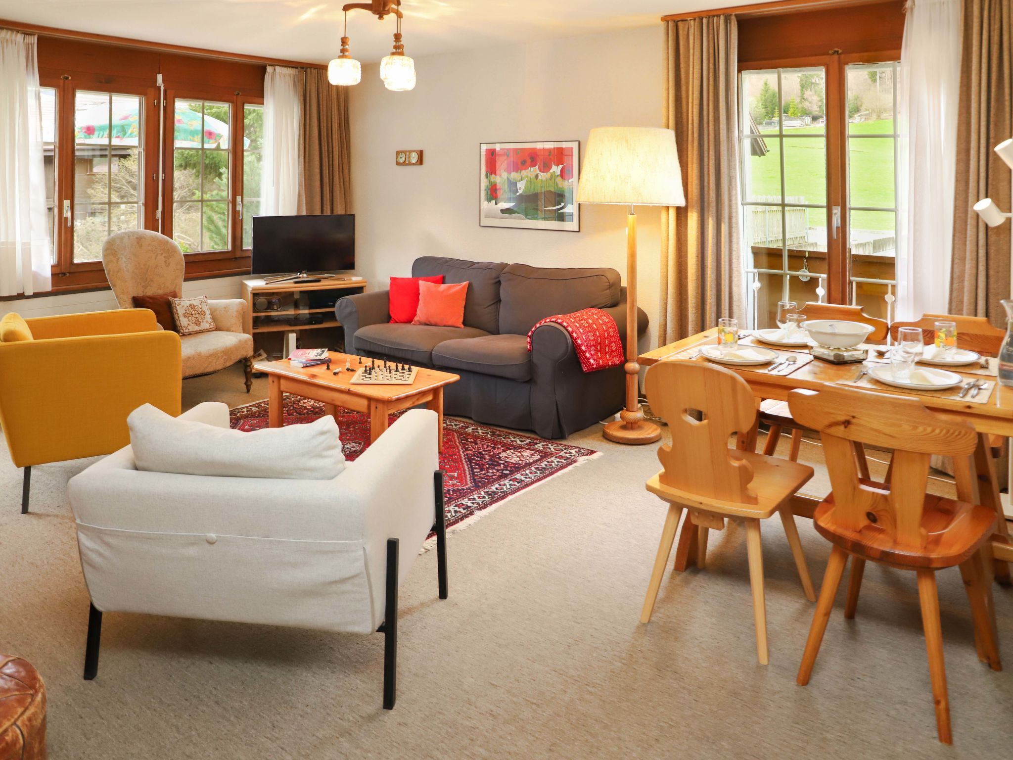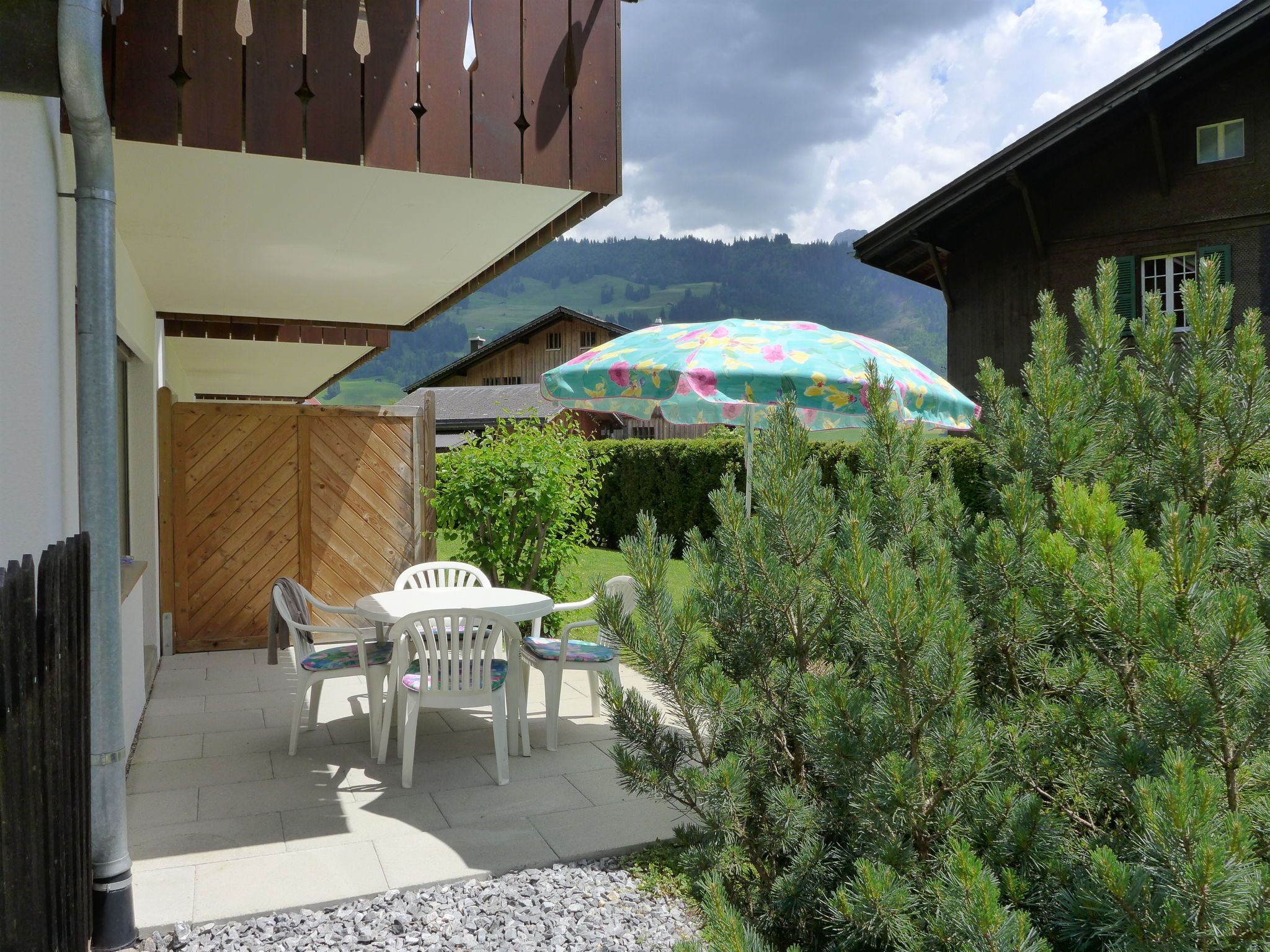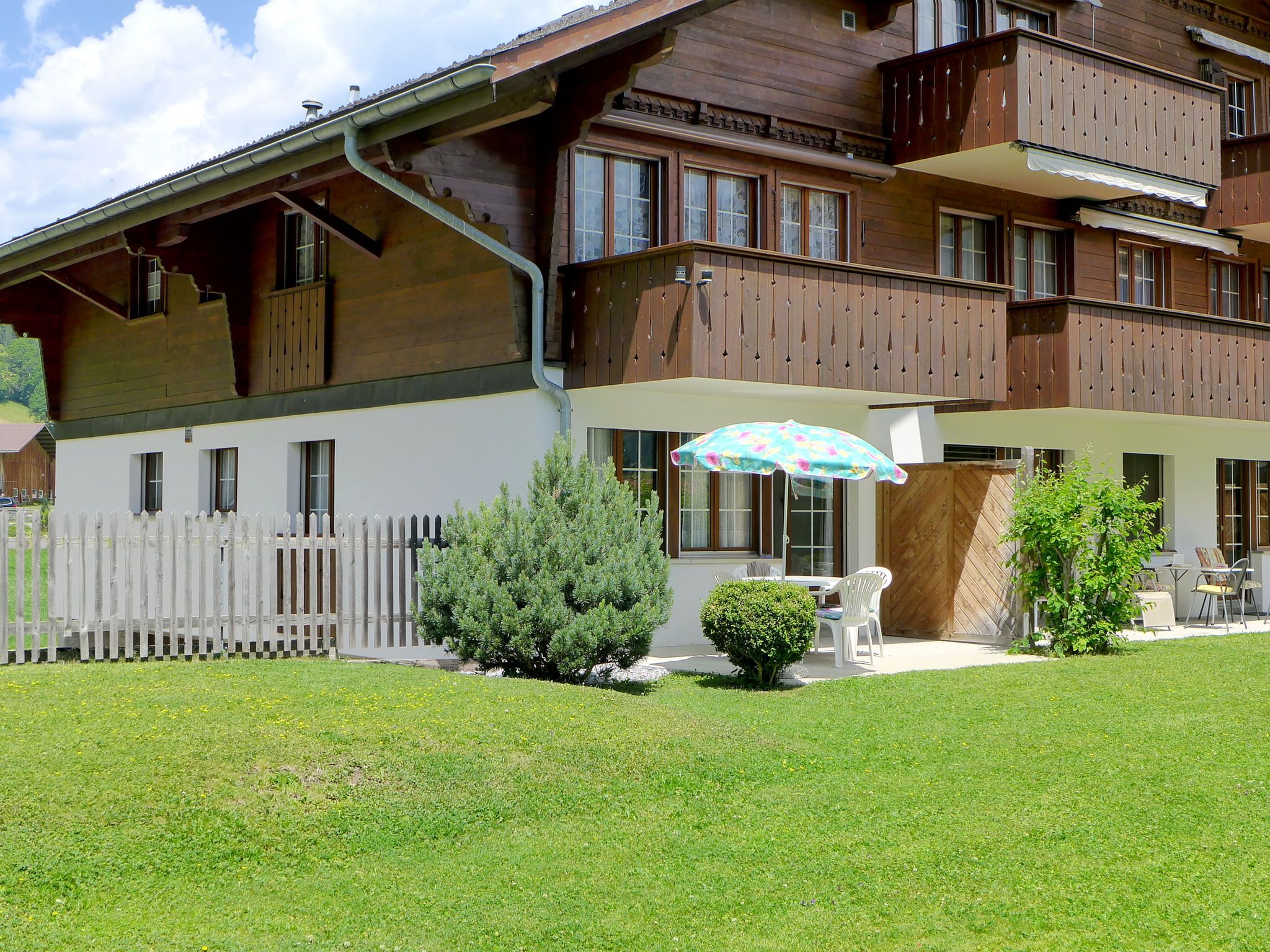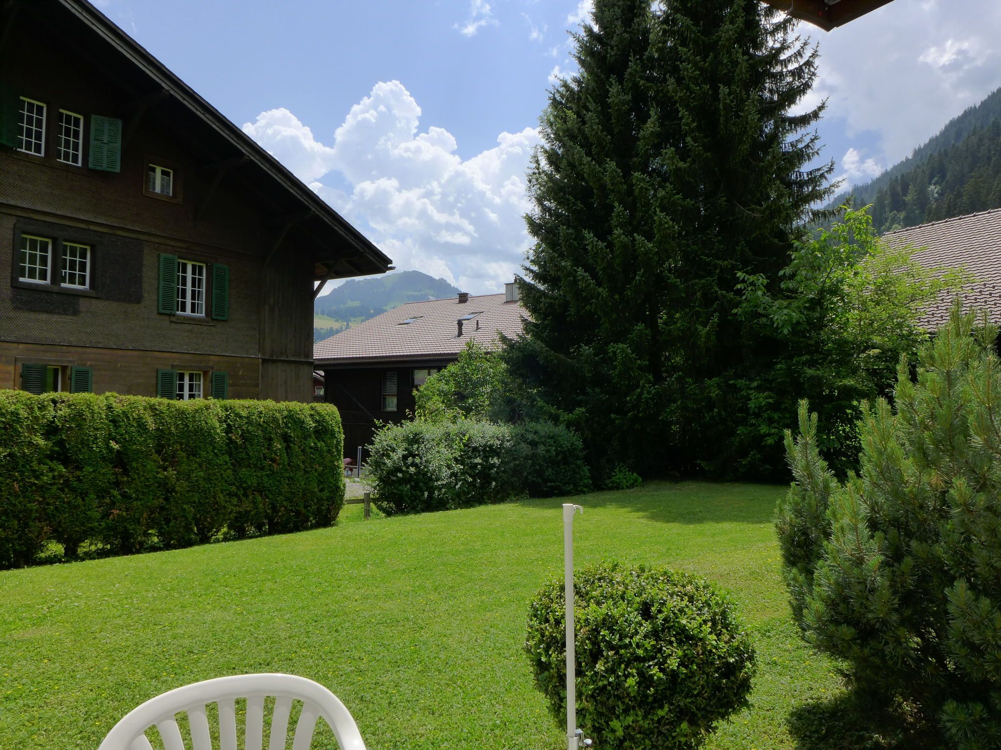 Chalet Simmental P-3, 3-Zimmer-Wohnung 66 m2, im Erdgeschoss, Südlage. Geräumig, sehr gemütlich eingerichtet: offenes Wohn-/Esszimmer 23 m2 mit Essecke, Digital-TV und Radio. Ausgang zur Terrasse. 1 Kinderzimmer 10 m2 mit 2 Betten (90 cm, Länge 190 cm). 1 Doppelzimmer 15 m2 mit 1 Doppelbett (2 x 90 cm, Länge 200 cm). (3 Kochplatten, Backofen, Geschirrspüler, Toaster, Wasserkocher, Mikrowelle, elektrische Kaffeemaschine, Kapseln für die Kaffeemaschine (Nespresso) extra, Racletteofen, Fondue Set (Käse)) mit kleinem Esstisch. Bad/WC. Teppichboden. Grosse Terrasse, Südlage. Terrassenmöbel. Schöne Sicht auf die Berge. Zur Verfügung: Haartrockner. Internet (Wireless LAN, gratis). Garage Nr. 3 auf dem Grundstück (1 Auto). Bitte beachten: geeignet für Familien. Nichtraucher-Unterkunft.