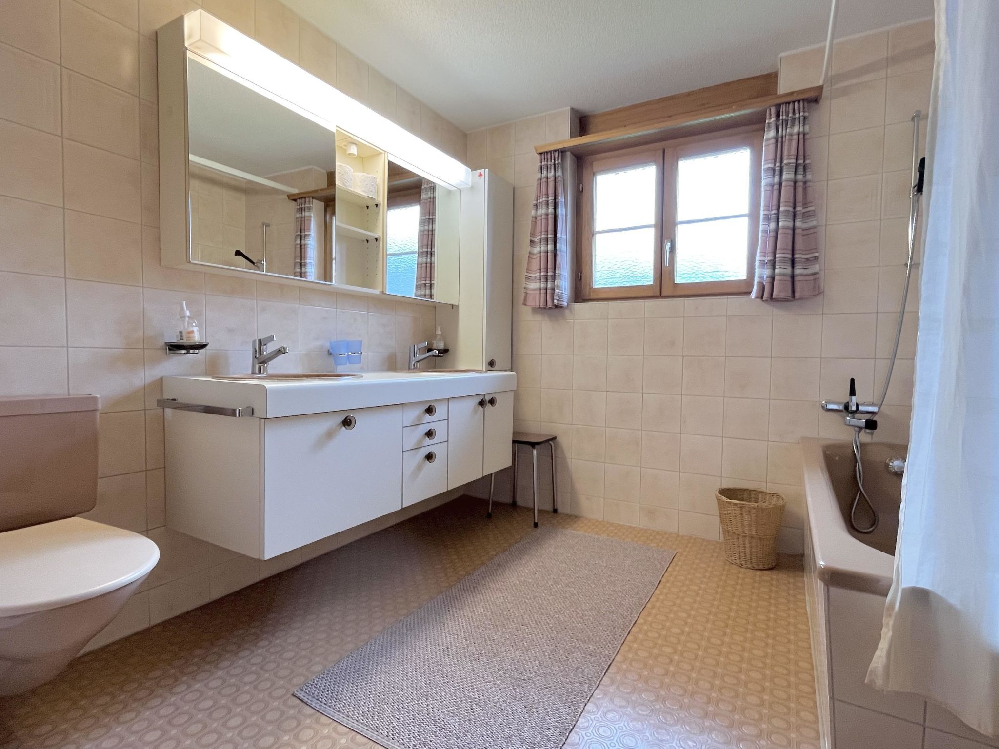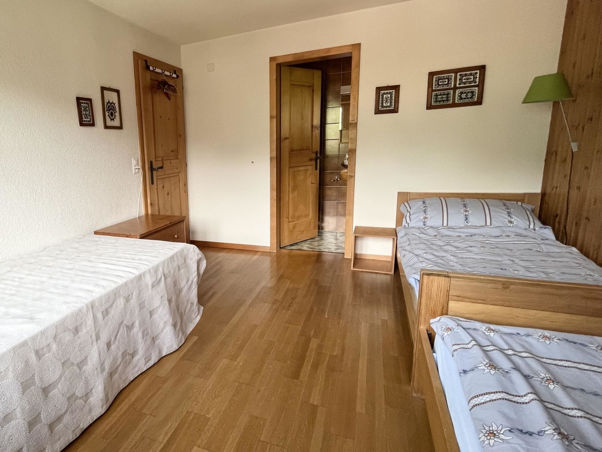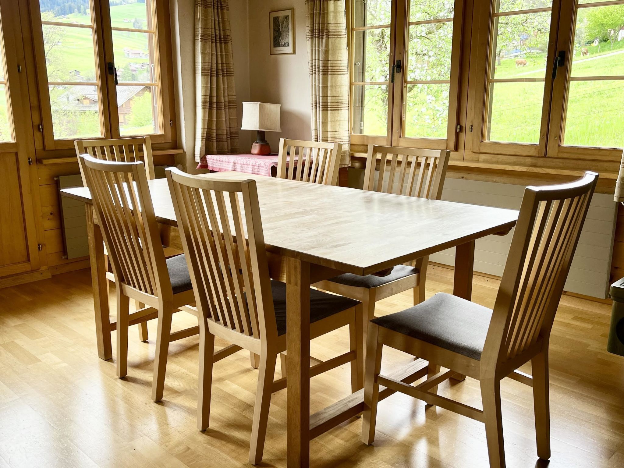 117 m2. Weitere Angaben des Anbieters: 4-Zimmerwohnung (117m2) im Erdgeschoss eines Chalets (Baujahr 1984). Ruhige Lage mit schöner Aussicht. 5 Minuten vom Dorfzentrum entfernt. Parkplatz beim Haus. Grosse Terrasse mit Gartensitzplatz, Balkon. Skiraum sowie Waschküche mit Waschmaschine stehen im Untergeschoss zur gemeinschaftlichen Benutzung zur Verfügung. Separate Küche mit Esstisch, Geschirrspüler, Kapsel-Kaffeemaschine (Delizio) sowie Fondue- und Raclette-Set. Grosses Wohnzimmer mit Cheminée und Esstisch, TV/Telefon/Radio, WiFi. 1 Badezimmer mit Badewanne/Dusche und WC. 1 Schlafzimmer mit 2 Einzelbetten (2x100x190cm). 1 Schlafzimmer mit 3 Einzelbetten (3x90x190cm), 1 Unterziehbett (90x190cm) sowie 1 Badezimmer mit Dusche/WC. 1 Schlafzimmer mit 2 zusammengeschobenen Einzelbetten (2x90x190cm). Kinderbett (70x140cm), Reisekinderbett inkl. Bettwäsche und Kinderhochstuhl vorhanden. INKLUSIVE: Elektrizität, Heizung, Wasser, Parkplatz, Cheminéeholz, Waschmaschine, WiFi, Kinderbett (70x140cm) inkl. Bettwäsche, Kinderhochstuhl, Küchen-, Badezimmer- und Bettwäsche (Erstausstattung) sowie Endreinigung und Kurtaxen. EXKLUSIVE: Kapseln für Kaffeemaschine (Delizio), Filterkaffee. Telefongesprächstaxen. CHF 20.00 pro Aufenthalt für ein Haustier. ***Haustiere willkommen*** Wichtig: In den meisten Ferienwohnungen ist nur ein Haustier (in der Regel ein Hund) erlaubt. Weitere bzw. andere Haustiere müssen vor der Buchung angefragt werden.