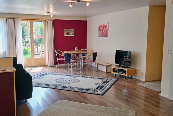 110 m2. Weitere Angaben des Anbieters: 3-Zimmerwohnung (110m2) im Erdgeschoss eines 1995 erbauten Mehrfamilienhauses, leicht erhöht über Zweisimmen. 2009 wurden beide Schlafzimmer und die Wohnküche renoviert. Im Herbst 2011 wurde das Badezimmer komplett erneuert. Der Zugang zum Chalet erfolgt über Treppenstufen. Ausblick auf den Rinderberg vom Gartensitzplatz aus. Sandkasten und Grill vorhanden. Auf Anfrage stehen ein zweiter Parkplatz, eine Waschmaschine und ein Wäschetrockner zur Verfügung. Die Besitzer wohnen im selben Haus. Neben dem Haus fliesst der rauschende Ryschbach durch. Die Ferienwohnung Hübeli (Kopp), welche von den selben Vermietern angeboten wird, liegt in nur 20m Entfernung. Schlafzimmer: Doppelbetten (2x100x200cm). Kinder-Schlafzimmer: 1 Etagenbett (2x90x200cm) und 2 einzelne Betten (90x200cm). Wohnecke: Tisch, Sofa, Kabel TV, Radio, CD-Player, DVD. WiFi. Offene Küche: Tisch, Geschirrspüler, Backofen, Kühlschrank mit Gefrierfach, Kaffeemaschine, Fondue- und Raclette-Set, Wasserkocher, Thermoskanne, Waage, Tupperware etc.. Badezimmer: Viel Platz, neue Ausstattung. Ein Abstellraum steht zur Verfügung. Kinderbett (60x120cm) inkl. Bettwäsche und Kinderhochstuhl vorhanden. INKLUSIVE: Elektrizität, Heizung, Wasser, Parkplatz, Waschmaschine, Wäschetrockner WiFi, Kinderbett (60x120cm) inkl. Bettwäsche, Kaffee (Pads oder Instantkaffee), Kinderhochstuhl, Bett-, Küchen- und Badezimmerwäsche (Erstausstattung) sowie Endreinigung und Kurtaxen. ***Haustiere willkommen*** Wichtig: In den meisten Ferienwohnungen ist nur ein Haustier (in der Regel ein Hund) erlaubt. Weitere bzw. andere Haustiere müssen vor der Buchung angefragt werden.