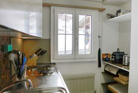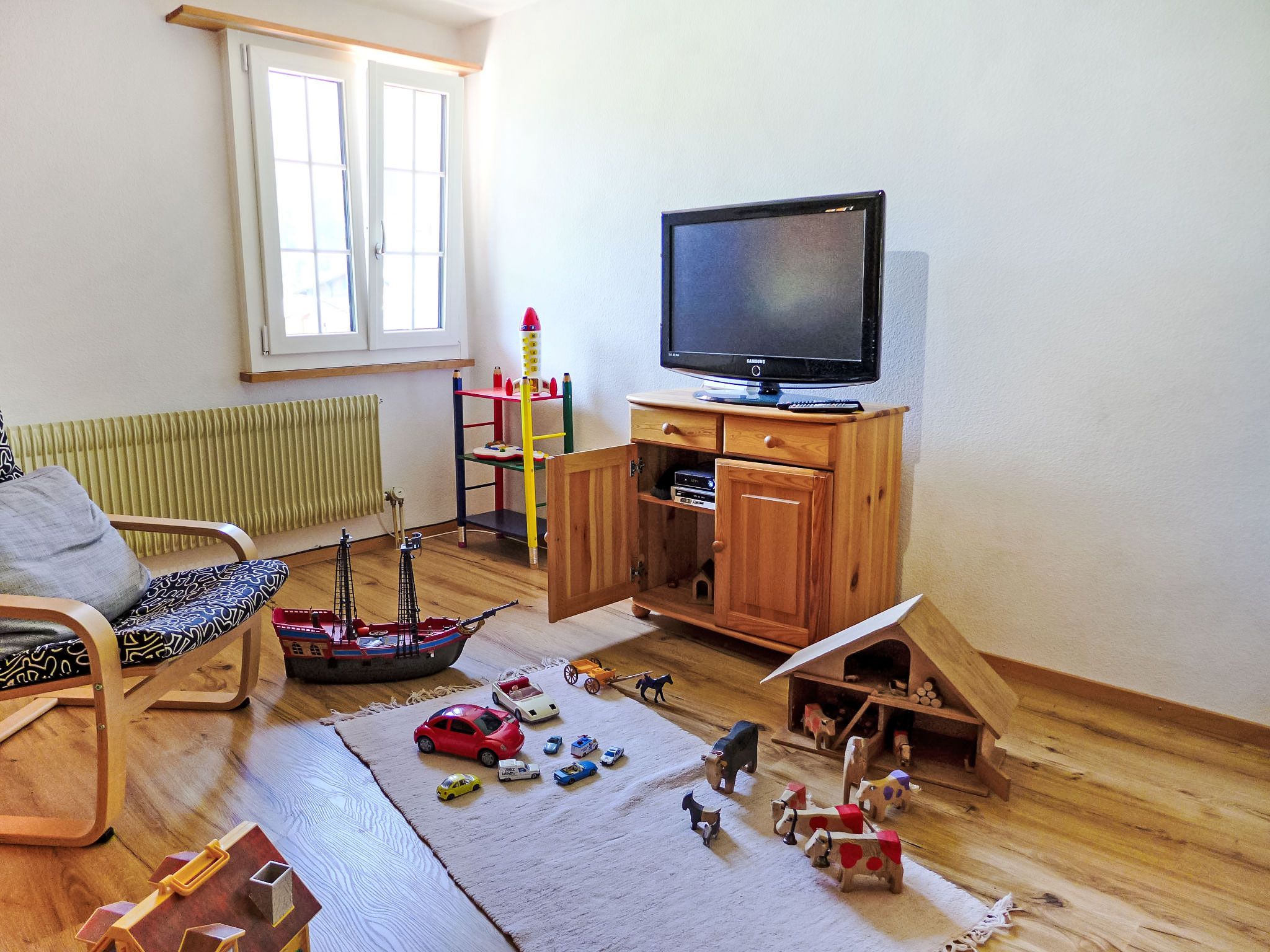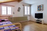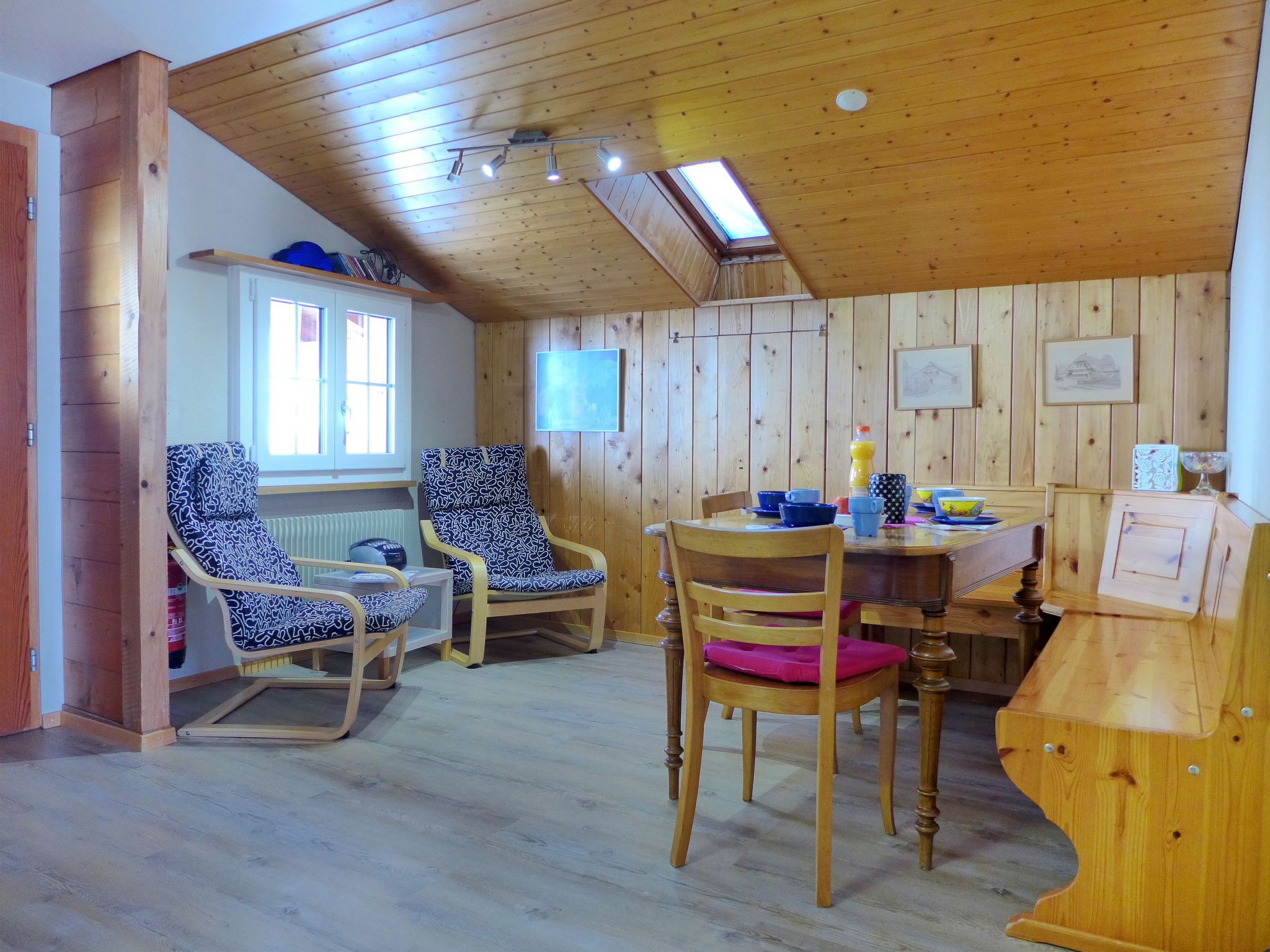 Chalet Seeberg, 3-Zimmer-Wohnung 44 m2, im Dachgeschoss, Südostlage. Teilweise abgeschrägt, zweckmässig und gemütlich eingerichtet: offenes Wohn-/Esszimmer mit Dachfenster mit Essecke, Radio und CD. Ausgang zum Balkon. Wohn-/Schlafzimmer mit 2 Betten (90 cm, Länge 200 cm), Sat-TV (Flachbildschirm), DVD. 1 abgeschrägtes Zimmer mit 1 Doppelbett (2 x 90 cm, Länge 200 cm). Kleine Küche (3 Kochplatten, Backofen, elektrische Kaffeemaschine, Racletteofen, Fondue Set (Käse)). Dusche/WC. Kleiner Balkon 6 m2, Westlage. Schöne Sicht auf die Berge, die Landschaft und den Wald. Zur Verfügung: Bügeleisen, Kinderhochstuhl, Haartrockner. Internet (WLAN, gratis). Parkplatz (1 Auto). Bitte beachten: geeignet für Familien. Nichtraucher-Unterkunft. Maximal 2 Haustiere/Hunde erlaubt. Nur langsames Internet verfügbar.