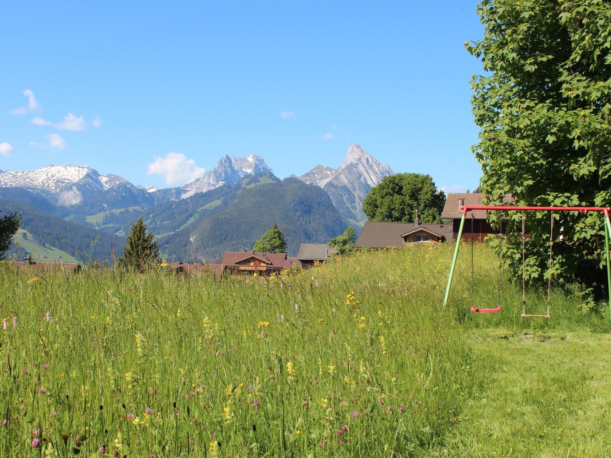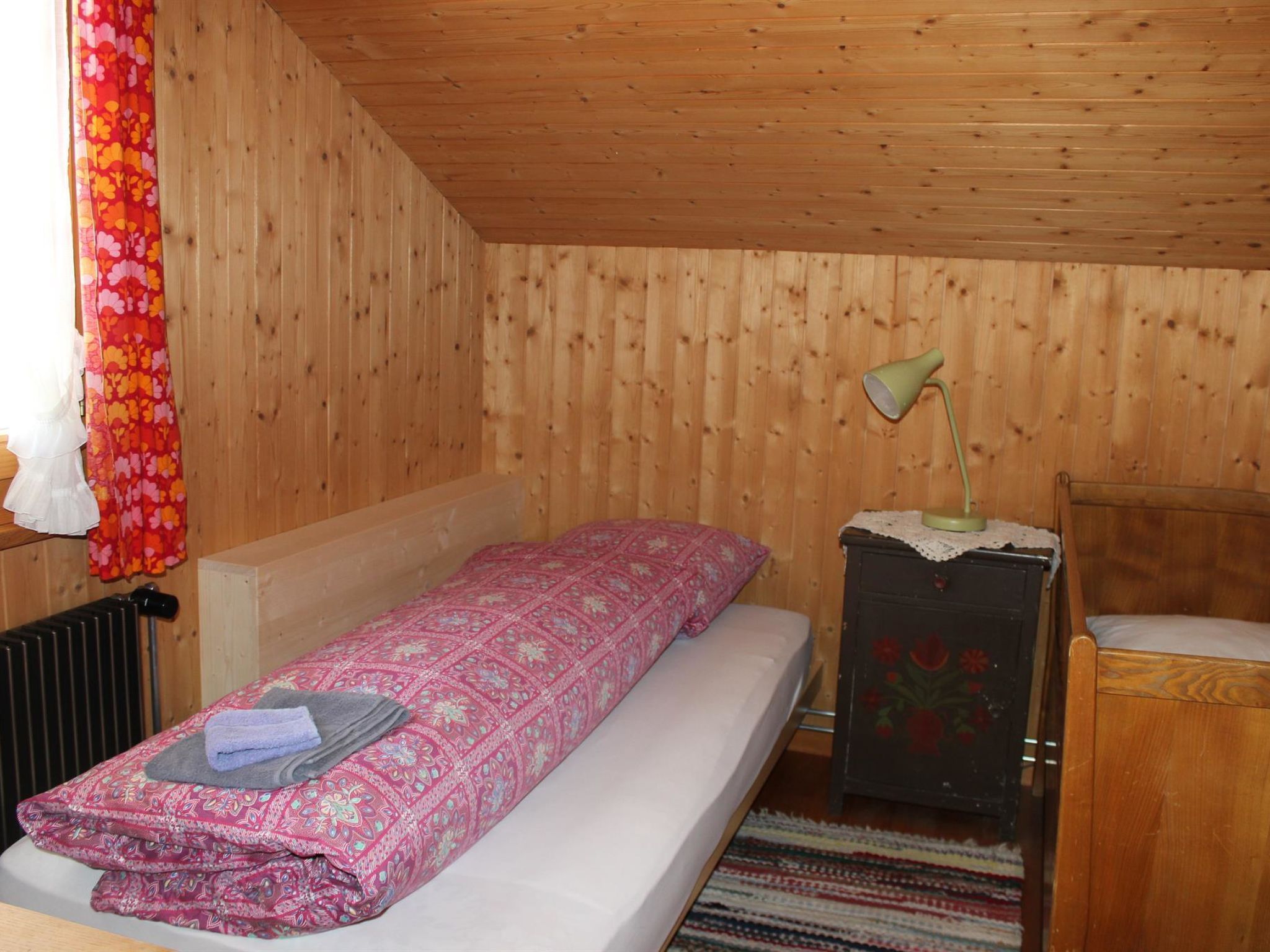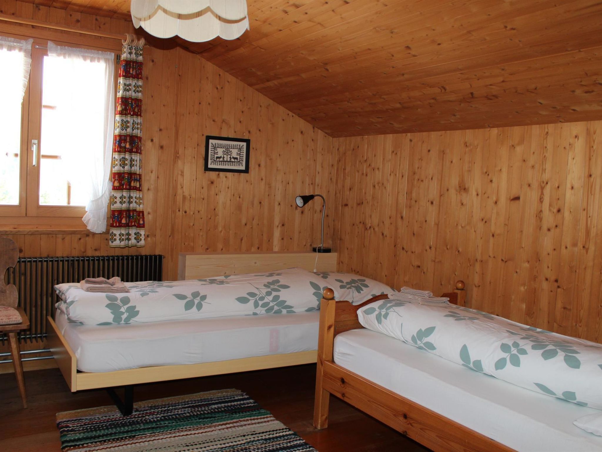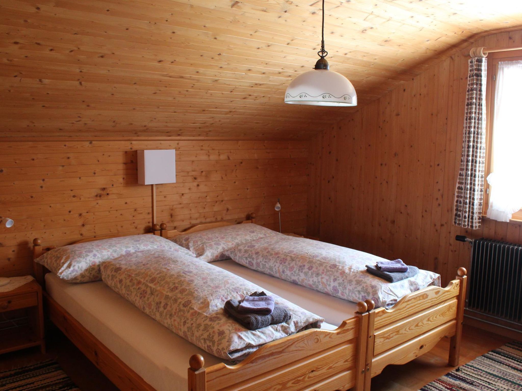 88 m2. Weitere Angaben des Anbieters: 5-Zimmer-Duplexwohnung, 88m2 (1./2. Stock) in einem renovierten Chalet mit Komfort und ruhiger Lage. Schön angelegter Garten lädt zum Spielen und Ruhen ein (mit Spielplatz). Grosser Balkon. Garage/Parkplatz. Ladestation für Elektroautos verfügbar (Abrechnung nach Verbrauch, Bezahlung an Schlüsselhalter bei Abreise). 1. Stock: 1 Wohn-/Esszimmer mit TV, Radio und Telefon. Küche u.a. ausgestattet mit Geschirrspüler, Fondue- und Raclette-Set. Waschmaschine und Wäschetrockner. 1 Schlafzimmer mit 2 Betten (90x190cm). Bad/WC. WiFi. 2. Stock: 1 Schlafzimmer mit 2 Betten (2x90x190cm). 1 Schlafzimmer mit 2 Betten (90x190cm). 1 Schlafzimmer mit 1 Bett (90x190cm). WC. Kinderbett (70x140cm) inkl. Bettwäsche und Kinderhochstuhl vorhanden. INKLUSIVE: Elektrizität, Heizung, Wasser, Garage, Parkplatz, WiFi, Waschmaschine, Trockner, Kinderbett (70x140cm) inkl. Bettwäsche, Kinderhochstuhl, Küchen-, Badezimmer- und Bettwäsche (Erstausstattung) sowie Endreinigung und Kurtaxen. EXKLUSIVE: Filterkaffee. Kapseln für Kaffeemaschine (Nespresso). Telefongesprächstaxen. Ladestation für Elektroautos. ***Haustiere nicht erlaubt***.
