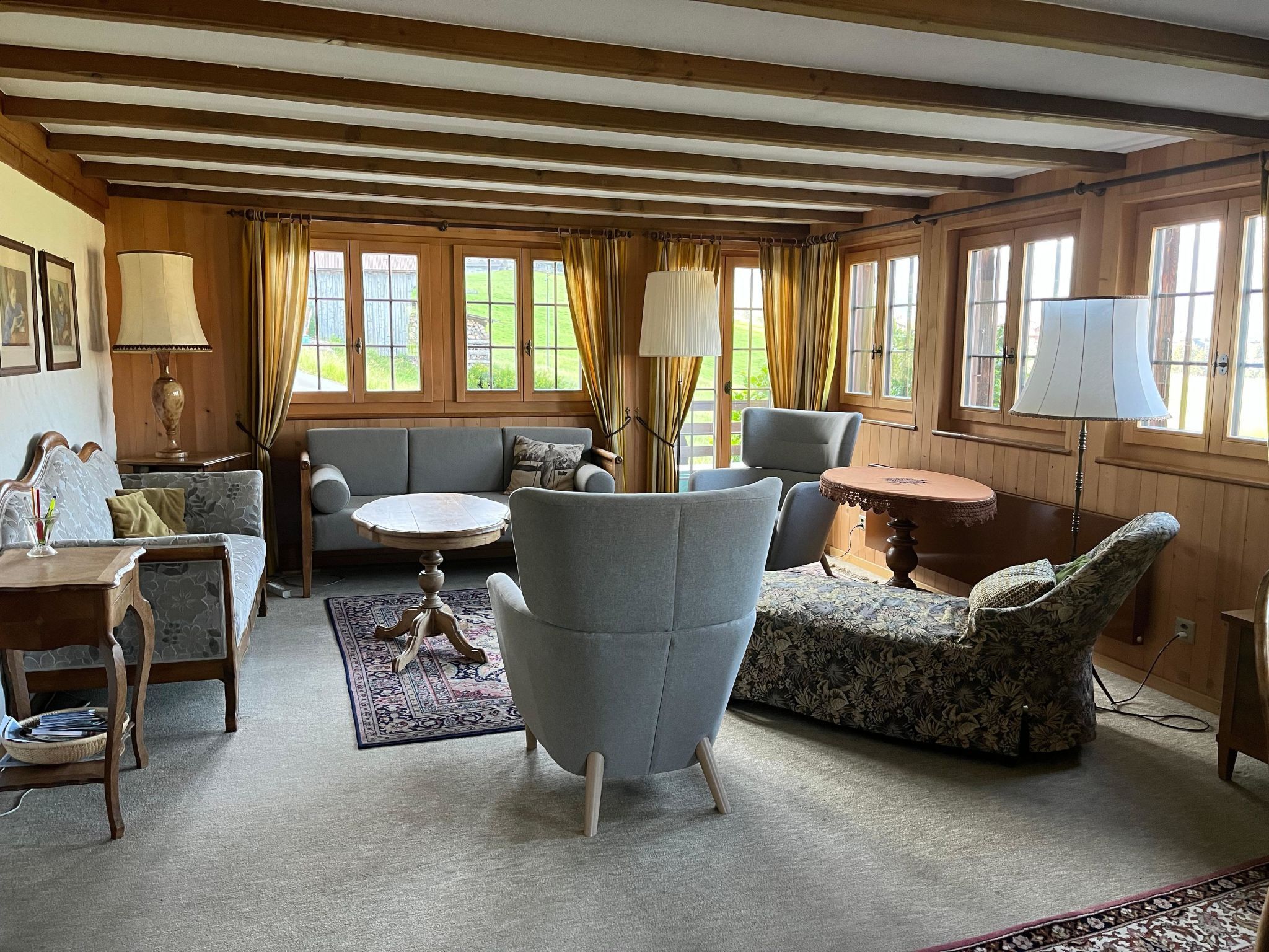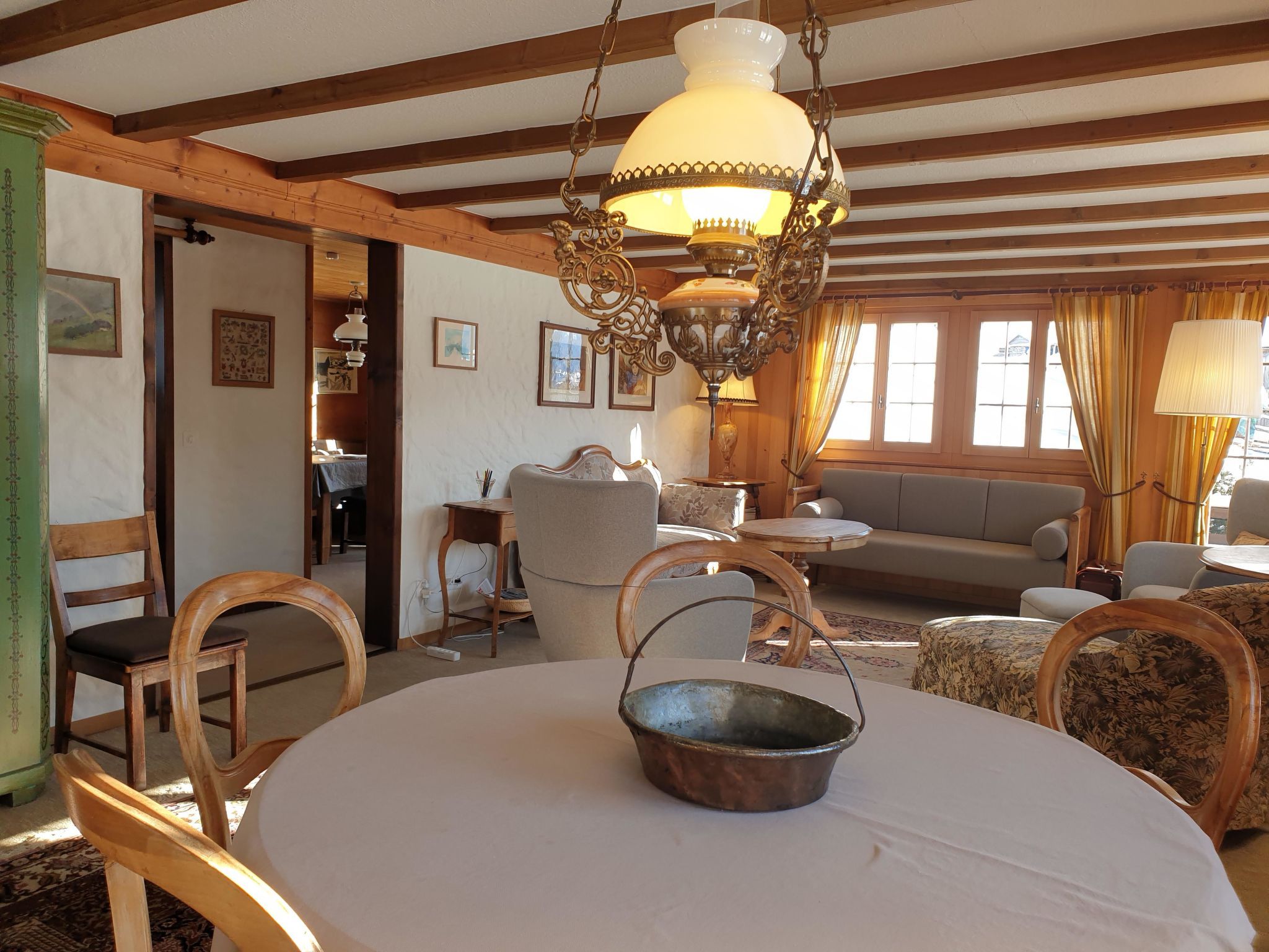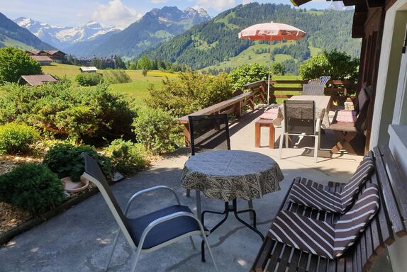 167 m2. Weitere Angaben des Anbieters: Neu renoviertes, gemütlich eingerichtetes und sonnig gelegenes 5-Zimmer Chalet zur Alleinbenutzung. Unverbaute Rundsicht auf das ganze Saanenland. Ideal für Familien und Ruhesuchende. Obwohl es in der Landwirtschafszone liegt, sind es nur 20 Gehminuten zum Zentrum/Bahnhof Gstaad. Ganzjährige Zufahrt ohne Durchgangsverkehr mit 3 Parkplätzen. Erdgeschoss: Moderne Küche mit Glaskeramikherd, Backofen, Kühlschrank mit Gefrierfach, Kapsel-Kaffeemaschine (Nespresso), Geschirrspüler, Fondue-Set. Angrenzendes Esszimmer mit Warmluftcheminée, Durchreiche aus der Küche, Esstisch mit Eckbank. Separates WC. Gemütlich eingerichtetes Wohnzimmer mit 2 Sofas, Chaise-Longue und Sesseln. Separate Lese-& TV Sitzecke. Grosse möblierte Terrasse. Obergeschoss: Schlafzimmer 1: Doppelbett (160x200cm), Kommode, Kleiderschrank. Schlafzimmer 2: Doppelbett (180x200cm), Einzelbett (90x200cm), Kommode, Kleiderschrank. Schlafzimmer 3: Einzelbett (90x200cm), Etagenbett (2 x 90x190cm), Kommode, Kleiderstange Bad mit Dusche/WC Untergeschoss: Waschküche/Trockenraum zur Alleinbenutzung mit: Waschturm (Waschmaschine/Tumbler) Wäscheleinen, separater Raum-Luftentfeuchter INKLUSIVE: Elektrizität, Heizung, Wasser, Parkplatz, WiFi, Waschmaschine und Wäschetrockner, Küchen-, Badezimmer- und Bettwäsche (Erstausstattung) sowie Endreinigung und Kurtaxen. EXKLUSIVE: Kapseln für Kaffeemaschine (Nespresso). ***Haustiere nicht erlaubt***.
