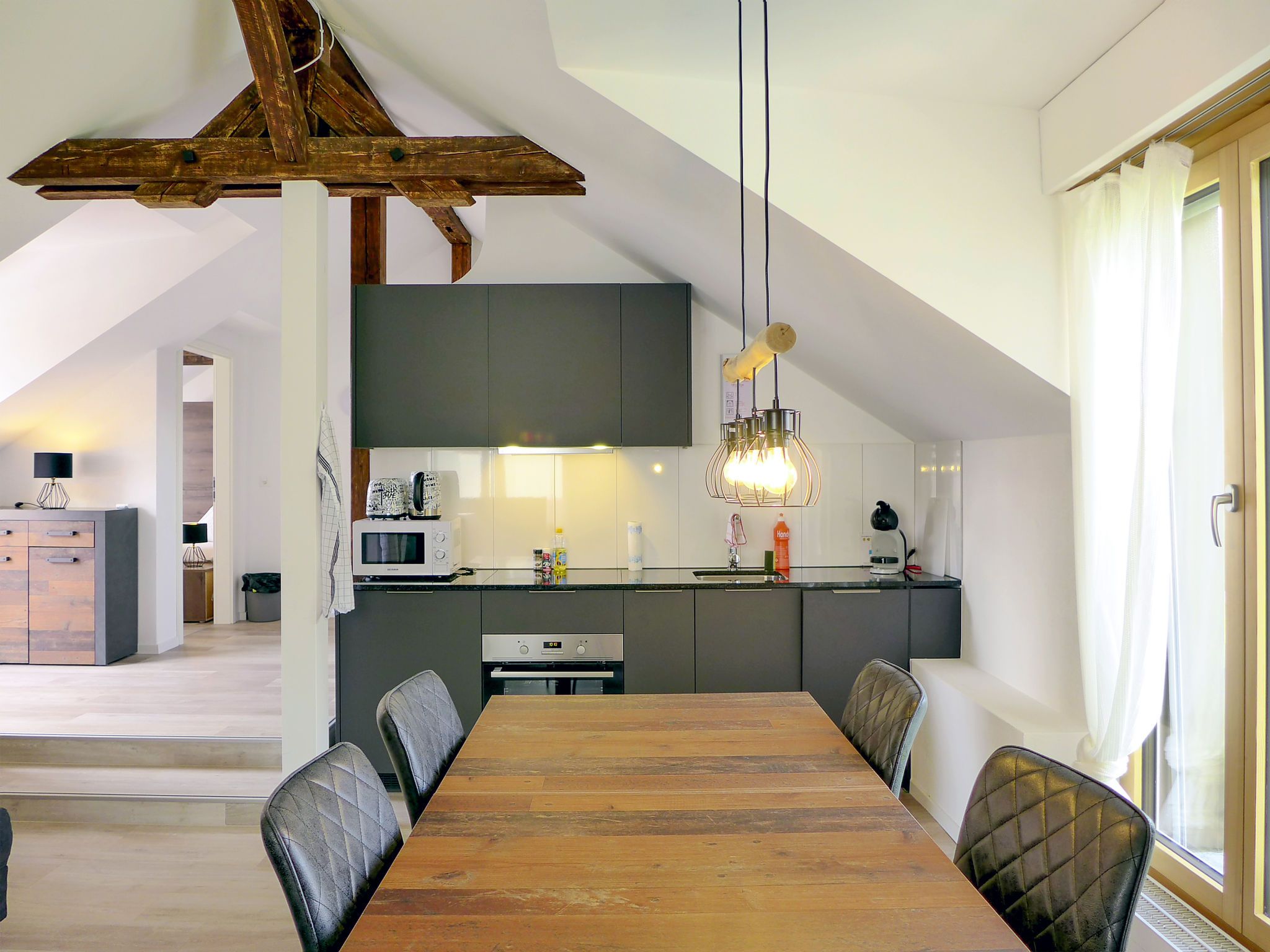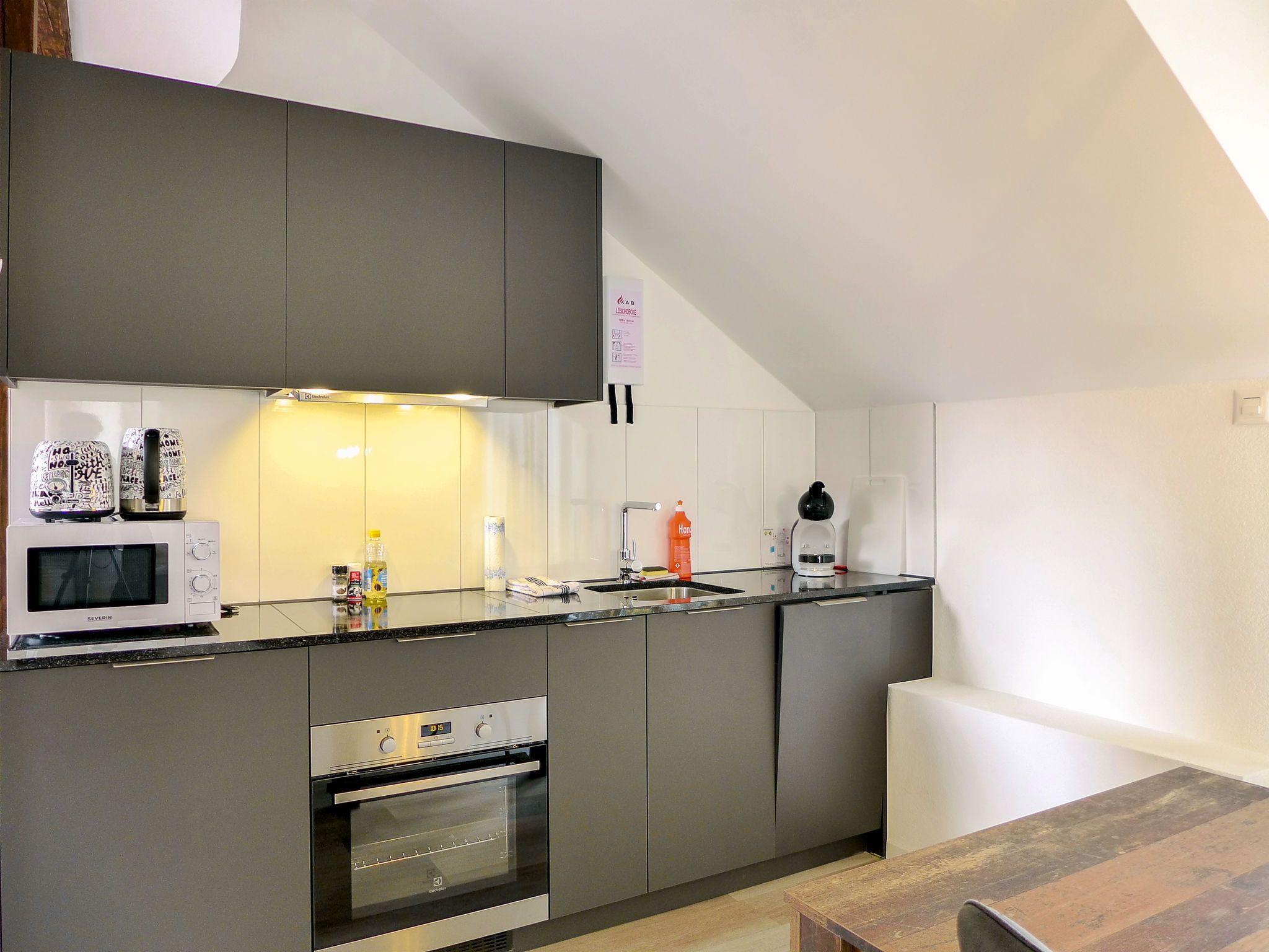 Henry's 202, 2-Zimmer-Wohnung 48 m2, im Dachgeschoss. Geräumig und hell, teilweise abgeschrägt, vollständig renoviert im Jahre 2022, sehr komfortabel und modern eingerichtet: offenes Wohn-/Esszimmer mit Panoramafenster mit Esstisch und Kabel-TV. 1 Zimmer mit 1 Doppelbett. Offene Küche (4 Induktionskochplatten, Toaster, Wasserkocher, Mikrowelle, elektrische Kaffeemaschine, Kapseln für die Kaffeemaschine (Dolce Gusto) extra). Dusche/WC. Schöne Sicht auf die Berge und die Ortschaft. Zur Verfügung: Waschmaschine, Wäschetrockner, Babybett bis 2 Jahre (extra), Haartrockner. Internet (Wireless LAN, gratis). Parkplatz (1 Auto). Bitte beachten: Nichtraucher-Haus. Feuerlöscher.