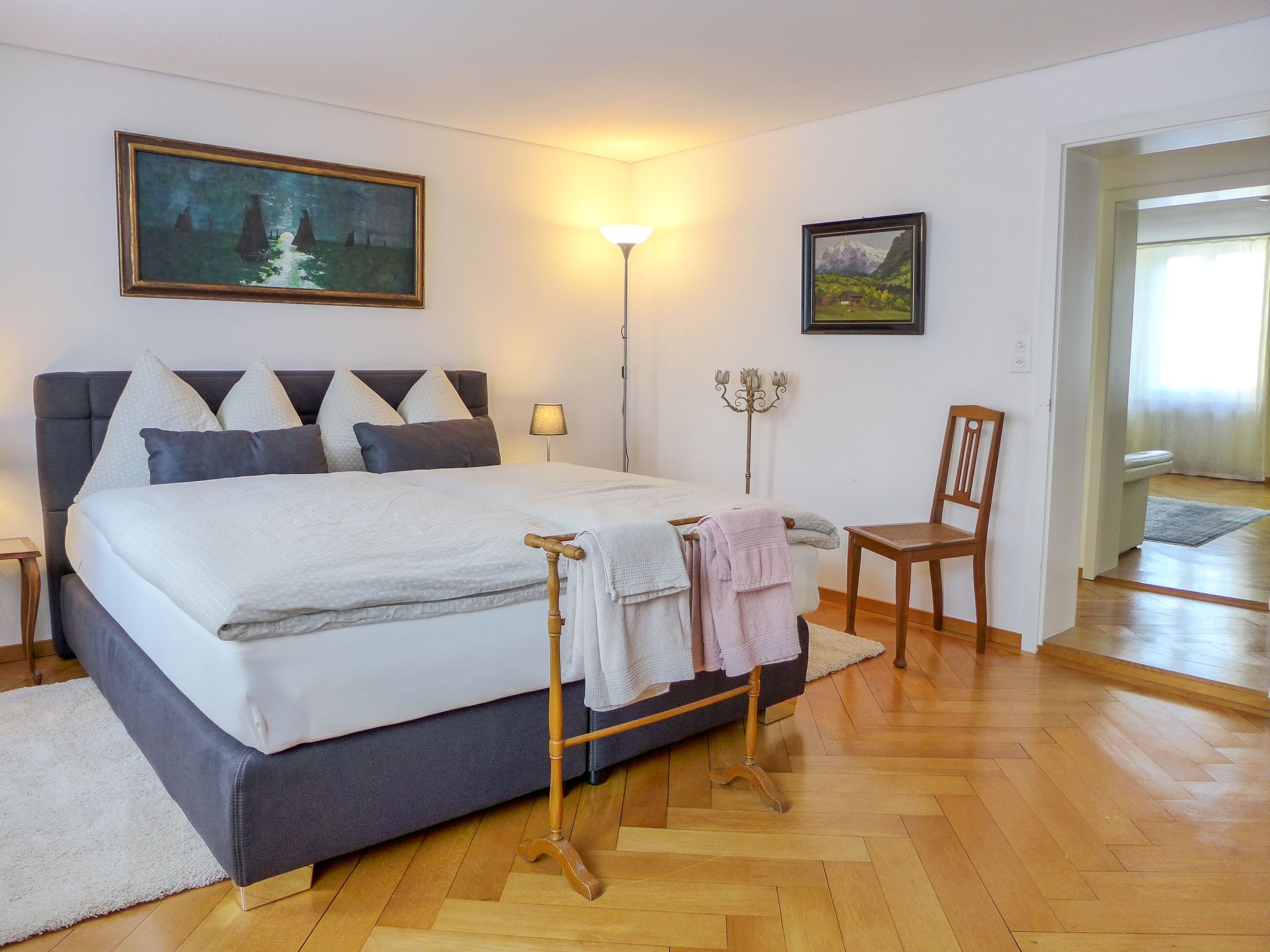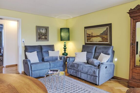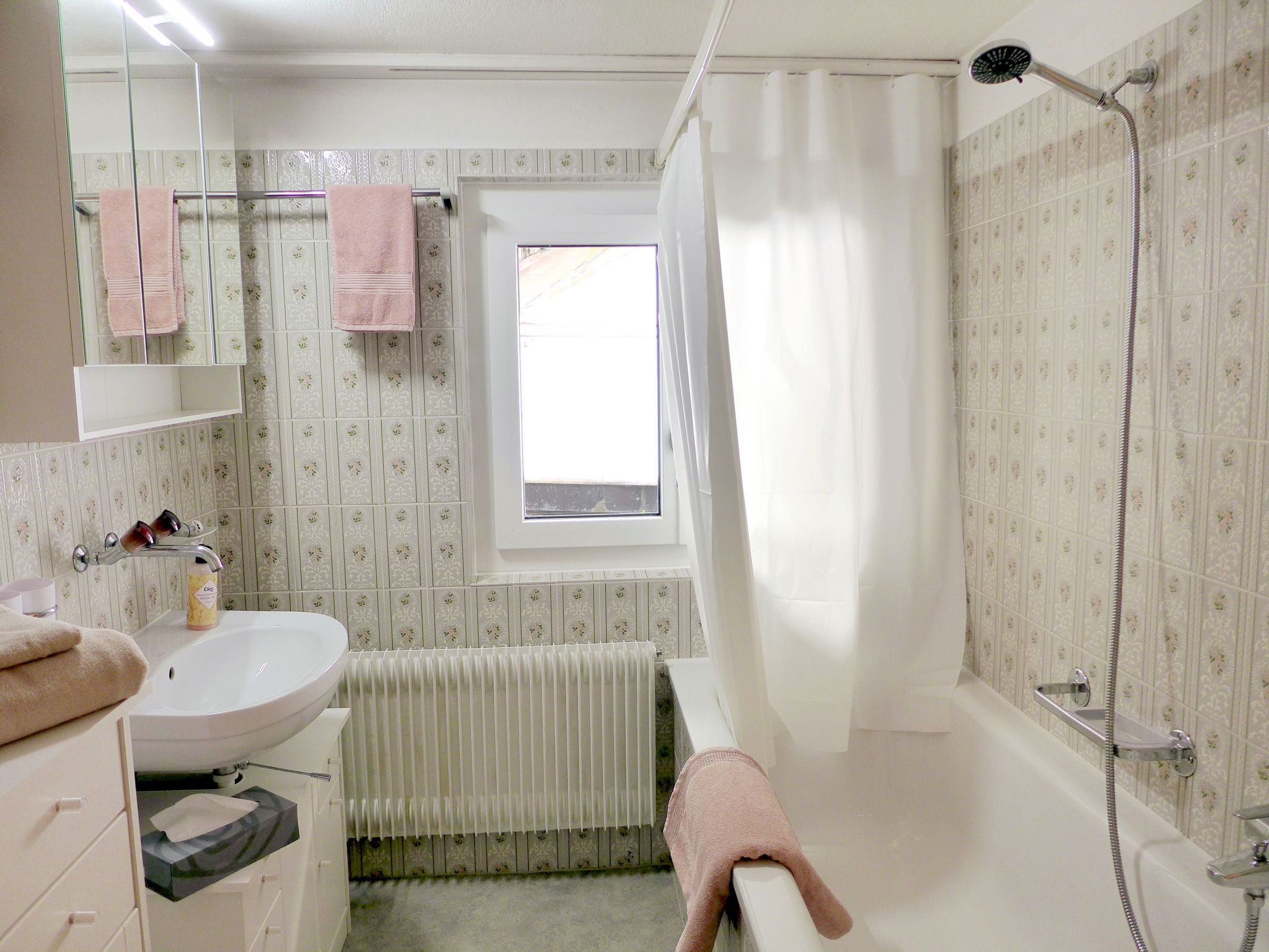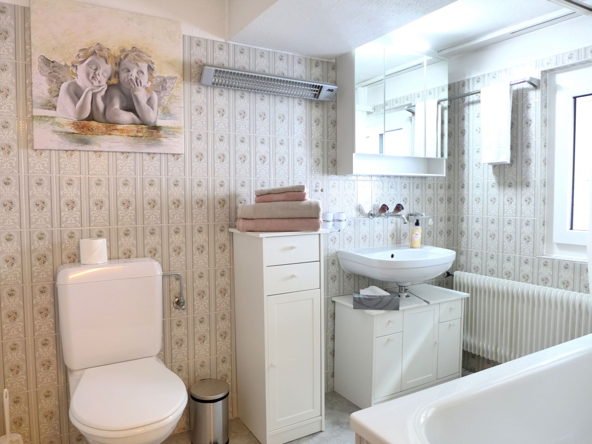 3-Zimmer-Wohnung 70 m2 im 1. Stock. Geräumig und hell, zweckmässig und gemütlich eingerichtet: grosses Wohn-/Esszimmer mit Esstisch und Kabel-TV. 1 kleines Zimmer mit 2 Betten (80 cm, Länge 190 cm). 1 grosses Zimmer mit 1 Doppelbett (160 cm, Länge 200 cm). Grosse Küche (3 Kochplatten, Backofen, Geschirrspüler, Toaster, Wasserkocher, Tiefkühler, elektrische Kaffeemaschine, Kapseln für die Kaffeemaschine (Delizio) extra, Racletteofen, Fondue Set (Käse)) mit kleinem Esstisch. Bad/WC. Holzdielenboden. Grosse Laube 16 m2, Ostlage und Südlage. Balkonmöbel. Sehr schöne Sicht auf die Berge, die Ortschaft und den Fluss. Zur Verfügung: Bügeleisen, Haartrockner. Internet (Wireless LAN, gratis). Parkplatz (1 Auto). Bitte beachten: Nichtraucher-Haus. Rauchmelder, Feuerlöscher.