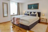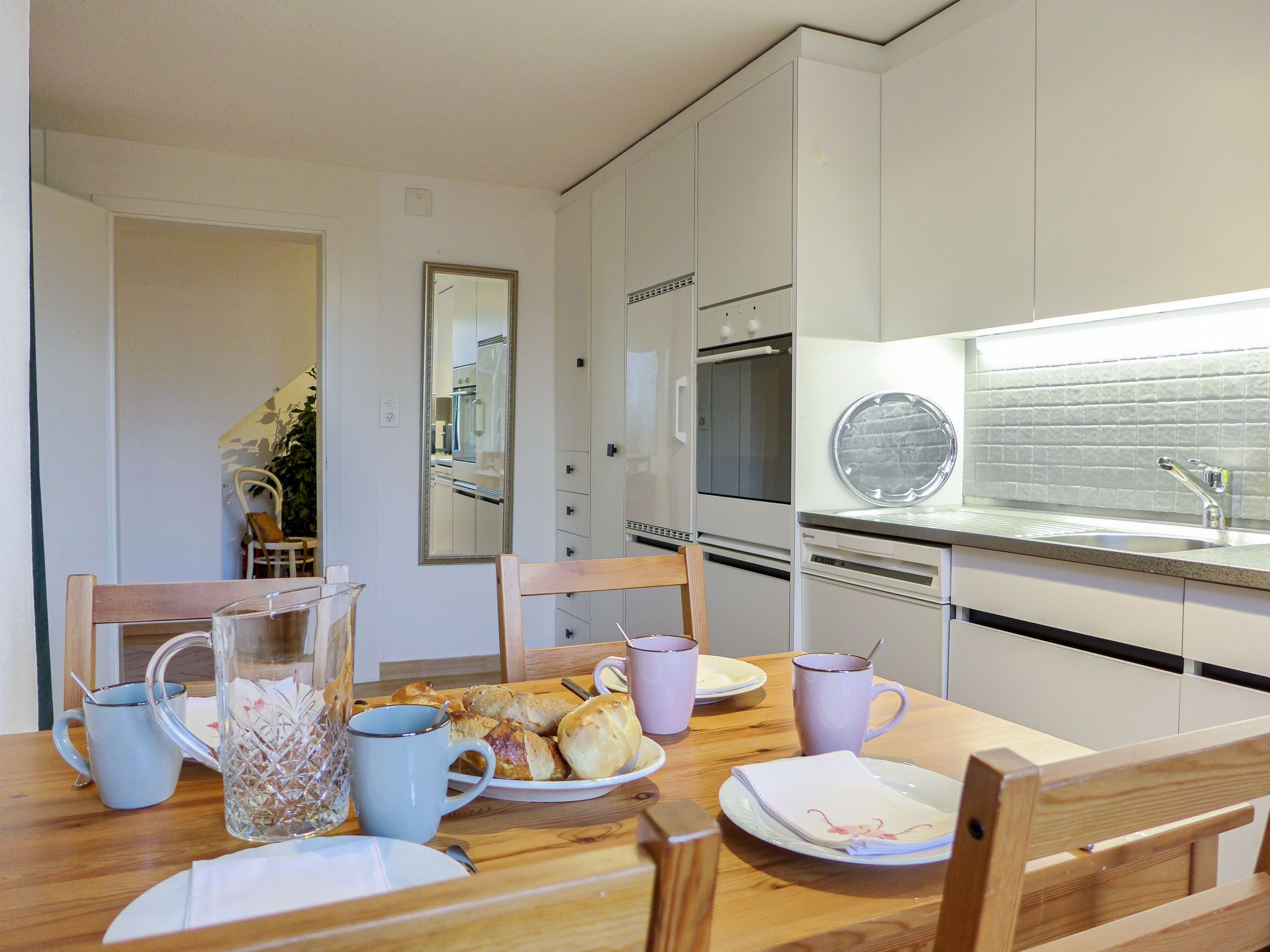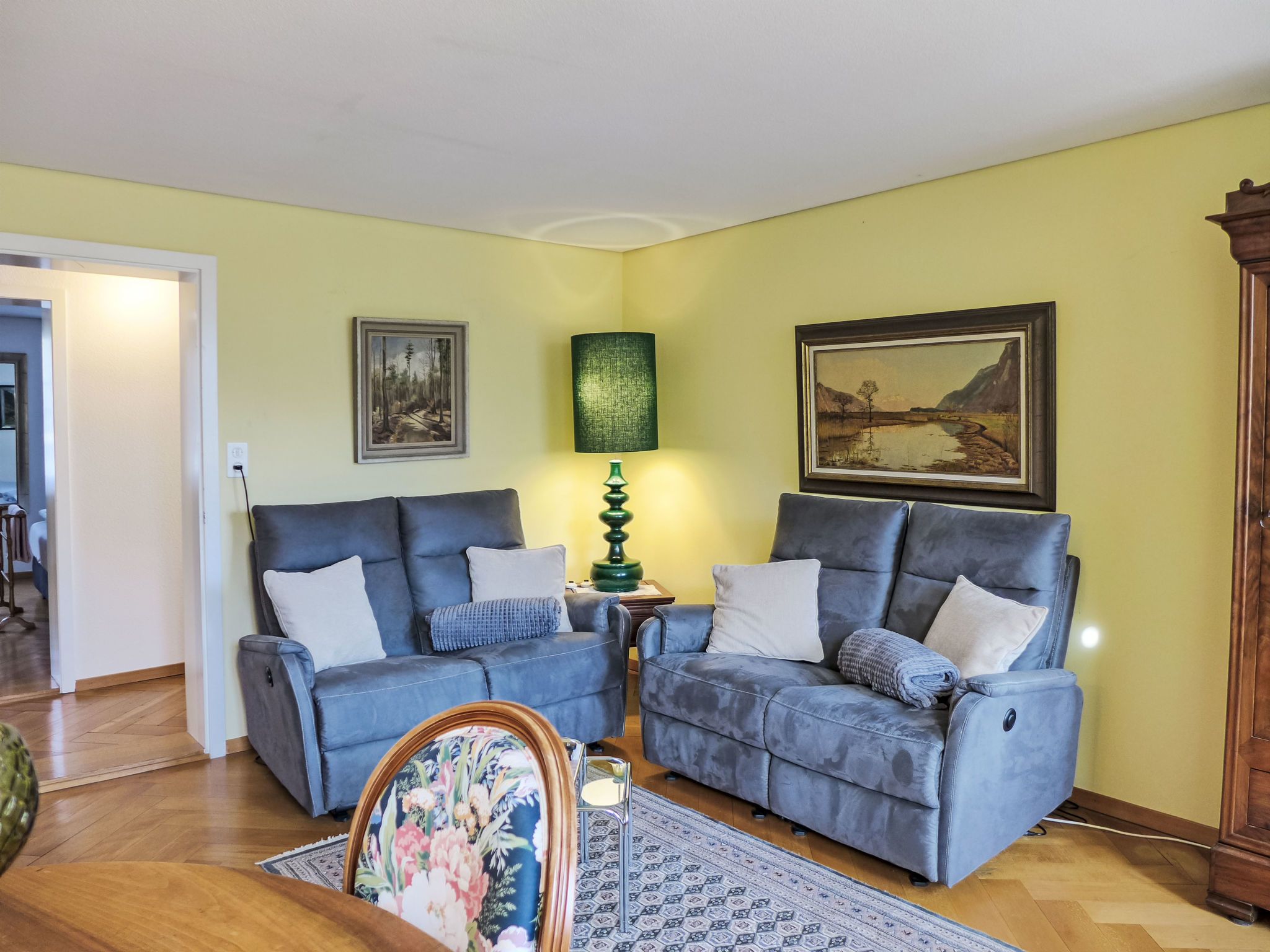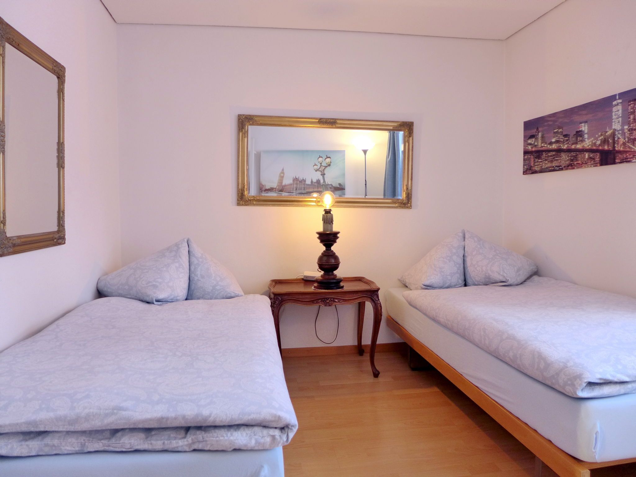 3-Zimmer-Wohnung 70 m2 im 1. Stock. Geräumig und hell, zweckmässig und gemütlich eingerichtet: grosses Wohn-/Esszimmer mit Esstisch und Kabel-TV. 1 kleines Zimmer mit 2 Betten (80 cm, Länge 190 cm). 1 grosses Zimmer mit 1 Doppelbett (160 cm, Länge 200 cm). Grosse Küche (3 Kochplatten, Backofen, Geschirrspüler, Toaster, Wasserkocher, Tiefkühler, elektrische Kaffeemaschine, Kapseln für die Kaffeemaschine (Delizio) extra, Racletteofen, Fondue Set (Käse)) mit kleinem Esstisch. Bad/WC. Holzdielenboden. Grosse Laube 16 m2, Ostlage und Südlage. Balkonmöbel. Sehr schöne Sicht auf die Berge, die Ortschaft und den Fluss. Zur Verfügung: Bügeleisen, Haartrockner. Internet (Wireless LAN, gratis). Parkplatz (1 Auto). Bitte beachten: Nichtraucher-Haus. Rauchmelder, Feuerlöscher.