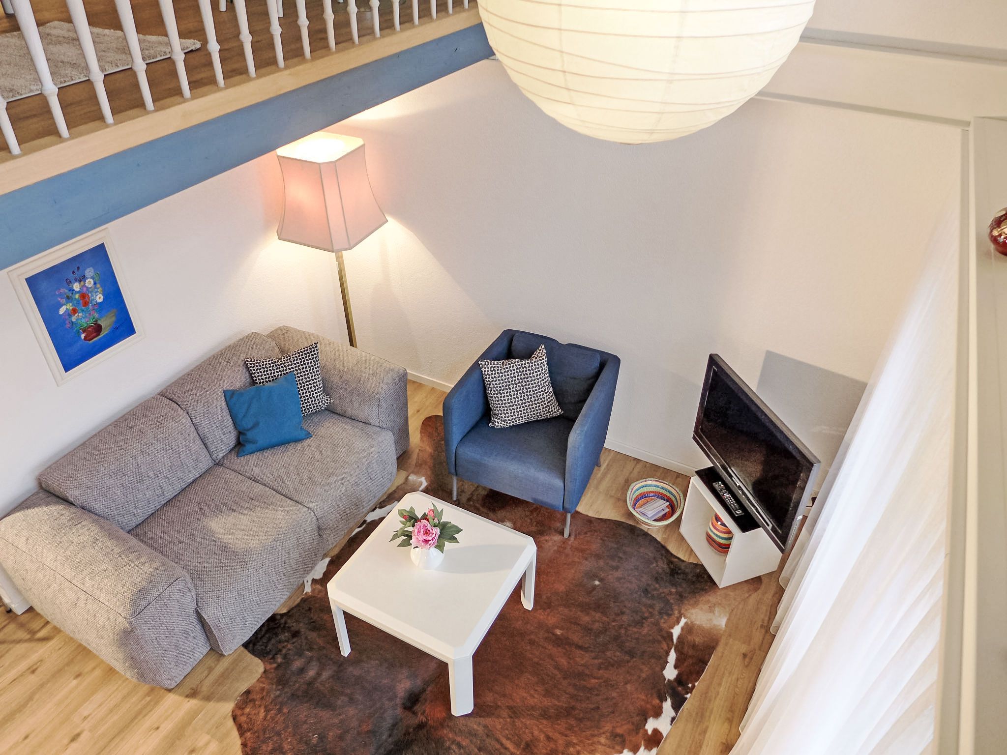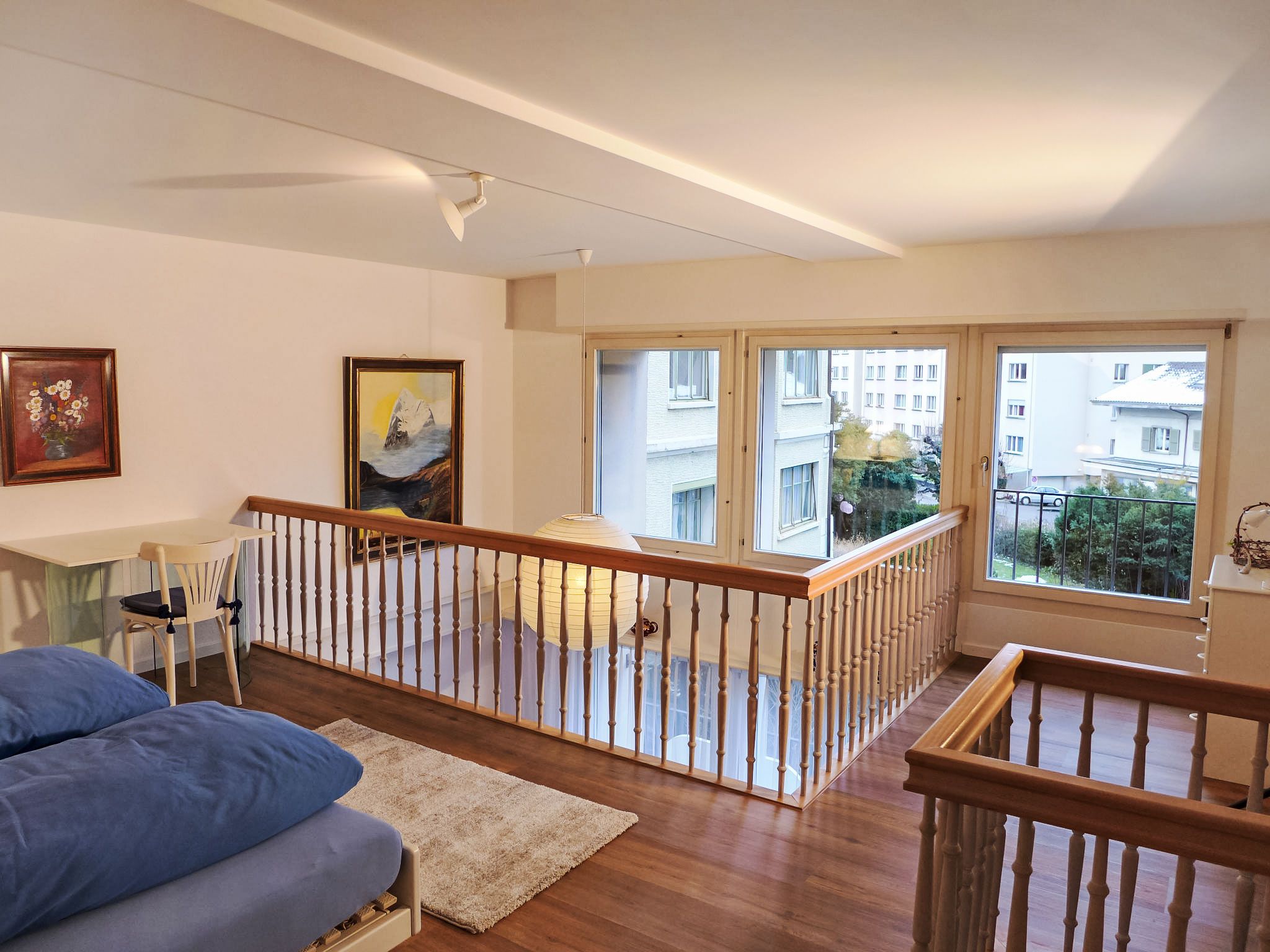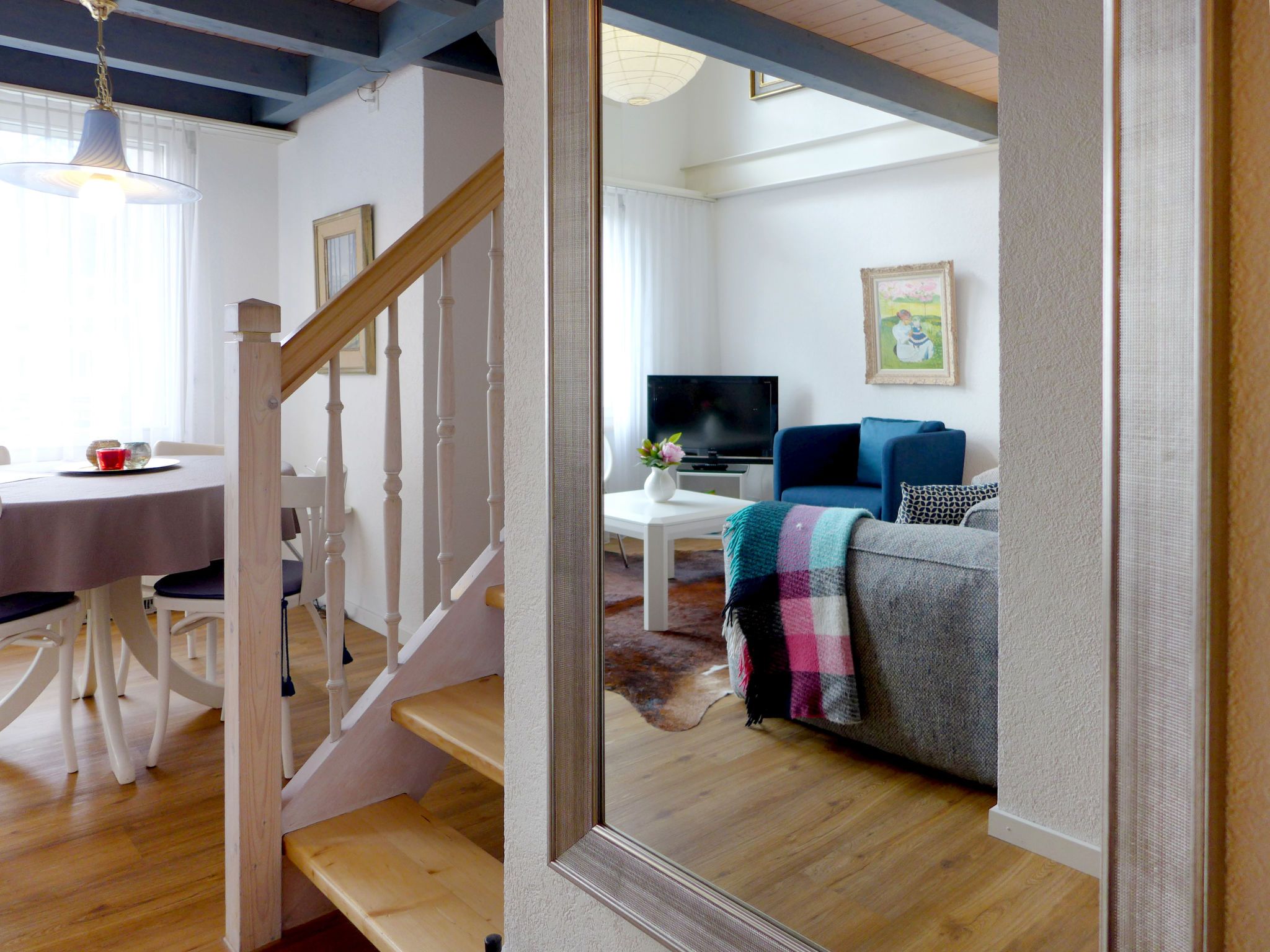 Galeriestudio Jungfraublick, 1-Zimmer-Studio 58 m2 auf 2 Stockwerken im 1. Stock, Südlage. Geräumig und hell, sehr komfortabel und geschmackvoll eingerichtet: offenes Wohn-/Esszimmer 17 m2 mit Panoramafenster mit Kabel-TV, Flachbildschirm, Radio, E-Heizung und elektrischem Rollladen. Ausgang zum Balkon. Küche 5 m2 (3 Kochplatten, Backofen, Geschirrspüler, Toaster, Wasserkocher, Mikrowelle, elektrische Kaffeemaschine, Kapseln für die Kaffeemaschine (Nespresso) extra). Bad/WC. Obergeschoss: (steile Treppe) grosse Galerie 23 m2 mit Panoramafenster mit 1 Doppelbett (2 x 90 cm, Länge 200 cm), TV, Kabel-TV und elektrischem Rollladen. Balkon 7 m2, Südlage. Balkonmöbel. Herrliche Sicht auf die Berge, die Ortschaft und auf die Jungfrau. Zur Verfügung: Bügeleisen, Haartrockner. Internet (Wireless LAN, gratis). Bitte beachten: für Kleinkinder nicht geeignet. Nichtraucher-Unterkunft, kein Parkplatz. Rauchmelder.