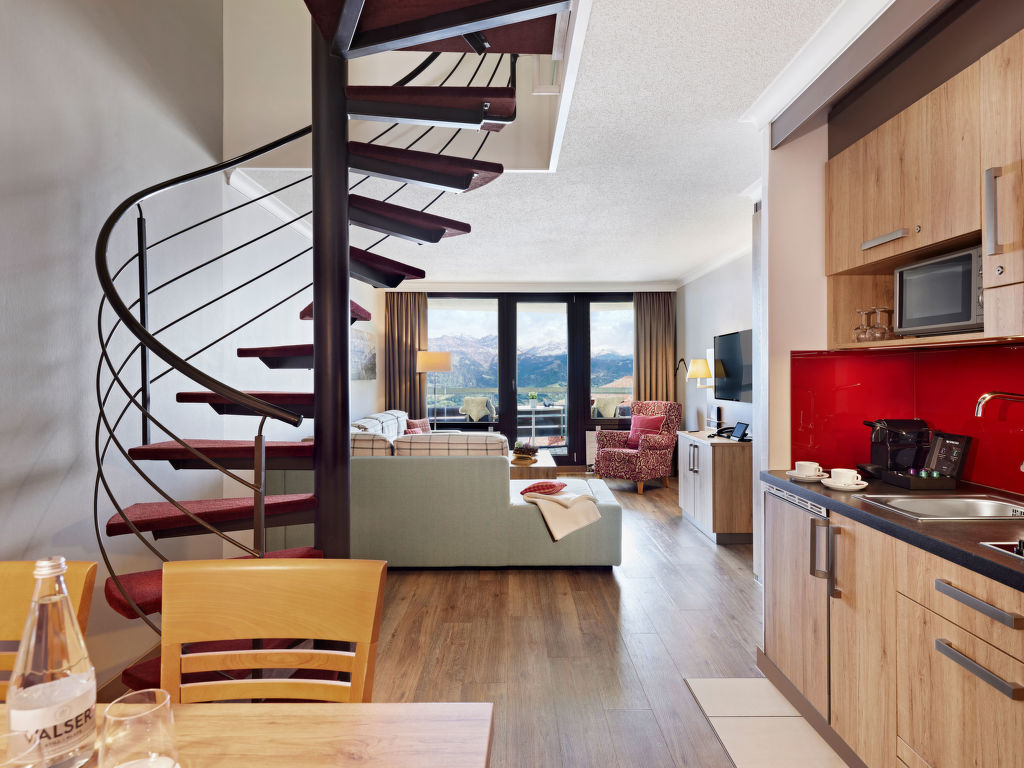 Komfort Maisonette, Dorint Blümlisalp, 2-Zimmer-Wohnung 56 m2 auf 2 Stockwerken. Wohn-/Esszimmer mit 2 Diwanbetten, Kabel-TV und Radio. 1 Zimmer mit 1 Doppelbett. Kochnische (2 Kochplatten, Geschirrspüler, Mikrowelle, elektrische Kaffeemaschine, Kapseln für die Kaffeemaschine (Nespresso) extra). Bad/WC. Balkon, Südlage. Sehr schöne Panoramasicht. Zur Verfügung: Telefon, Babybett bis 2 Jahre. Internet (WLAN, gratis). Maximal 1 Haustier/Hund erlaubt.