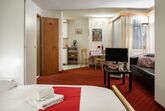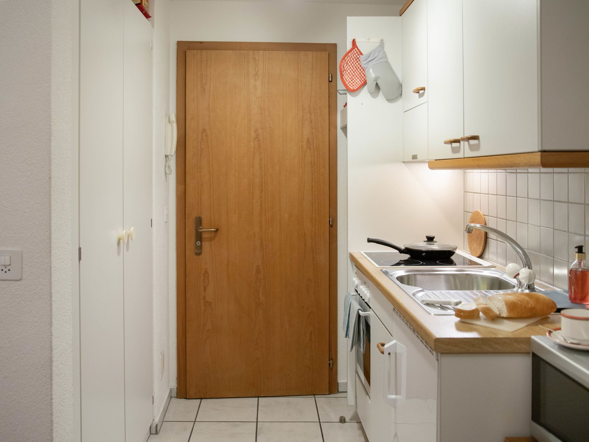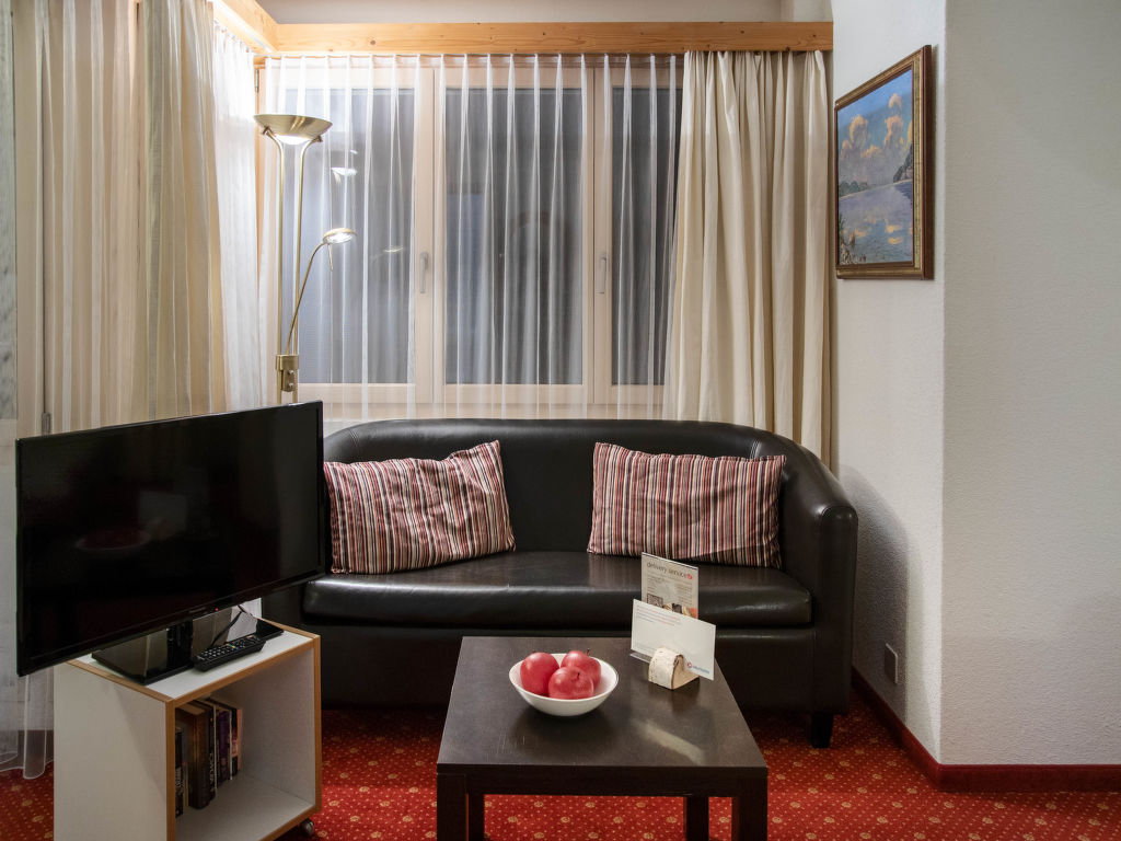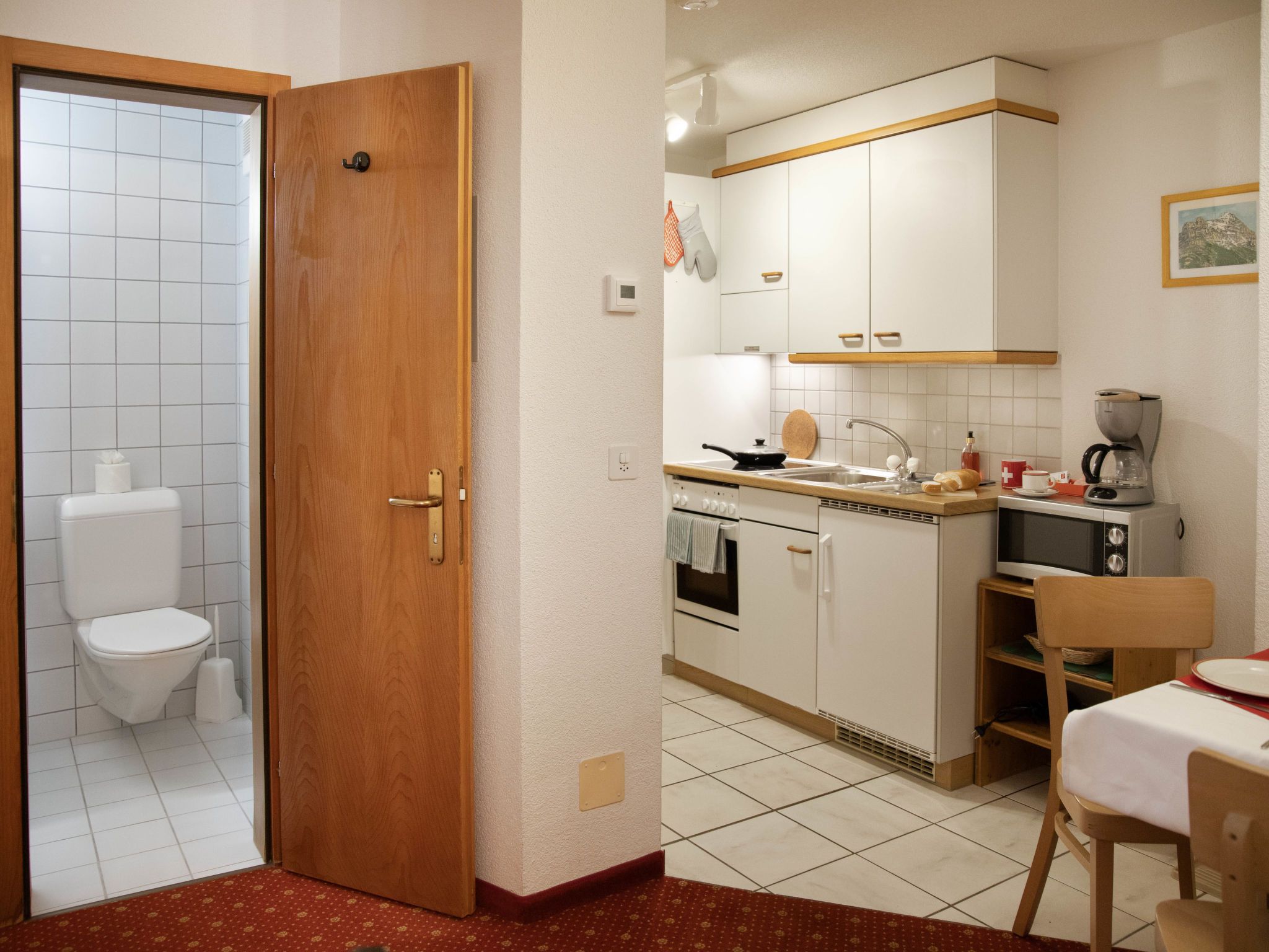 1-Zimmer-Wohnung 29 m2 im 4. Stock. Wohn-/Schlafzimmer mit 2 Betten und Kabel-TV (Flachbildschirm). Offene Küche (Backofen, 4 Glaskeramikplatten, Toaster, Wasserkocher, elektrische Kaffeemaschine) mit Esstisch. Dusche/WC. Sicht auf die Berge und Eiger. Zur Verfügung: Haartrockner. Internet (Wireless LAN, gratis). Bitte beachten: Nichtraucher-Unterkunft. Maximal 1 Haustier/Hund erlaubt. Ein Fondue Set (Fleisch oder Käse) sowie ein Raclette Ofen kann an der Rezeption ausgeliehen werden. Kein Balkon.